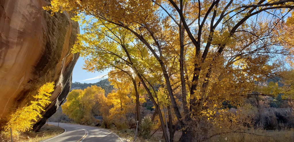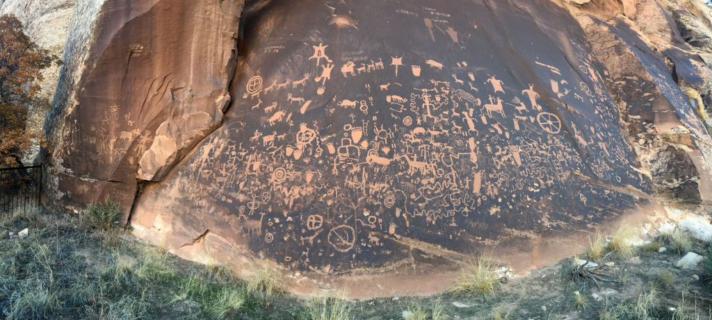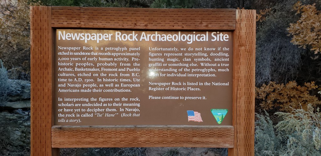 The next morning, we got an early start for a long day of driving and sightseeing. Our first stop was Newspaper Rock, a historic site known for its ancient petroglyphs. As we made our way down the winding roads, we couldn’t help but admire the vibrant fall colors that surrounded us. The trees were bursting with hues of yellow and orange, painting the landscape in a way that only autumn can. It was the perfect backdrop as we drove toward Newspaper Rock, both of us eager to see what the day had in store.