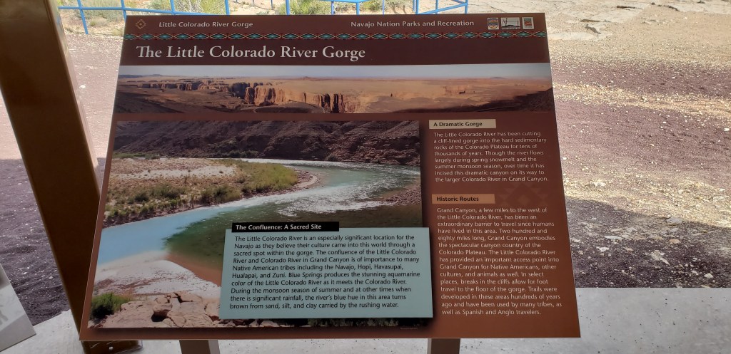Our next destination was the Little Colorado River Navajo Tribal Park in Arizona. As they say, “Always take the scenic route,” and that’s exactly what Bill and I did. Before reaching the Grand Canyon’s South Rim from the east, we made a stop at the Little Colorado River Gorge Overlook. Situated within the borders of the Navajo Nation, the largest Native American reservation, this overlook offered us a spectacular view of the Little Colorado River.