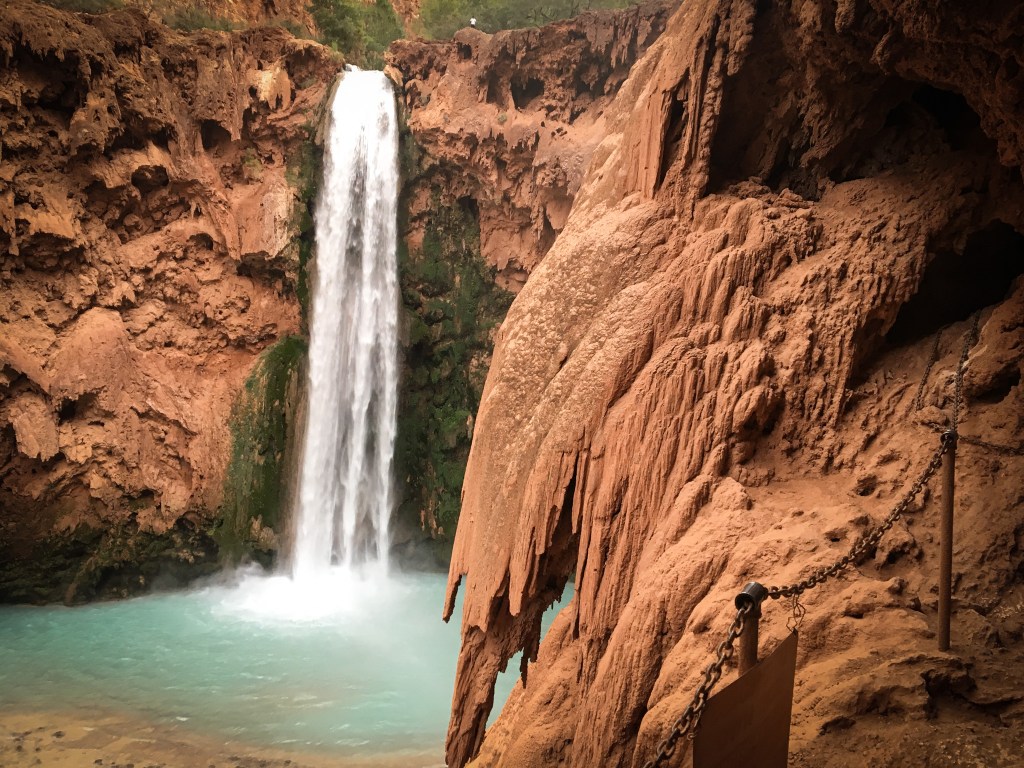 Standing just under 200 feet tall, Mooney Falls is the largest waterfall in Havasupai. About a mile from Havasu Falls, it echoes through the canyon, with the sound of rushing water reverberating off the towering limestone walls. Accessing Mooney Falls requires a steep and adventurous descent through tunnels and chains carved into the rock, making the experience even more thrilling.