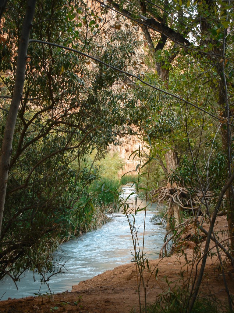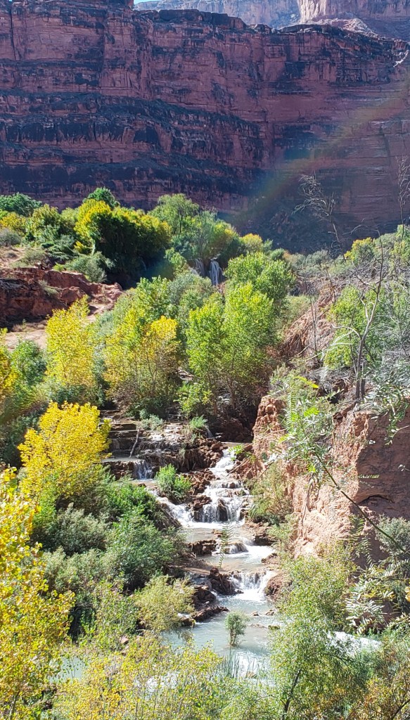 After soaking in the peaceful surroundings, we wandered along Havasu Creek, taking in the breathtaking beauty around us. Havasu Creek, a stunning tributary of the Colorado River, flows through Havasu Canyon, which forms part of the Grand Canyon in Arizona. Known for its brilliant turquoise-blue water, the creek’s vivid hue comes from natural springs rich in calcium carbonate. This mineral not only gives the water its distinctive color but also creates natural dams and pools that enhance the area’s beauty.
