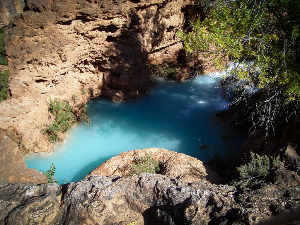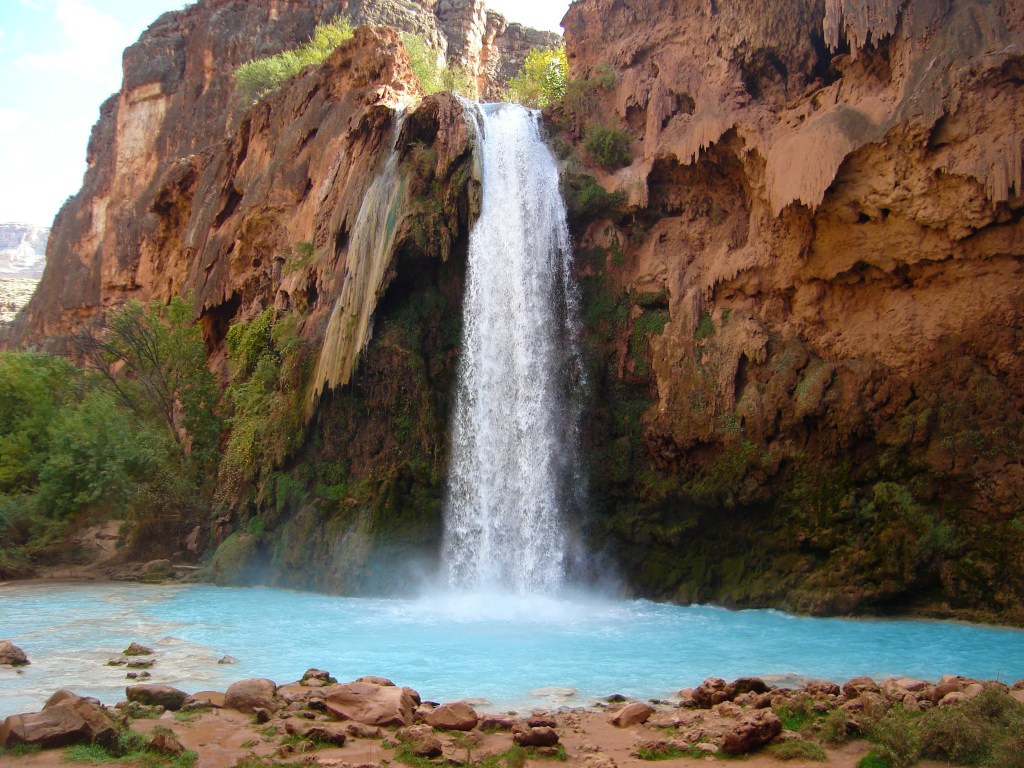 The most iconic of all the waterfalls, Havasu Falls plunges about 100 feet into a wide pool of stunning blue-green water. Located just a short distance from the campground, it’s the third waterfall you encounter during the hike into Havasupai. Surrounded by red rock cliffs and greenery, Havasu Falls is the most photographed and well-known spot in the canyon.