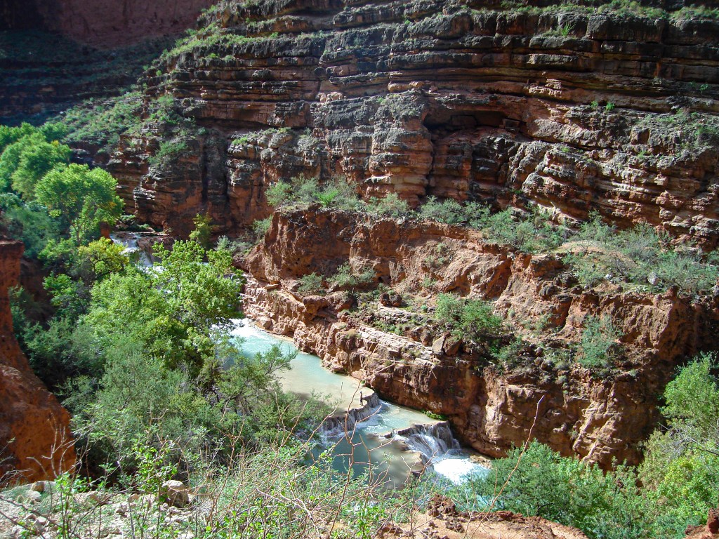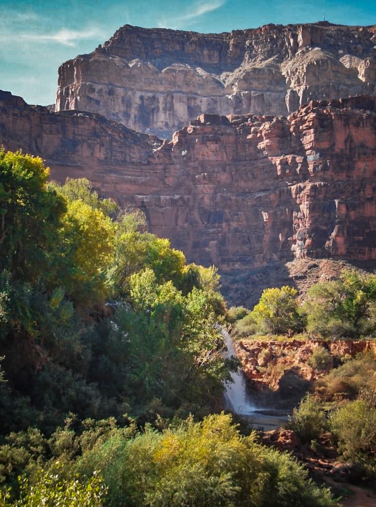 Havasu Creek begins near the Supai village, home to the Havasupai people, and flows through a series of cascading waterfalls and deep plunge pools. The creek cuts through striking red rock cliffs and is surrounded by a lush riparian zone, where cottonwoods, willows, and wild grapes thrive. The striking contrast between the creek’s turquoise waters, the canyon’s red rock walls, and the vibrant greenery makes it one of the most visually stunning places in the Grand Canyon region.