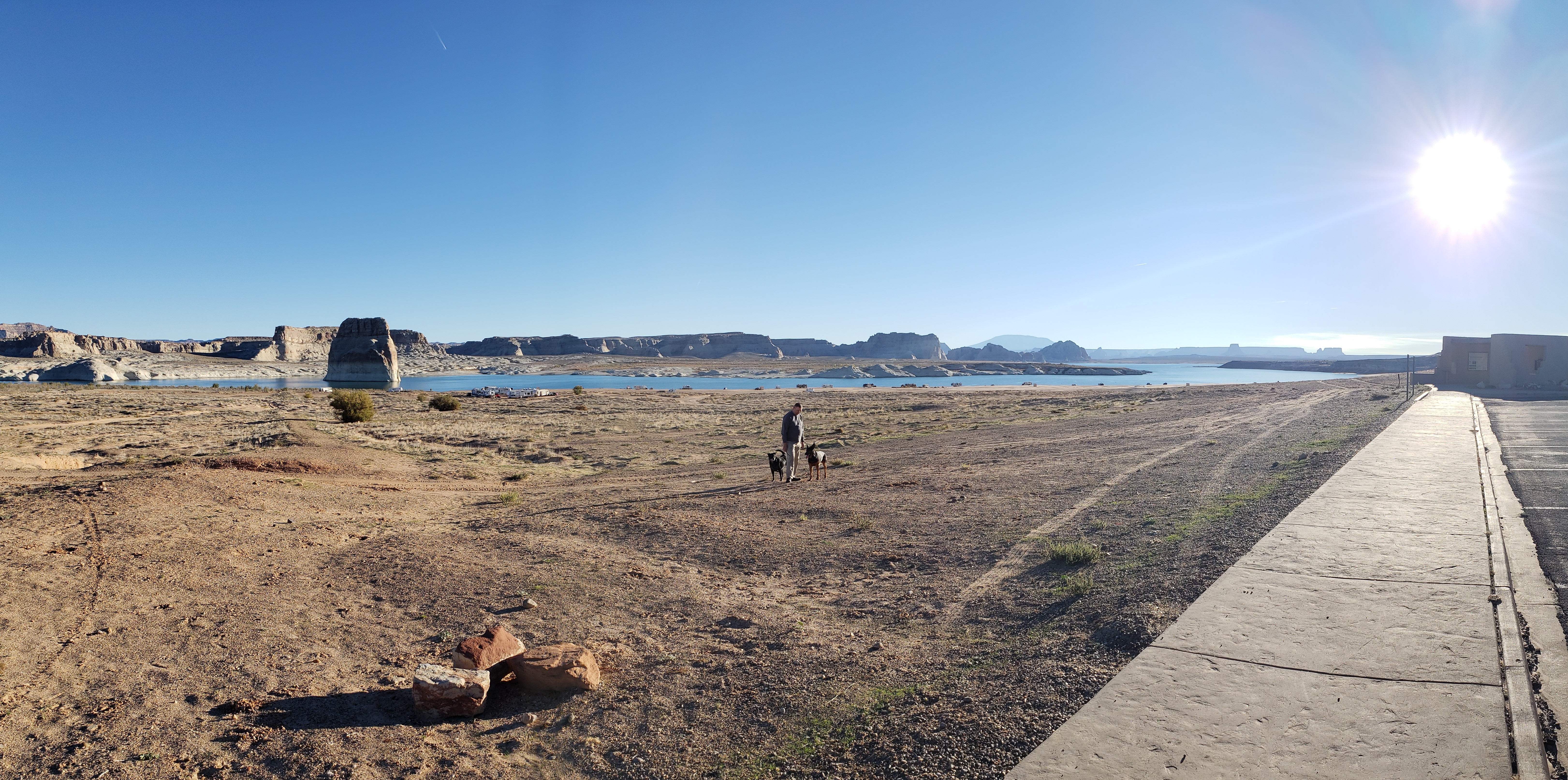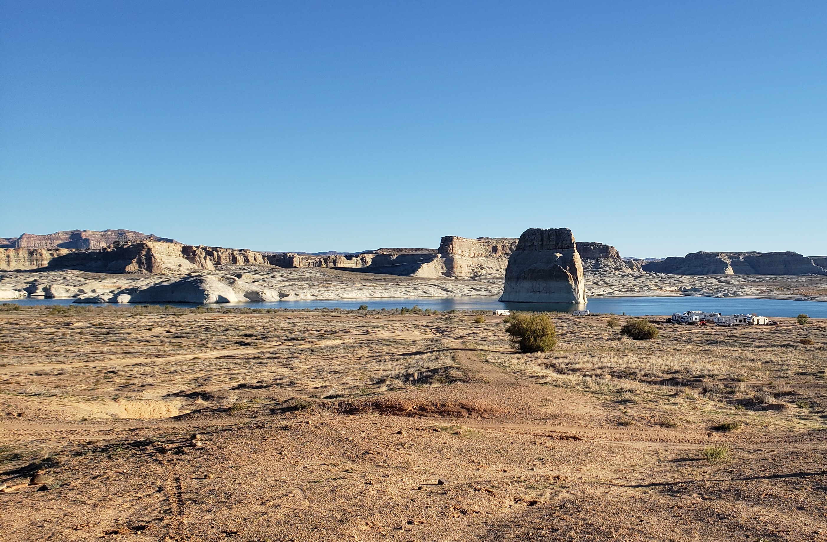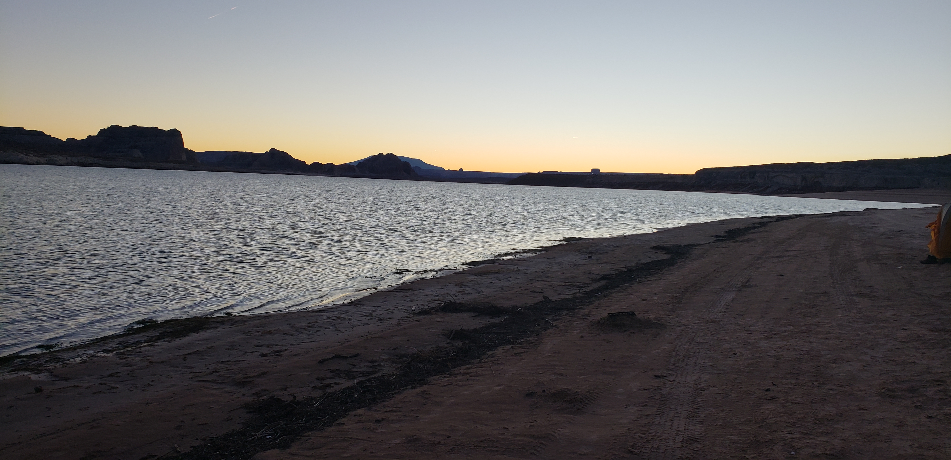 Continuing our journey back to Utah, we arrived at Lone Rock Beach just in time to set up camp for the night. The sight of Lone Rock dramatically jutting out of Lake Powell was absolutely stunning. We set up our camp directly on the beach, with the tranquil waters and striking red rock formations providing a picturesque backdrop. As evening fell, we savored a BBQ dinner of fish and steak while watching the transition from dusk to darkness, which enveloped us in a serene and tranquil atmosphere.