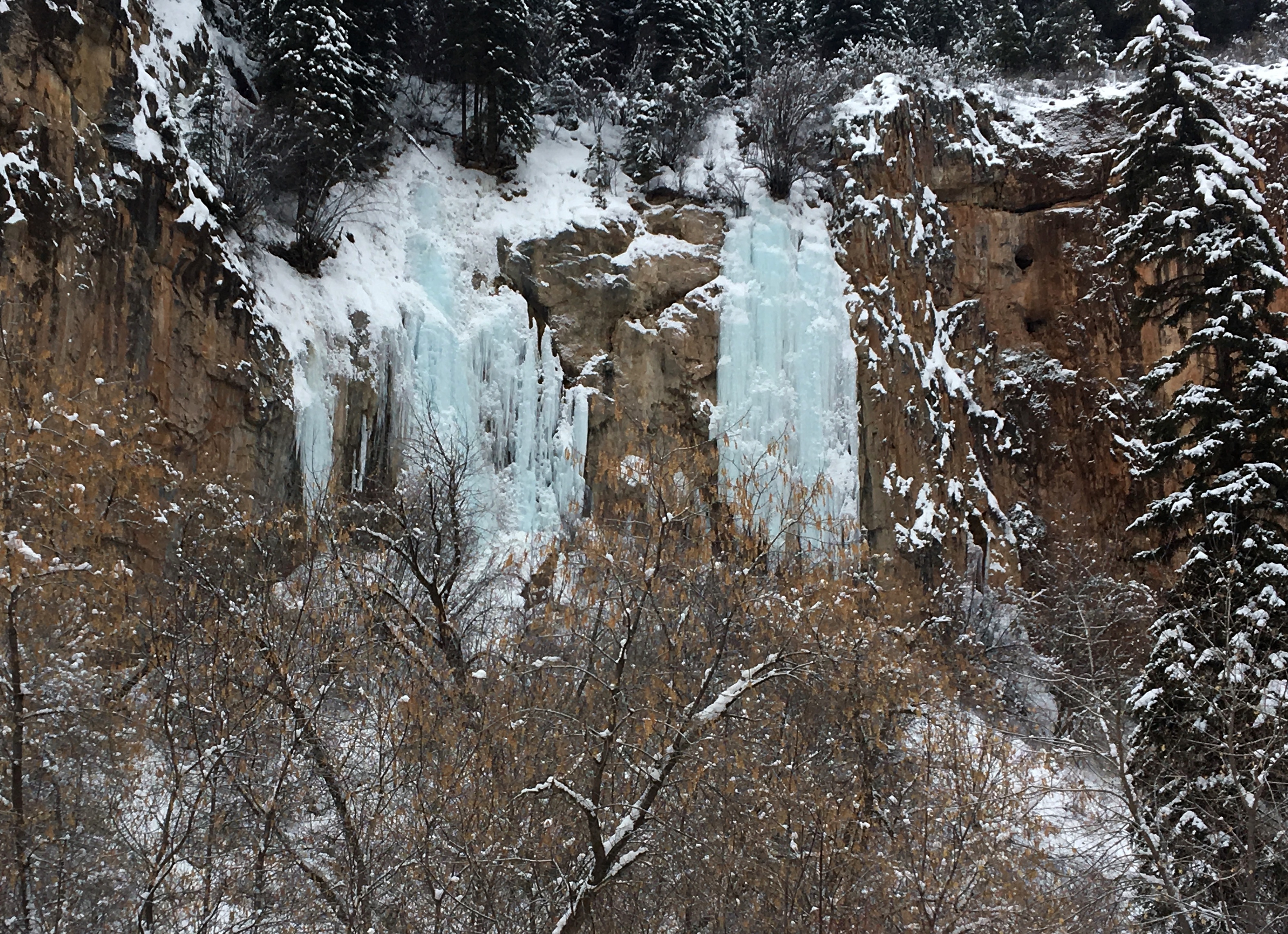 Rifle Mountain Park in the winter is a scene from a snow-dusted dream. The narrow road in winds through towering red and gold limestone walls dusted with fresh powder. Rifle Creek snakes through the canyon, still flowing despite the cold, with mossy rocks and grasses poking through its icy edges.