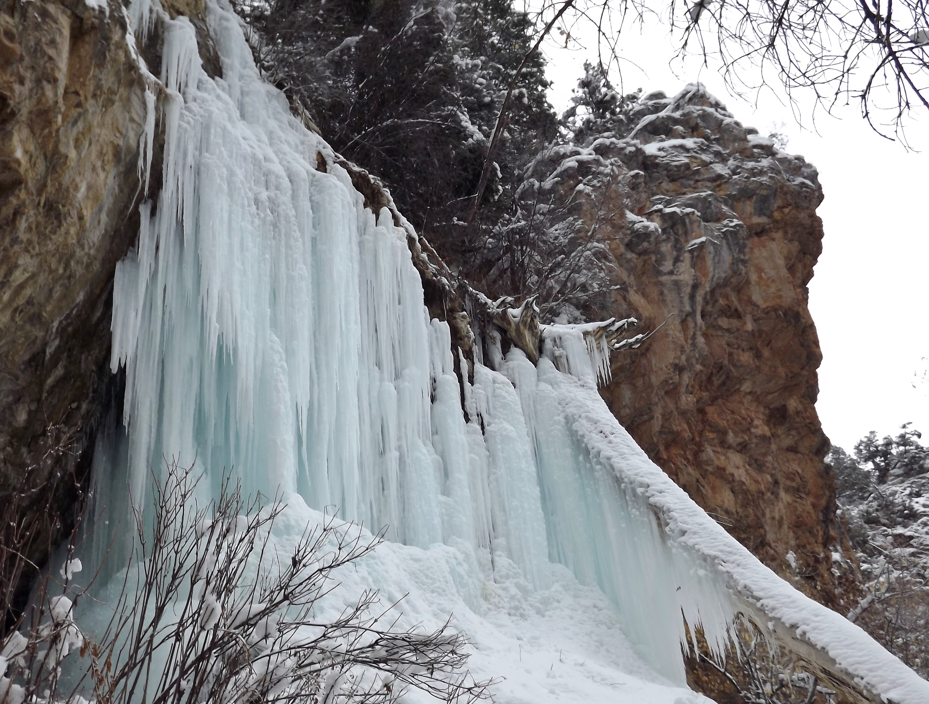 This place, famous in the summer for rock climbing, becomes something altogether different in the winter. The vertical cliffs, rugged and bold, are now wrapped in veils of icicles and dripping curtains of frozen water.