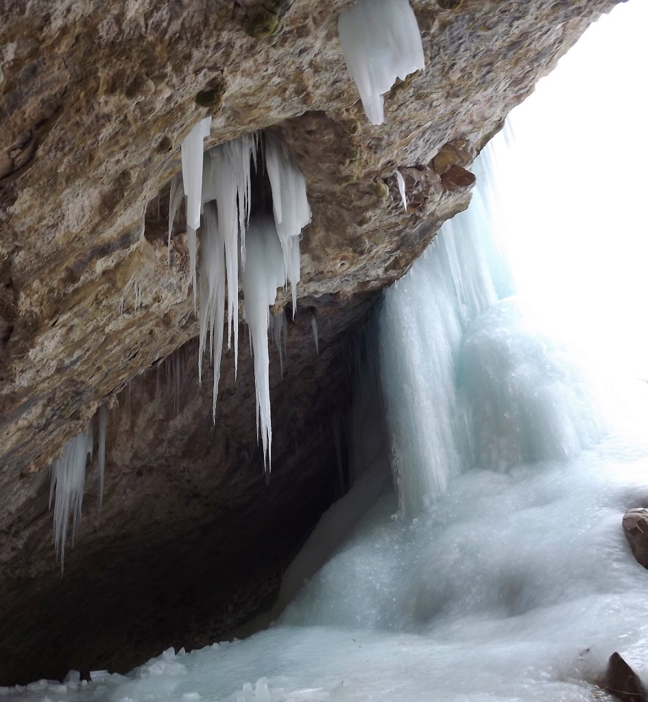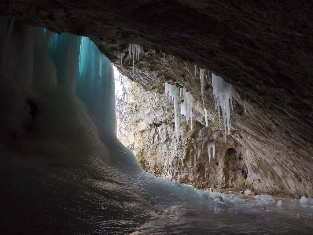 It was like walking into a frozen palace. We wandered carefully across the icy floor, pausing to marvel at every turn — the glint of sunlight on the ice, the trickle of water still moving beneath a glassy surface, the way the ice lit up the walls with a pale winter glow.