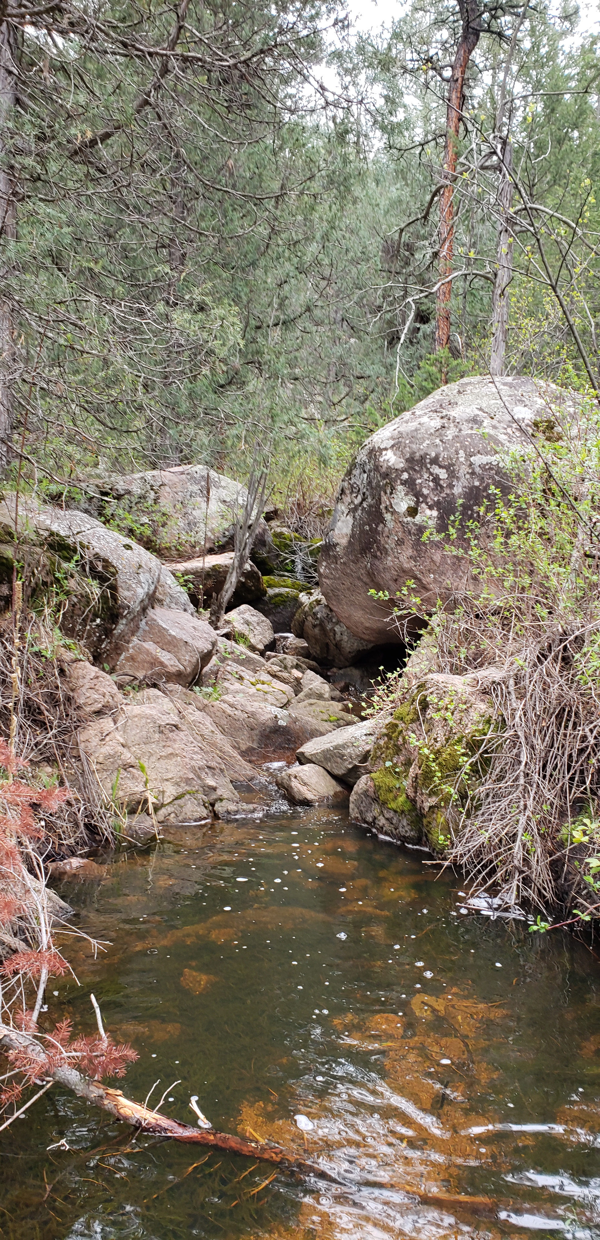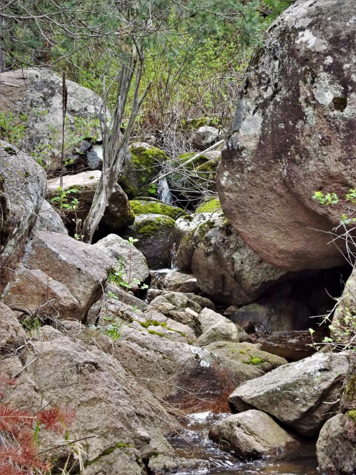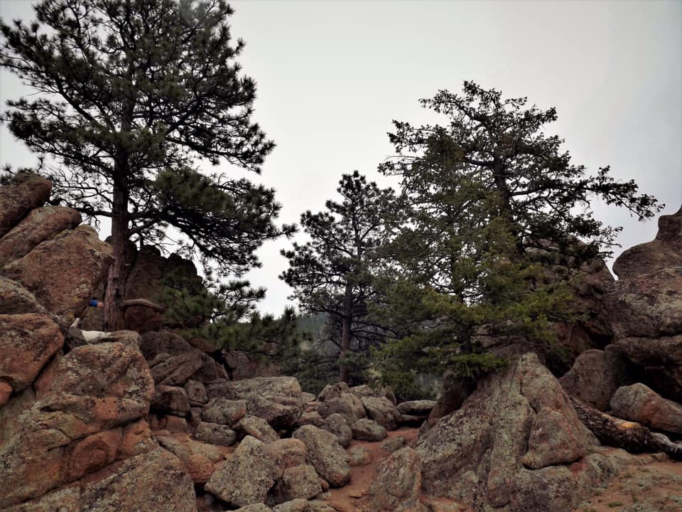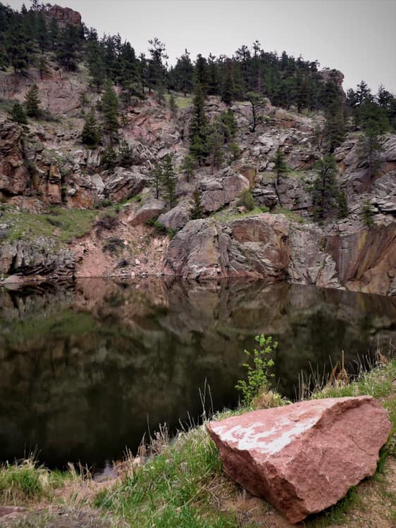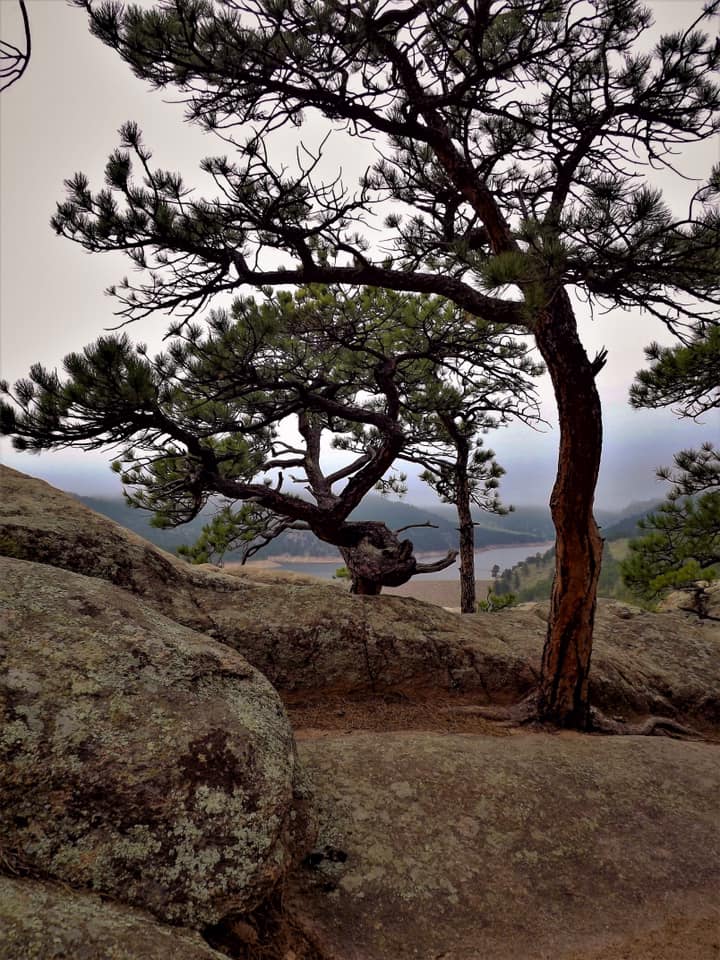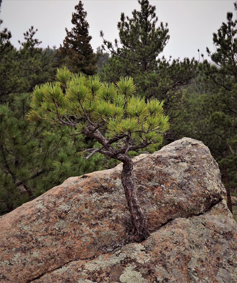 Along the way, we encountered several streams and small ponds, including one particularly picturesque pond that reflected the rugged cliffs above, creating a perfect mirror image of the towering rock formations. These water features added to the trail’s tranquil atmosphere. One of the most fascinating sights was a tenacious little pine tree growing straight out of a massive boulder. Twisted and weathered by time, it stood resiliently against the elements—a perfect symbol of nature’s perseverance. It was an unexpected reminder of the raw beauty found in Colorado’s wilderness.