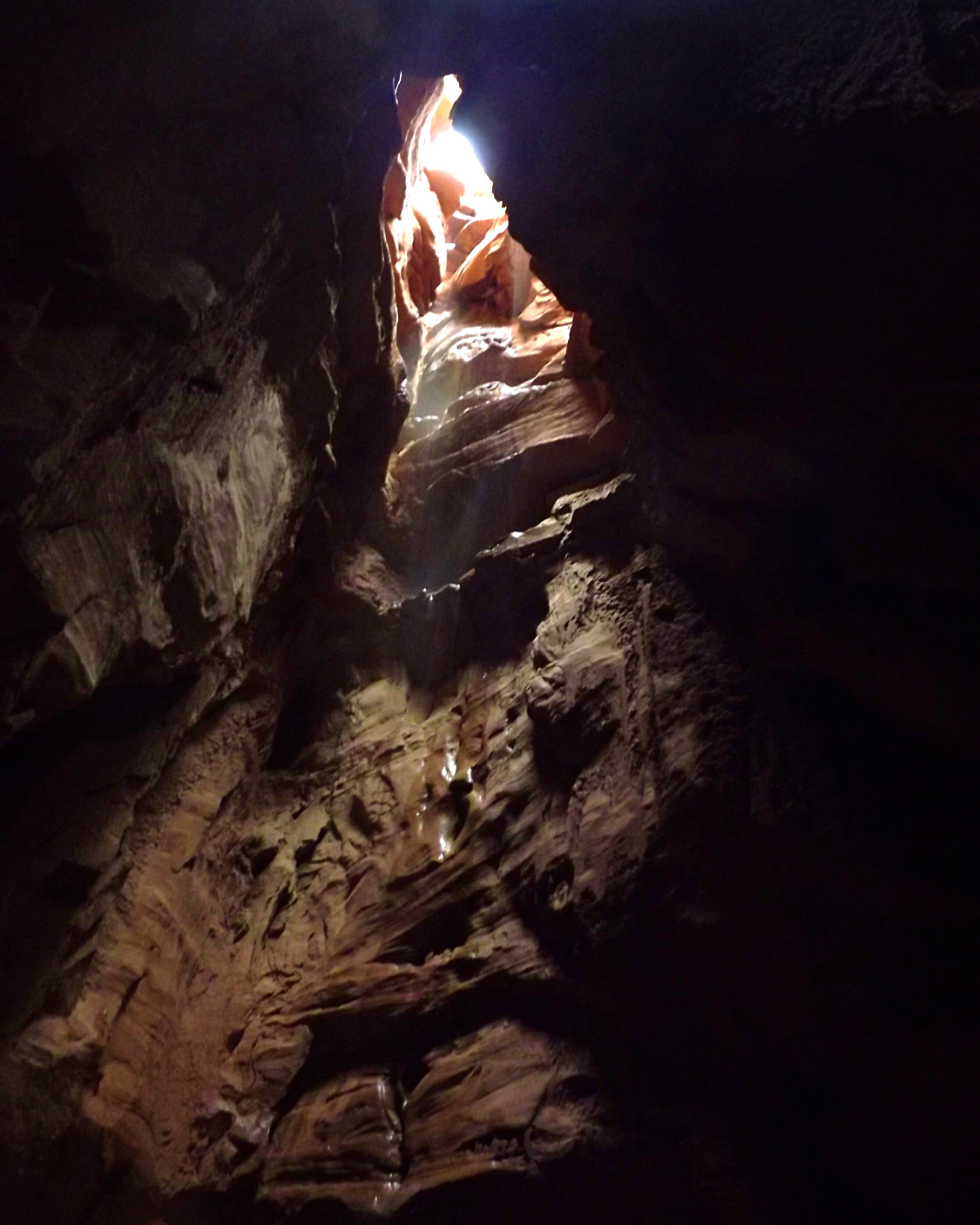 Inside, the cavern opened up before us—a massive chamber with towering sandstone walls. More than 100 feet above, holes in the ceiling funneled in the rain, creating thin silver waterfalls that disappeared into the sandy floor. The sound of water dripping and echoing through the chamber was mesmerizing.