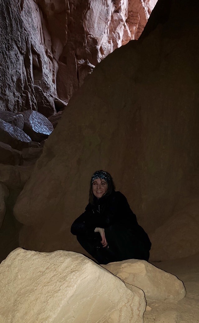 The 3.5-mile out-and-back trail to Goblin’s Lair led us through Carmel Canyon, past sweeping views of Molly’s Castle, and up a series of loose scree slopes. Scrambling over boulders, we finally reached the entrance—just as the weather took a turn.
