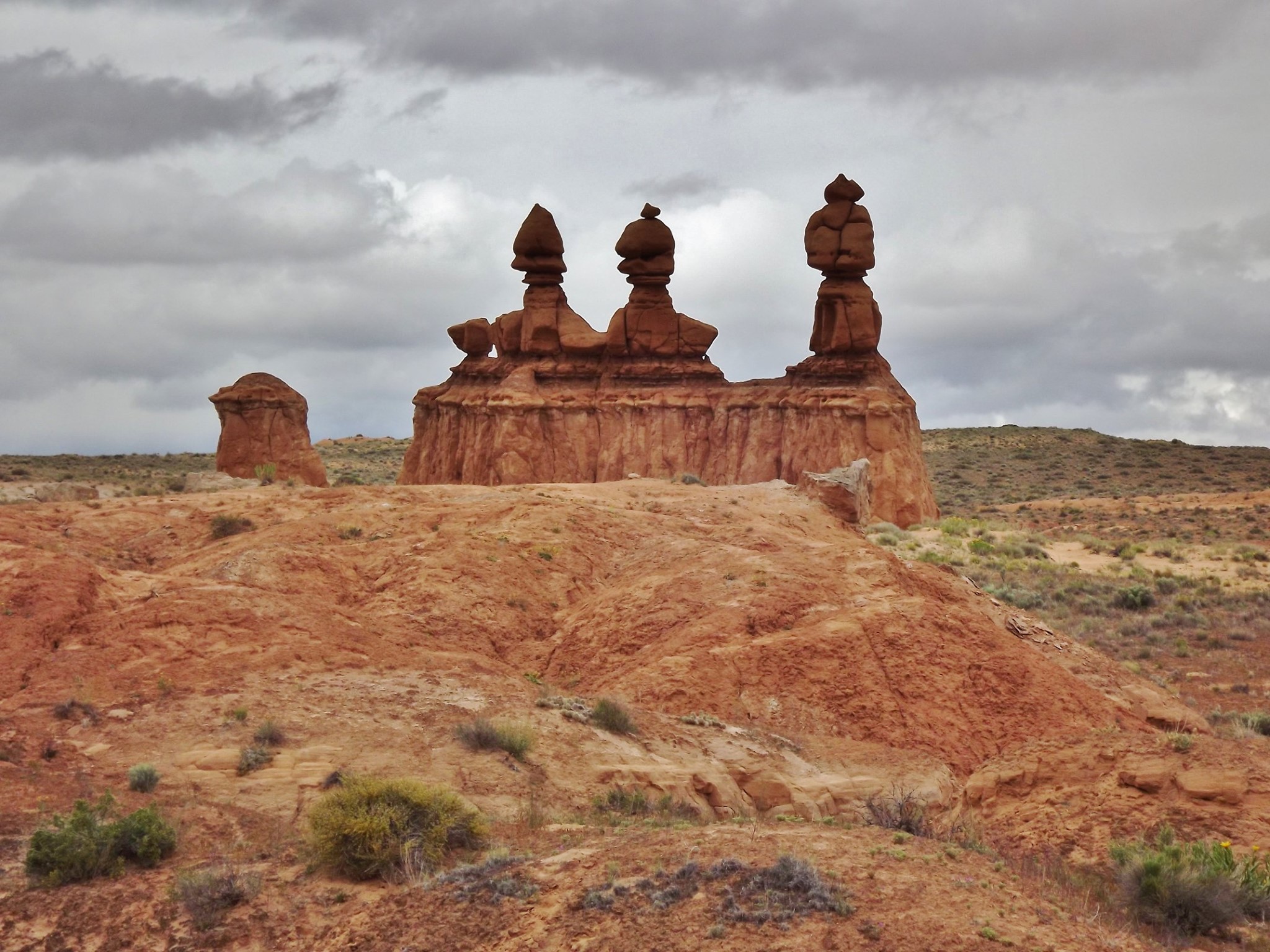 Goblin Valley is a place shaped by wind, water, and time. Thousands of squat, mushroom-like hoodoos—resembling goblins frozen mid-dance—dot the valley floor. The park’s most recognizable formation, the Three Sisters, stood like ancient sentinels near the roadside, their towering shapes stark against the sky.