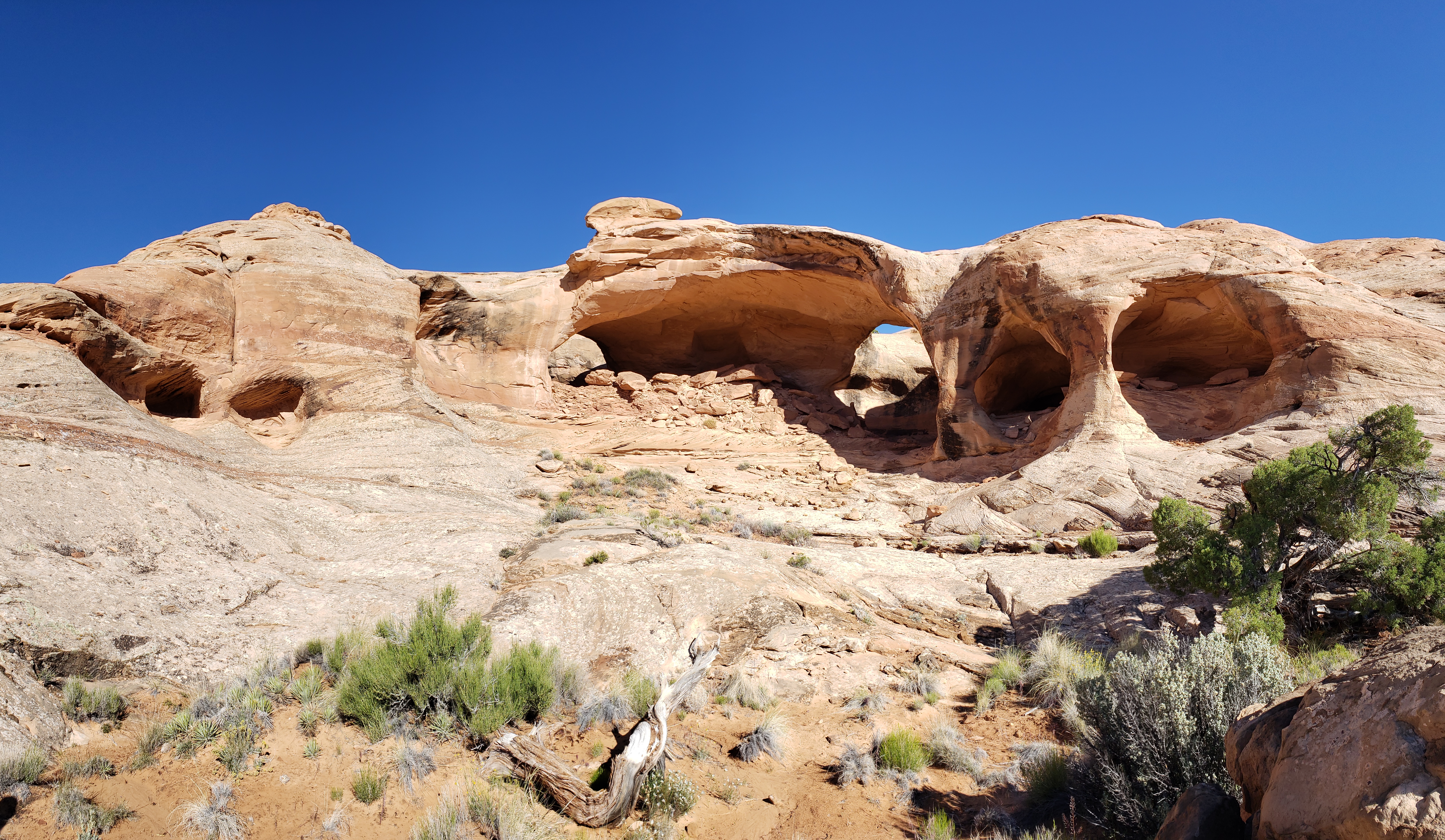 The morning greeted us with a spectacular sunrise over Labyrinth Canyon, painting the desert in hues of pink and orange. We packed up camp and set out for Colonnade Arch (Five Hole Arch), a remote gem in the San Rafael Desert.