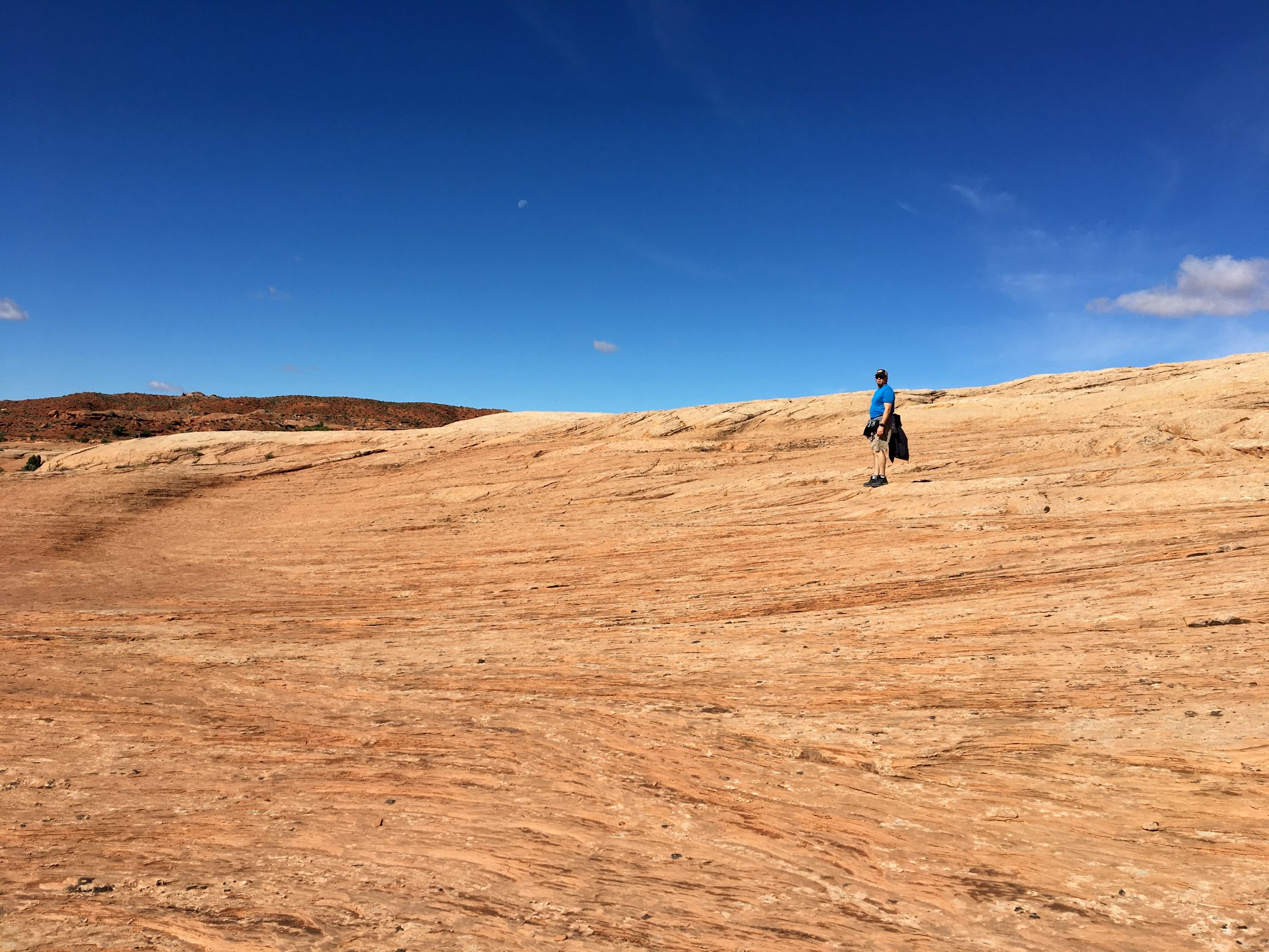 The hike to Colonnade Arch is as wild as the landscape itself—no signs, no trail markers, just open desert stretching toward the horizon. Following faint paths across Keg Knoll, we made our way toward the high sandstone rim overlooking Two Mile Canyon and the Green River.