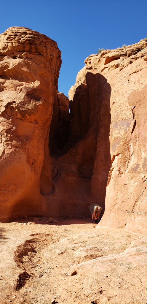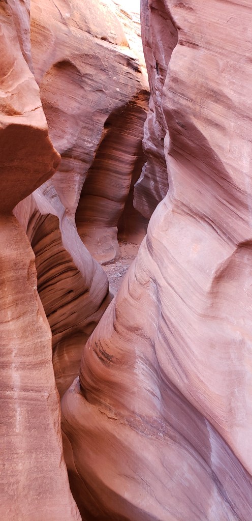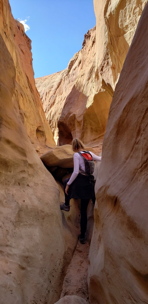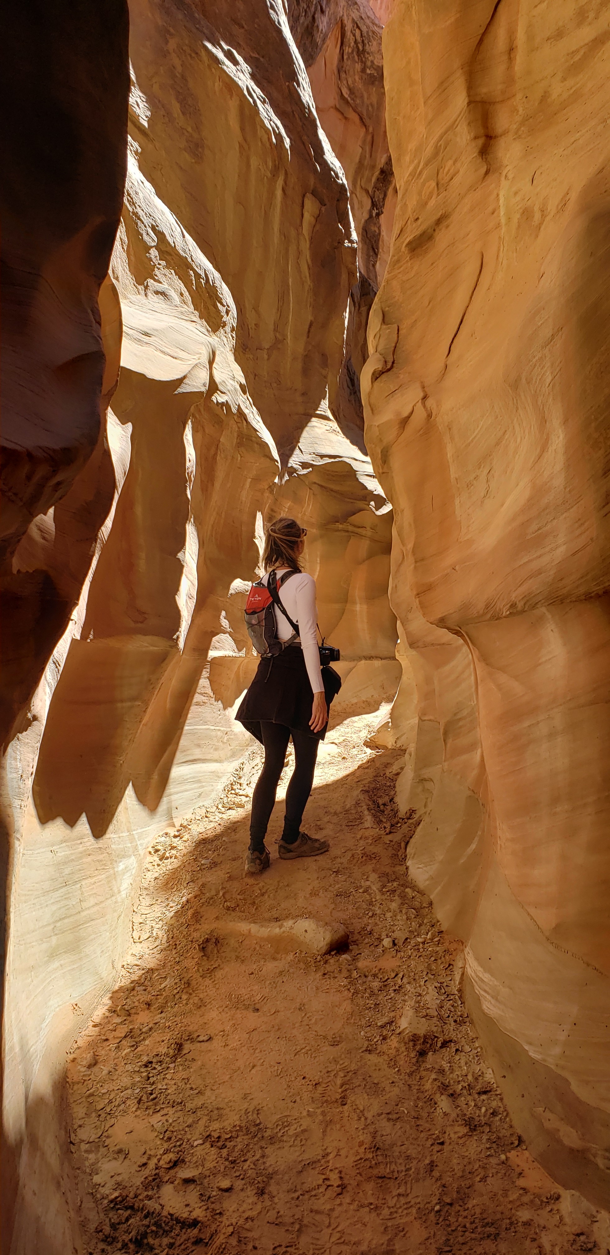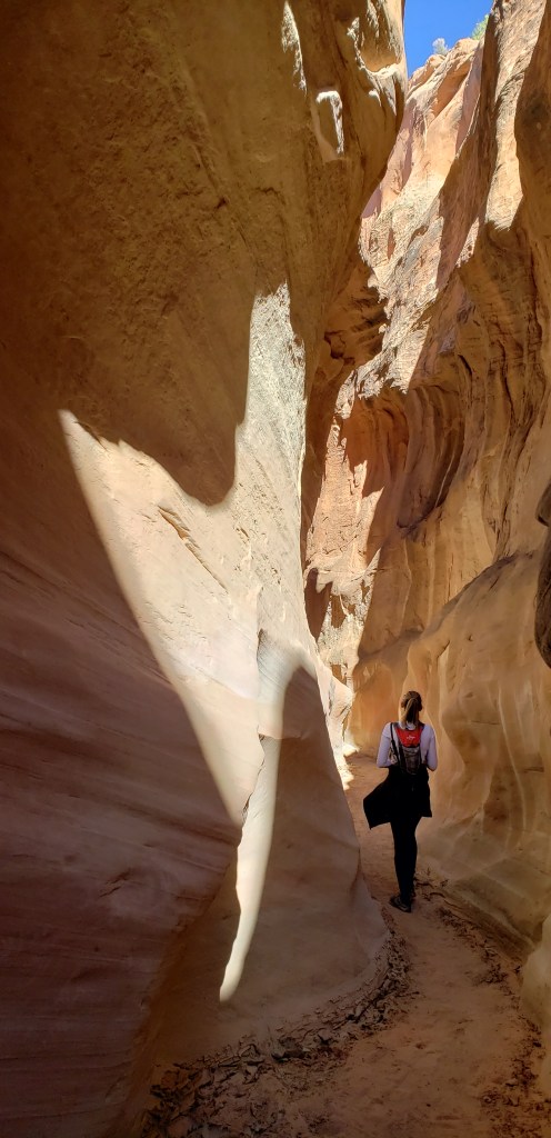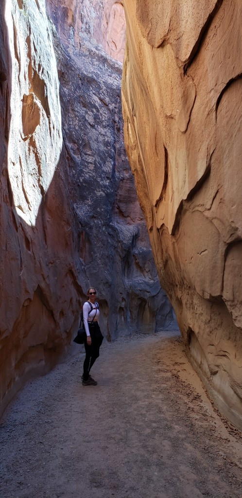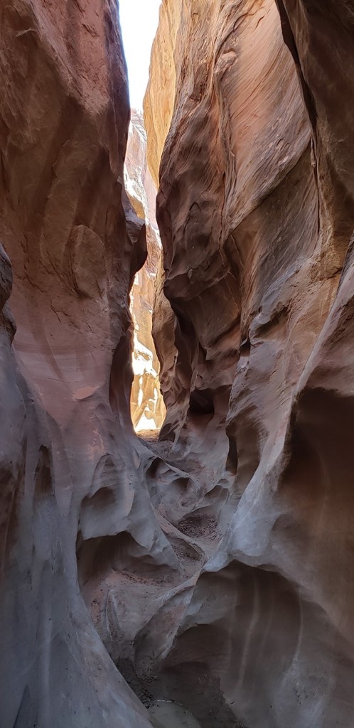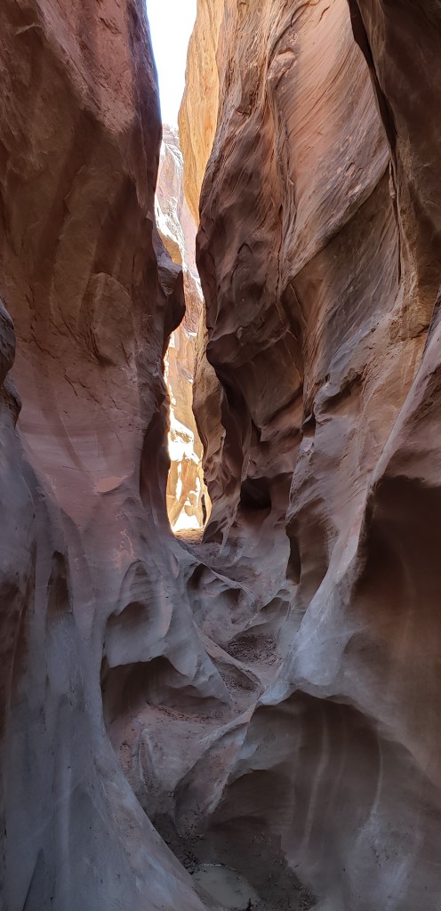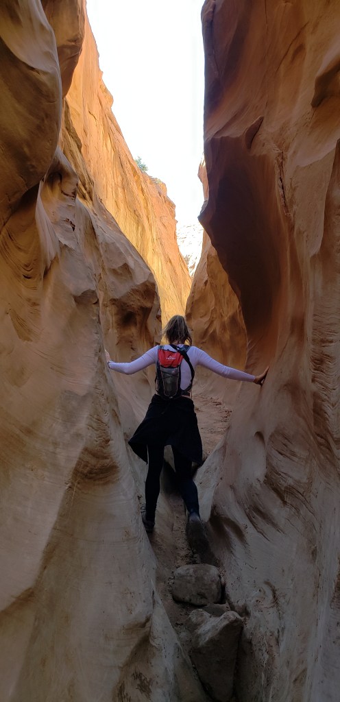 - Spooky Slot Canyon was exactly as its name suggested—dark, eerie, and impossibly narrow. At its tightest point, the passage shrunk to just 15 inches wide, forcing us to sidestep and squeeze our way through. It was 30 feet deep, and in some sections, the light barely reached the canyon floor. Definitely not for the claustrophobic! I found it really helpful to have a headlamp here—there were a couple of spots where it got unexpectedly dark, and having that extra light made navigating much easier.