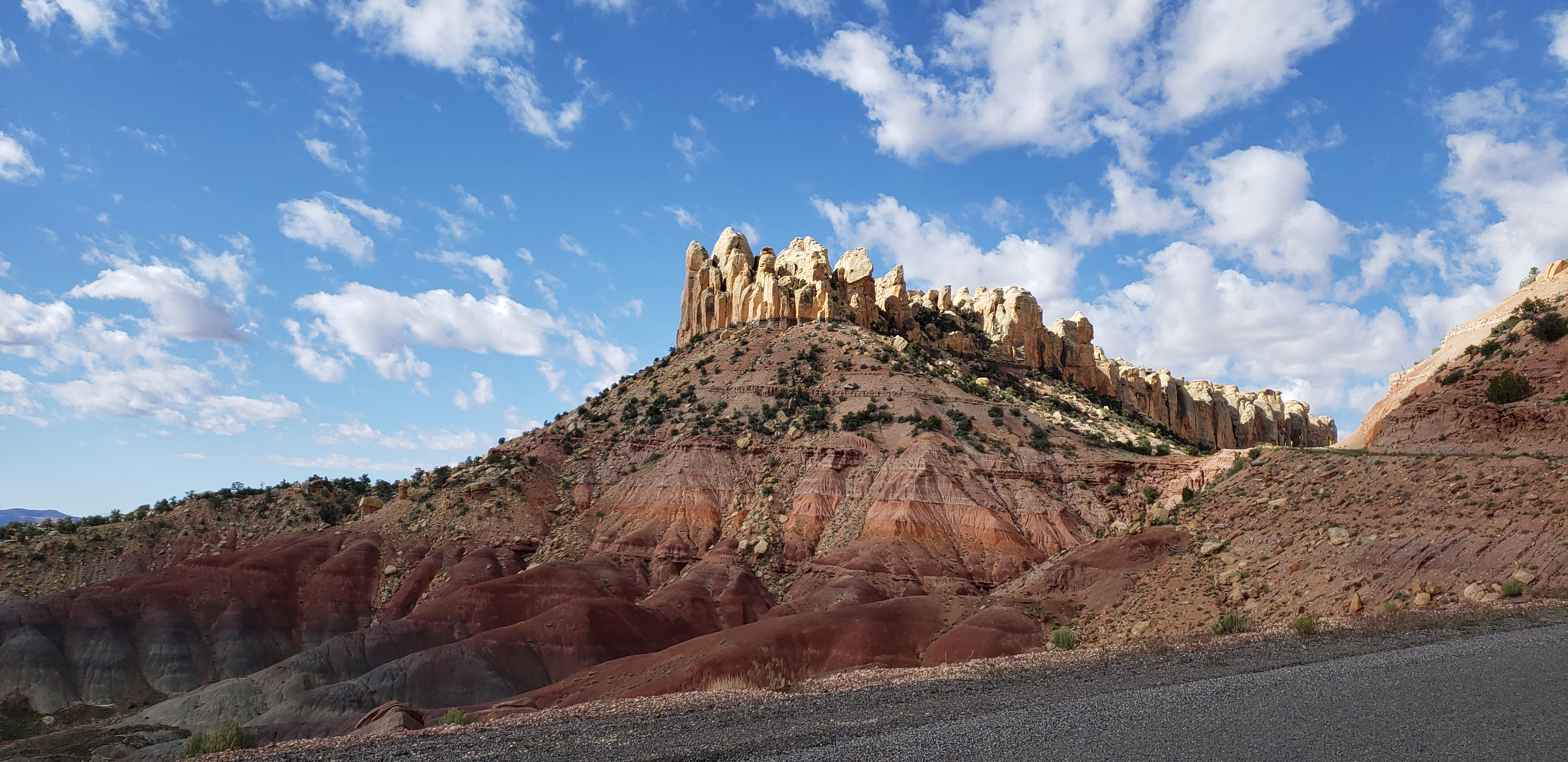 This remote road wound through the Circle Cliffs, Long Canyon, and The Gulch, with towering sandstone walls rising steeply on either side. The rock layers here told a story millions of years old—red, lavender, buff, and green claystone of the Triassic Chinle Formation beneath the sheer Wingate Sandstone cliffs. The contrast was stunning, and with every turn, the canyon walls seemed to stretch even higher.