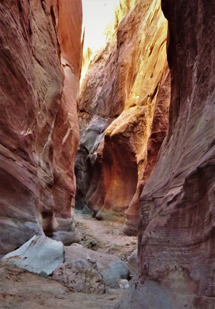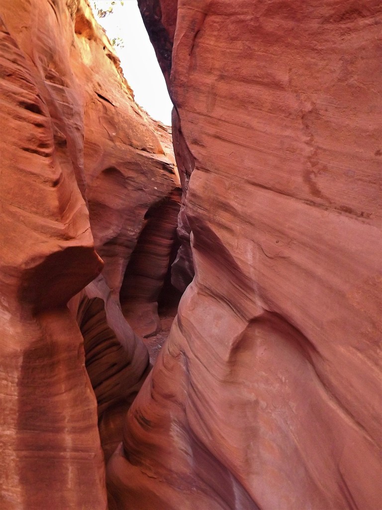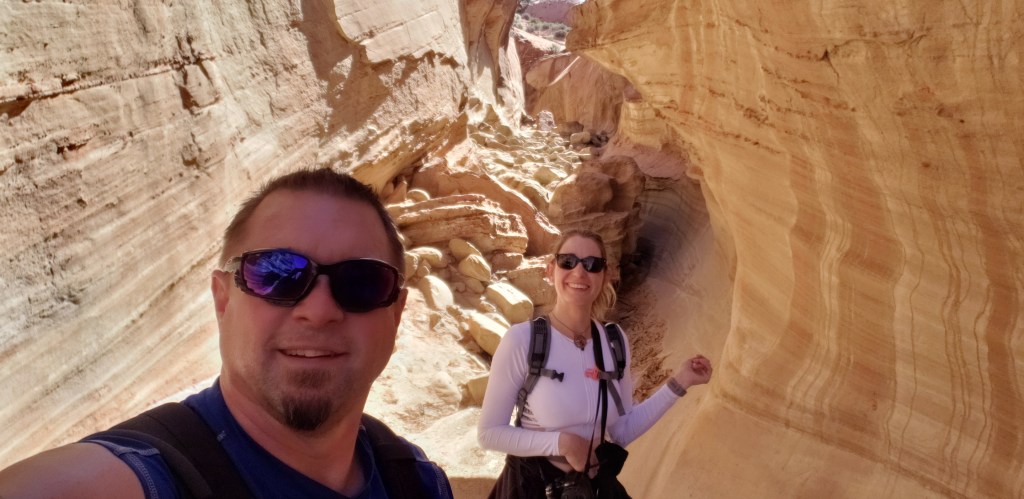 - Peek-A-Boo Slot Canyon welcomed us with twisting, swirling canyon walls that looked like waves of frozen sandstone.