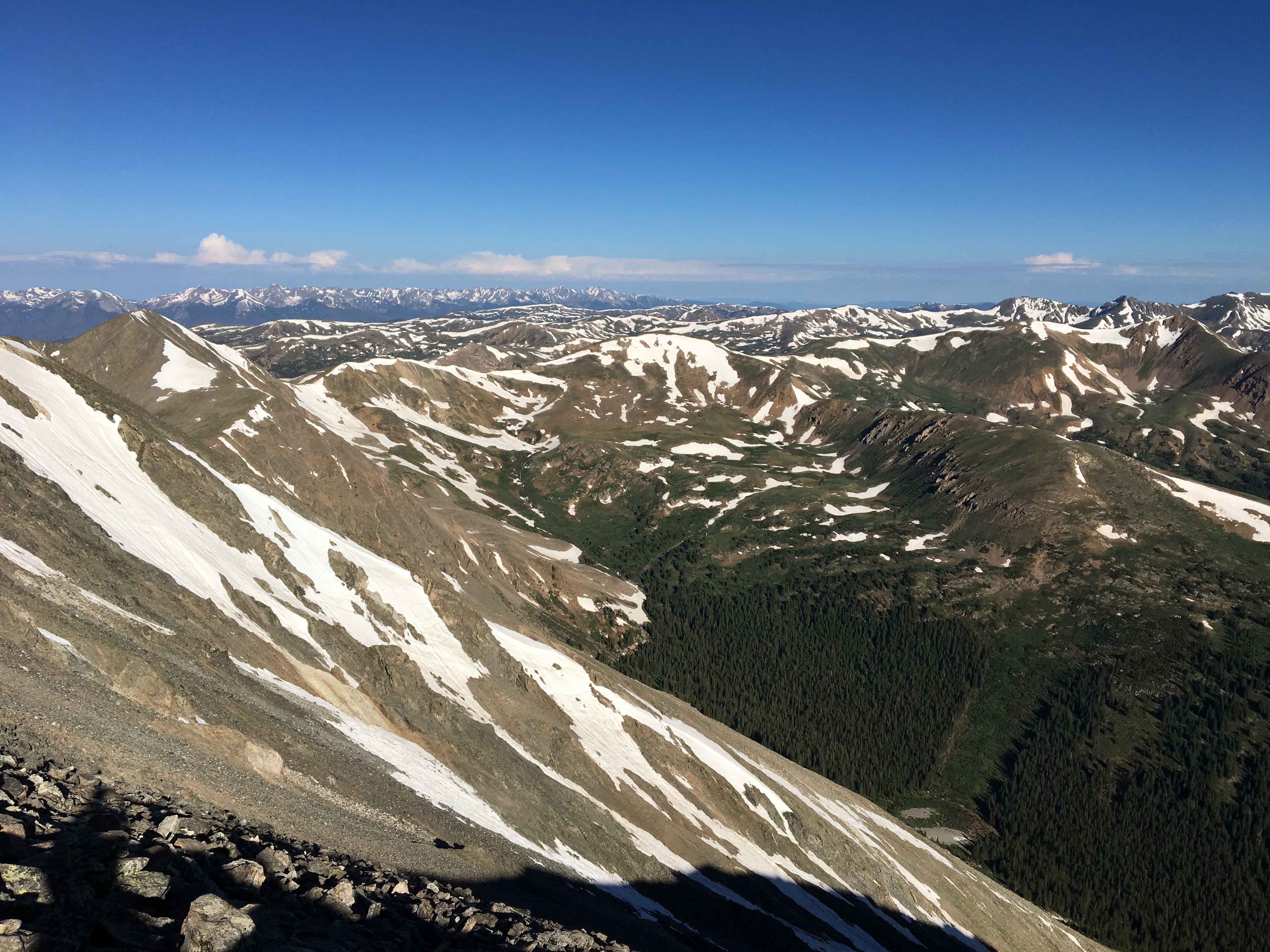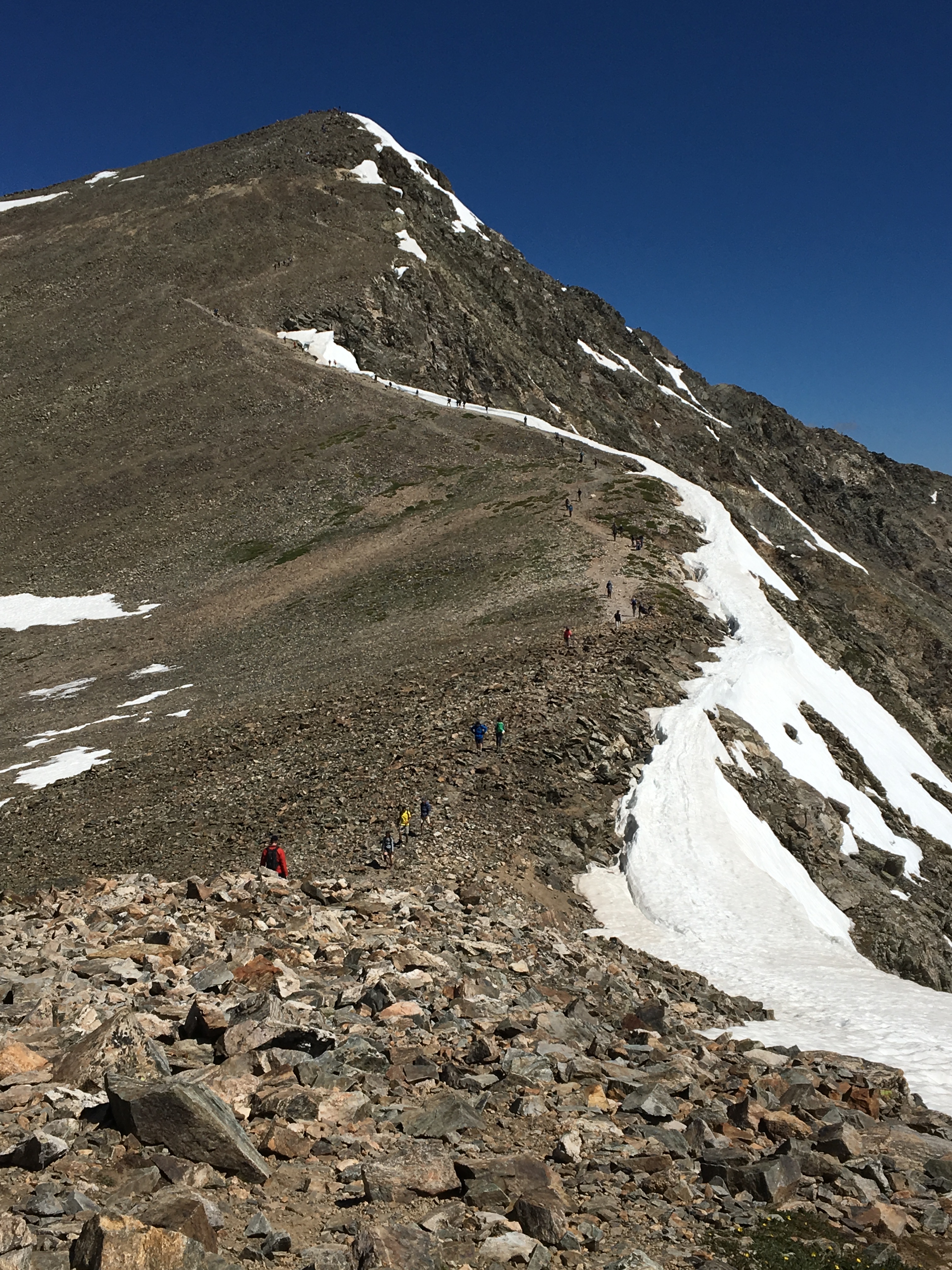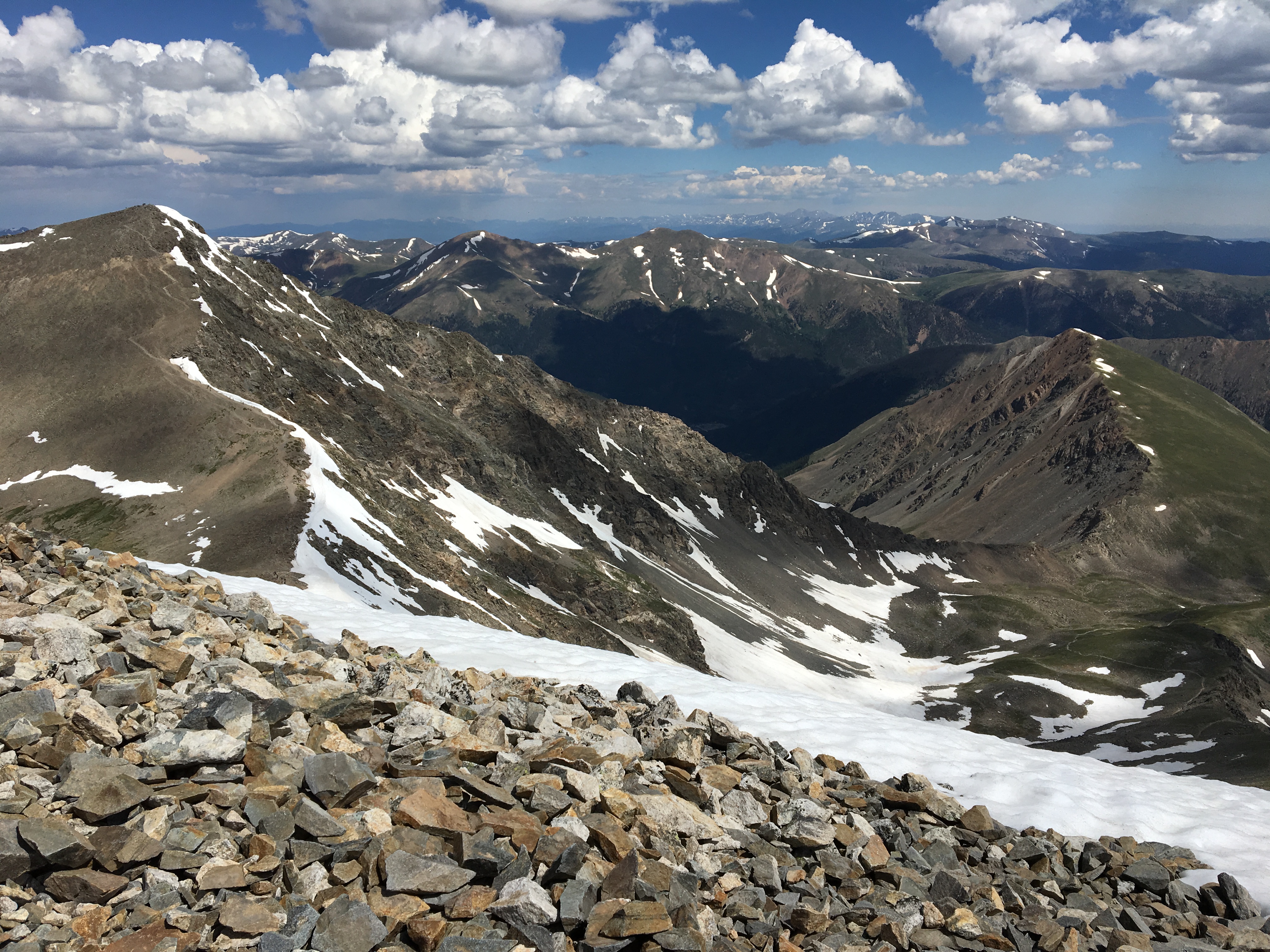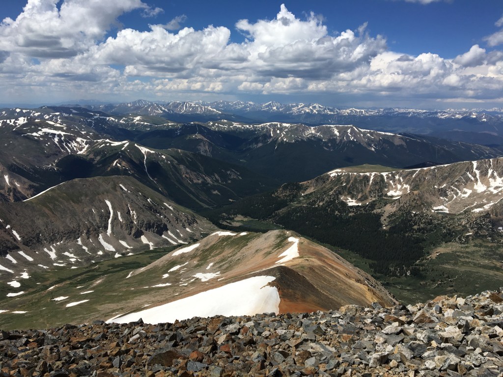 Standing atop Torreys Peak at 14,267 feet, we took a moment to savor the achievement and the incredible panorama around us. The view toward Grays Peak, our next destination, was both daunting and inspiring. From this vantage point, we could see the saddle that connected the two peaks, a path that promised another rigorous but rewarding climb.