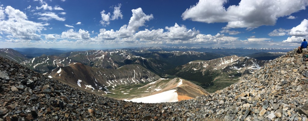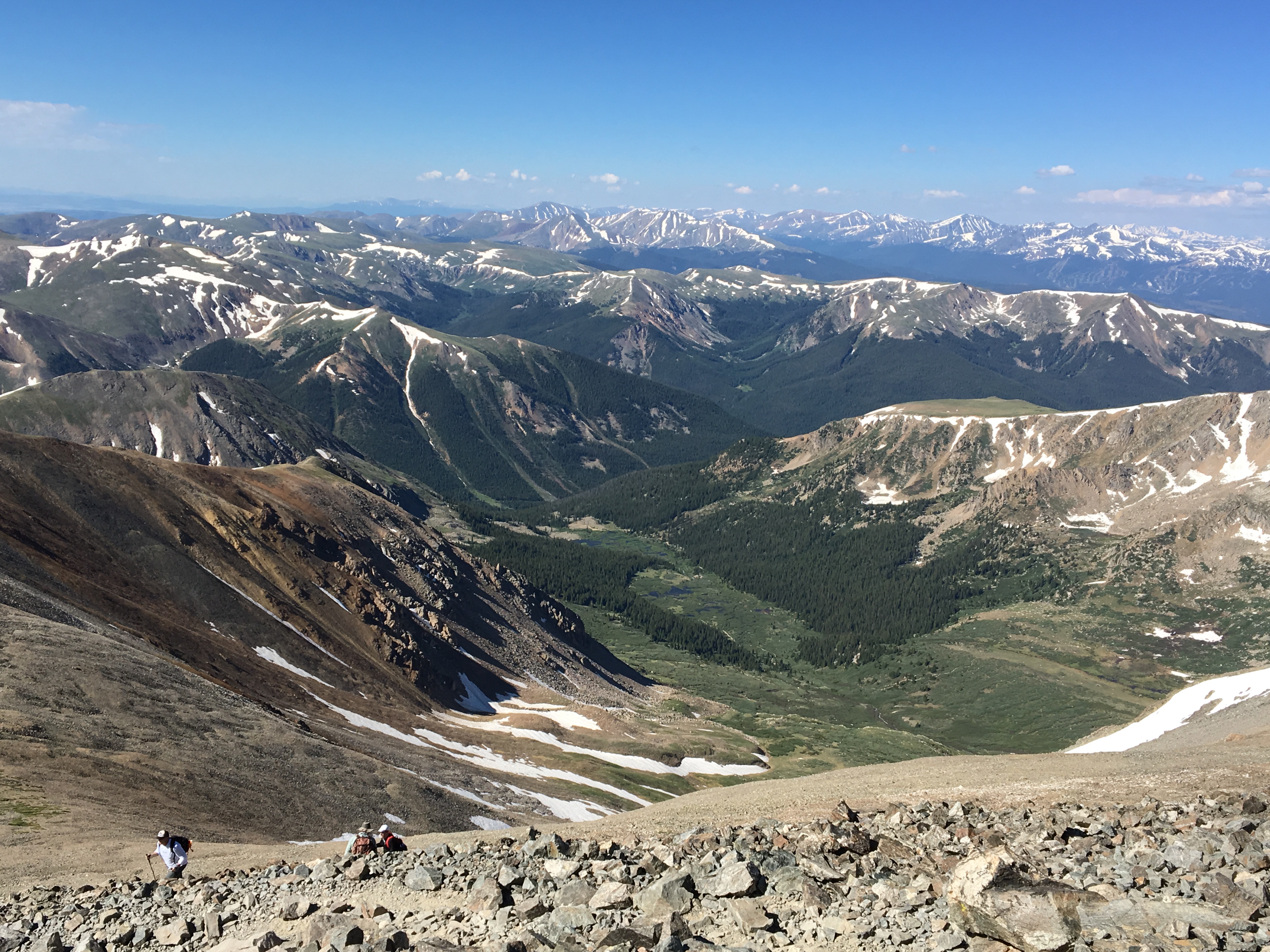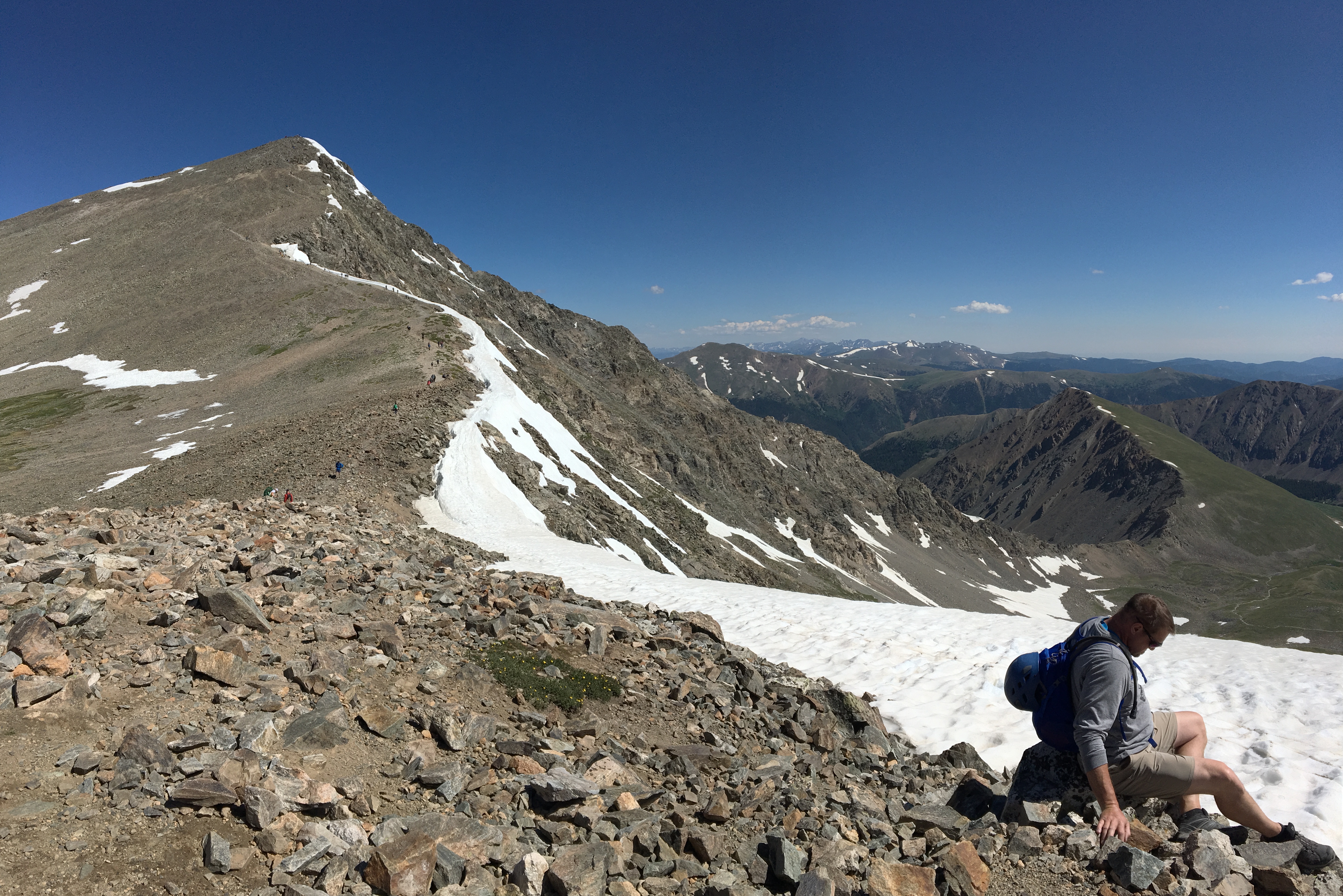 Descending into the saddle, we marveled at how far we had already come. The climb up to Grays Peak tested our endurance, but the summit’s rewards made every step worthwhile. At 14,270 feet, we celebrated our second summit of the day, exhausted but exhilarated. Relaxing on the peak, we soaked in the expansive views of Colorado’s rugged terrain, feeling both humbled and inspired.
