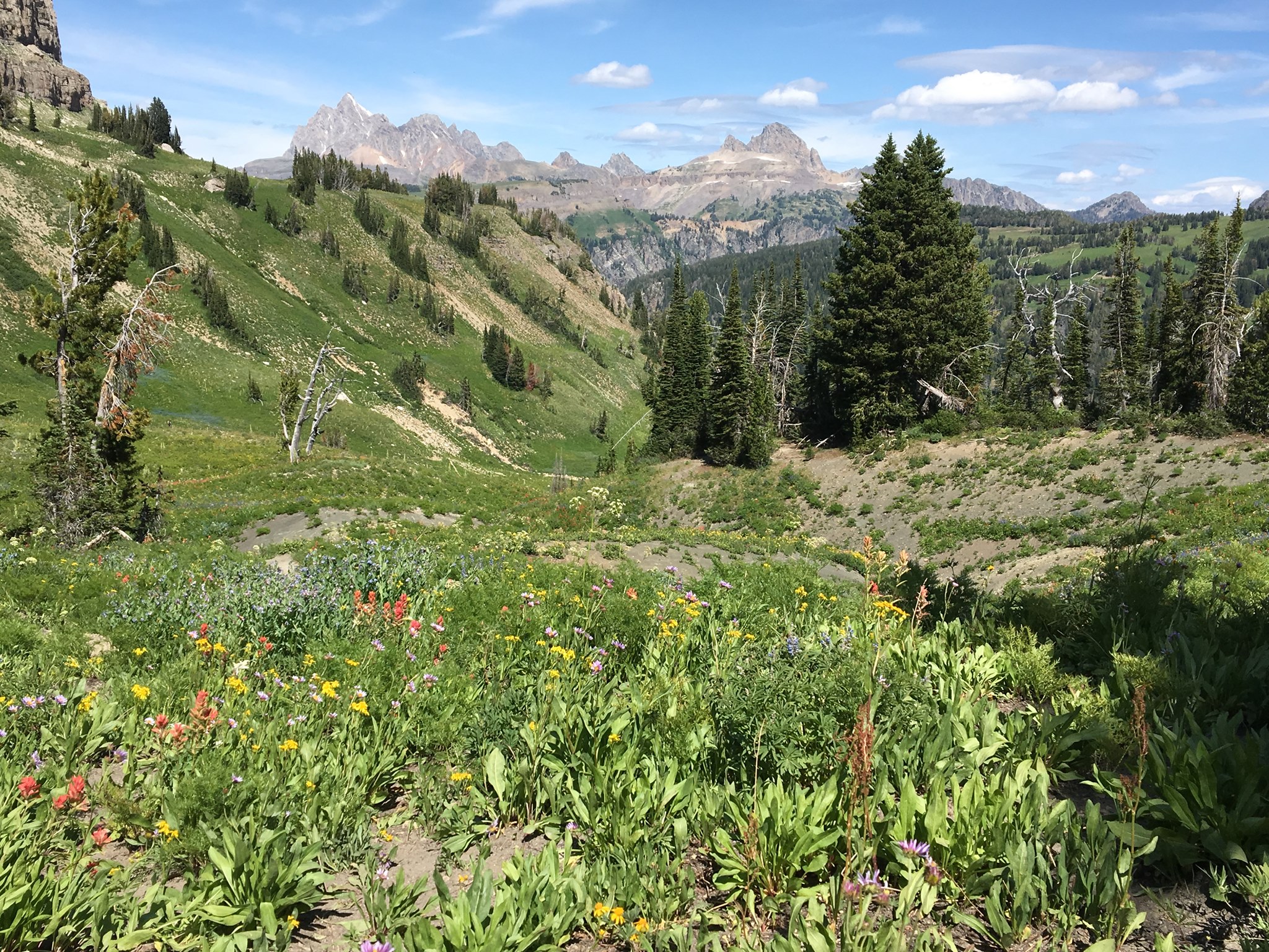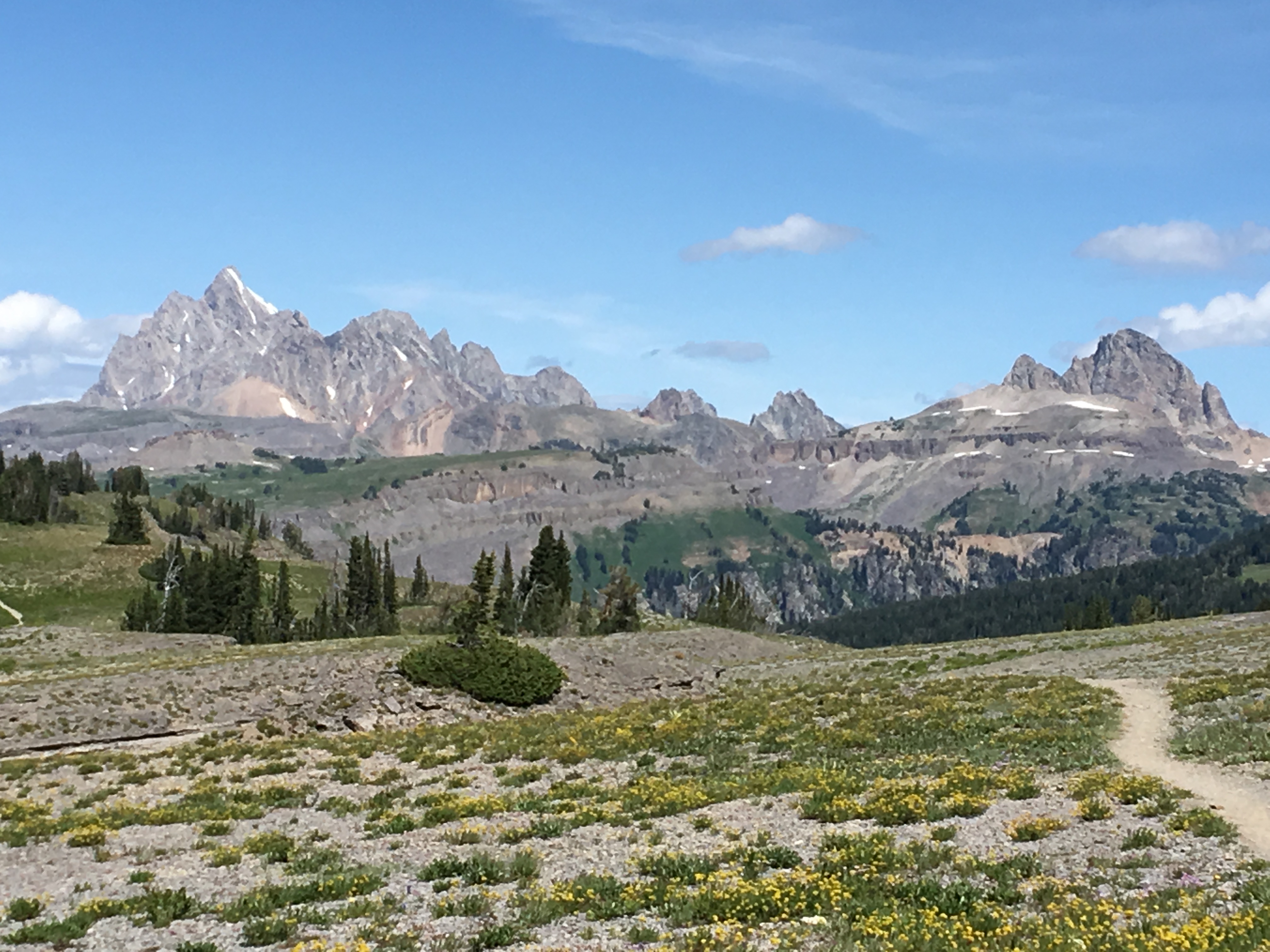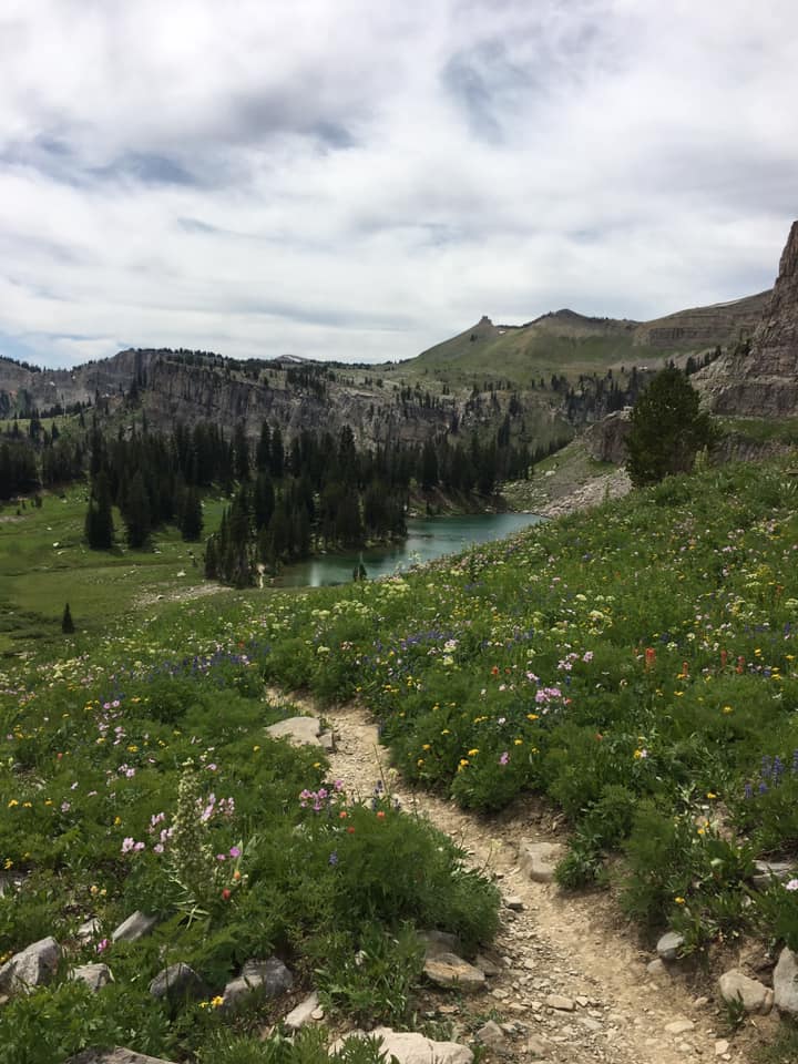 The trail narrowed, barely wide enough for a single person, adding an exhilarating edge to our trek. As we cleared the pass, the Tetons re-emerged, their jagged peaks piercing the sky. The abundance and variety of wildflowers surprised me, a vibrant carpet of colors contrasting against the stark rocky terrain as we left the trees behind. For miles, it felt like we had the wilderness to ourselves, the silence only broken by the crunch of our boots.
