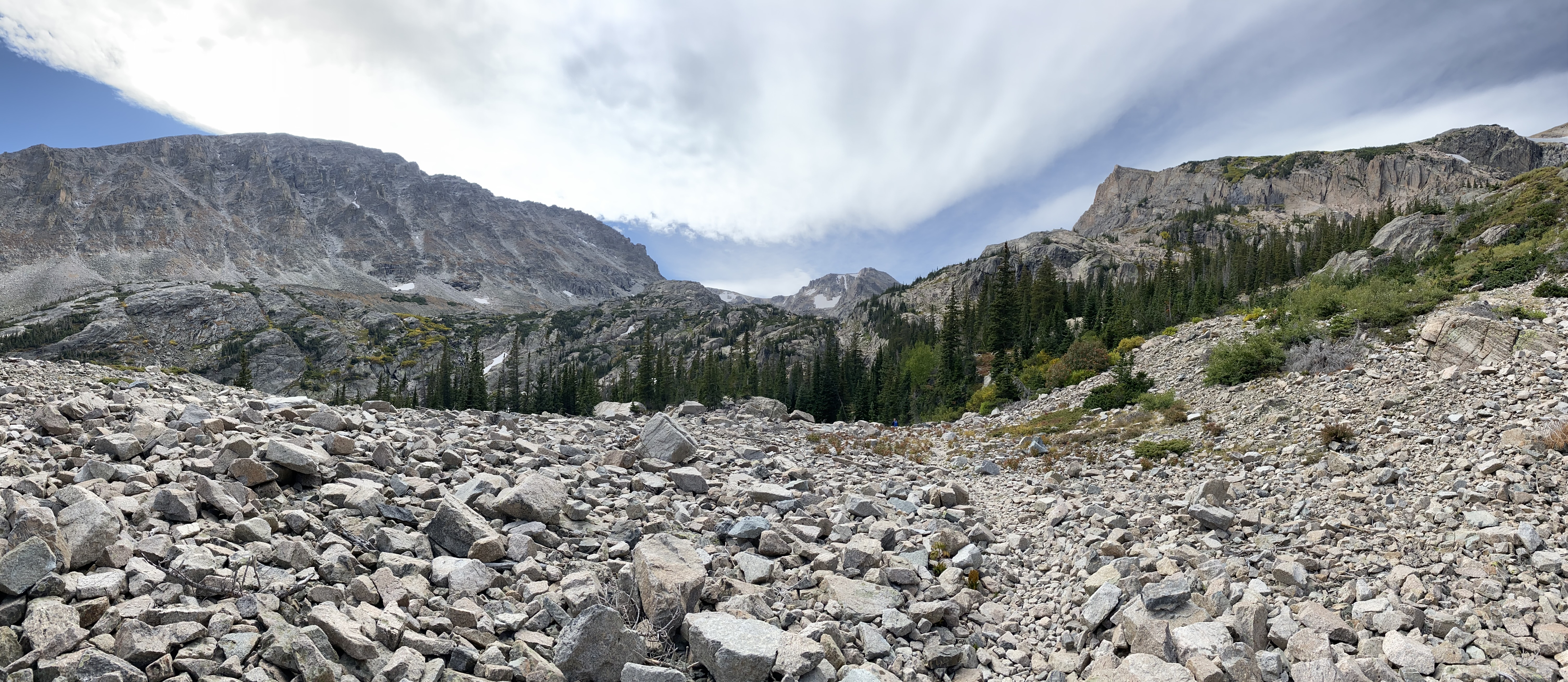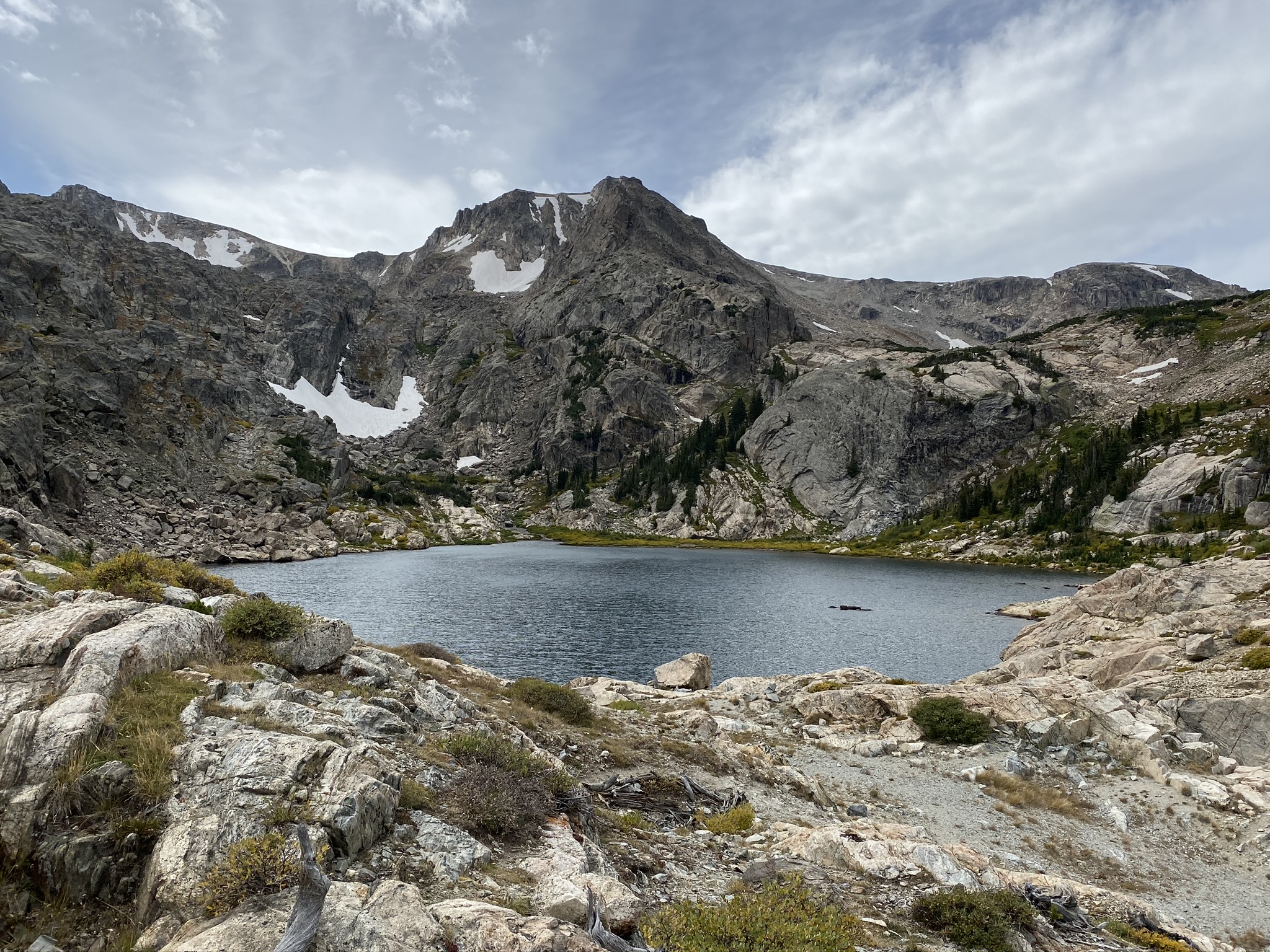 Continuing past Ouzel Falls, the trail ascended towards Ouzel Lake. Here, signs of autumn became more apparent, with splashes of gold from the changing aspens contrasting against the evergreens. The path wound through rocky terrain and opened up to reveal expansive views of the surrounding peaks.