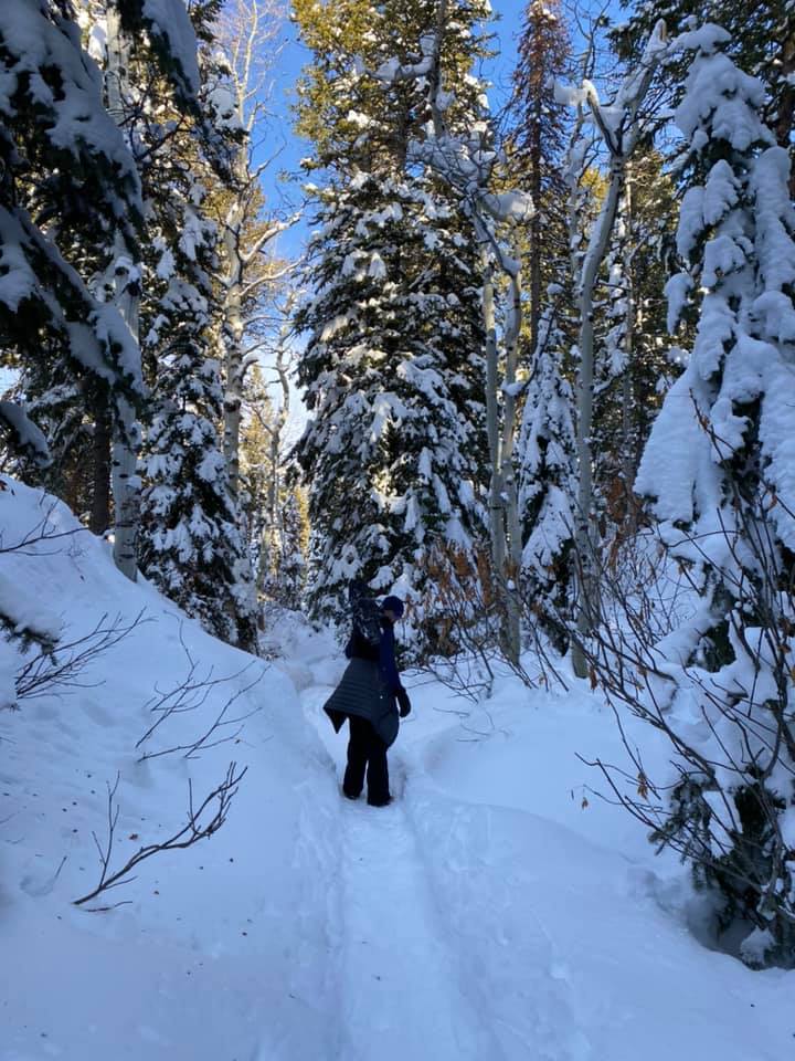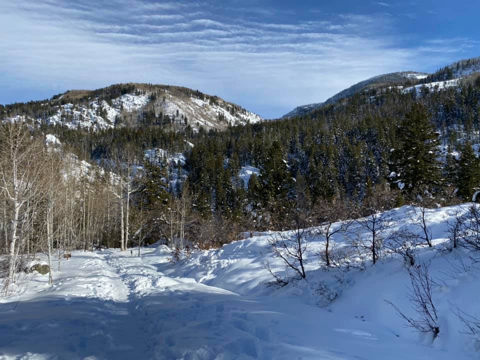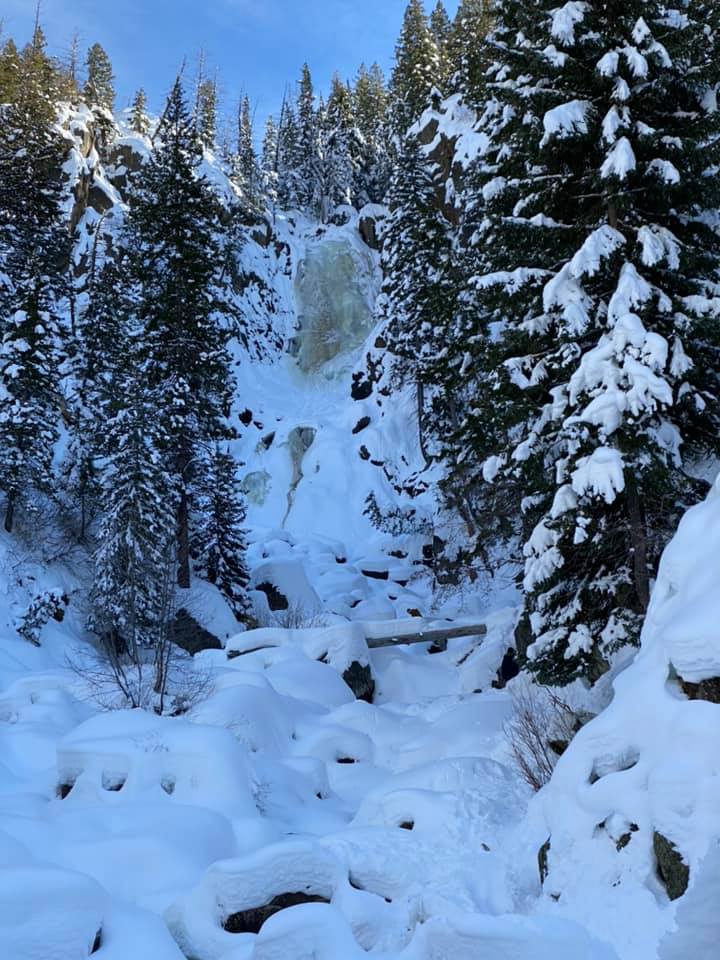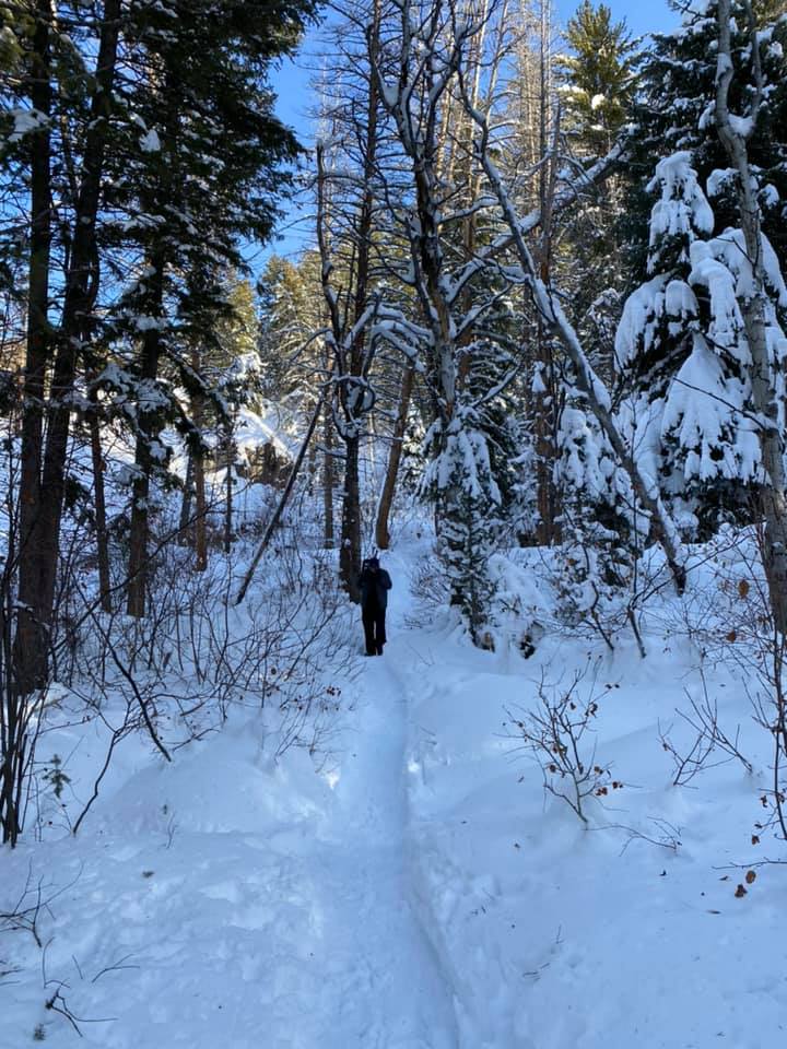 As we hiked through the winter wonderland around Fish Creek Falls, we were greeted by scenes straight out of a storybook. The landscape was blanketed in a thick layer of snow, with tall evergreens standing guard over the frozen creek below. The snow-covered branches sparkled in the soft sunlight filtering through, creating a peaceful glow across the forest. The quiet beauty of the trail was breathtaking, with only the occasional sound of snow crunching beneath our boots as we walked. It felt like a truly magical way to celebrate the winter solstice, surrounded by nature’s quiet elegance in this snow-draped paradise.