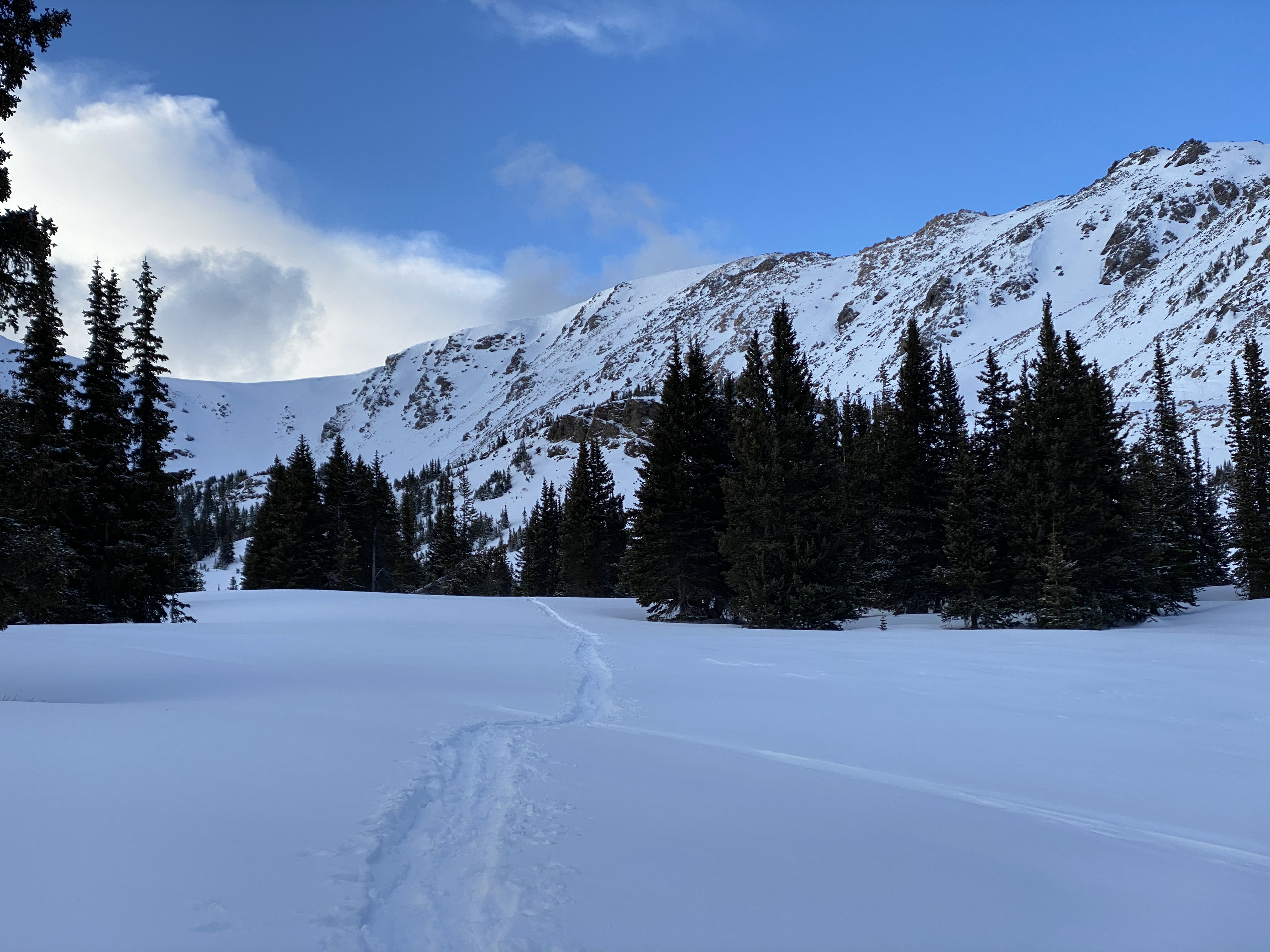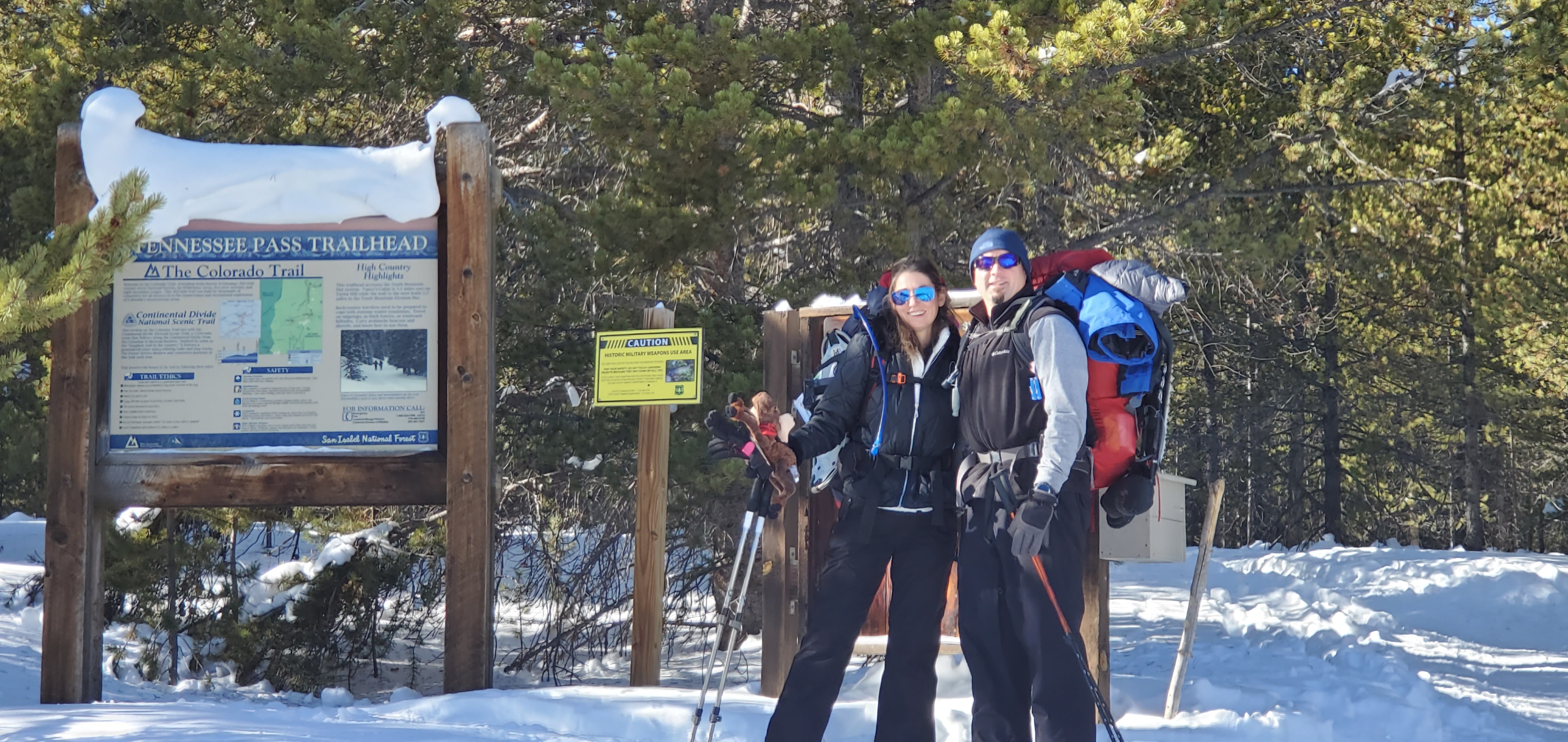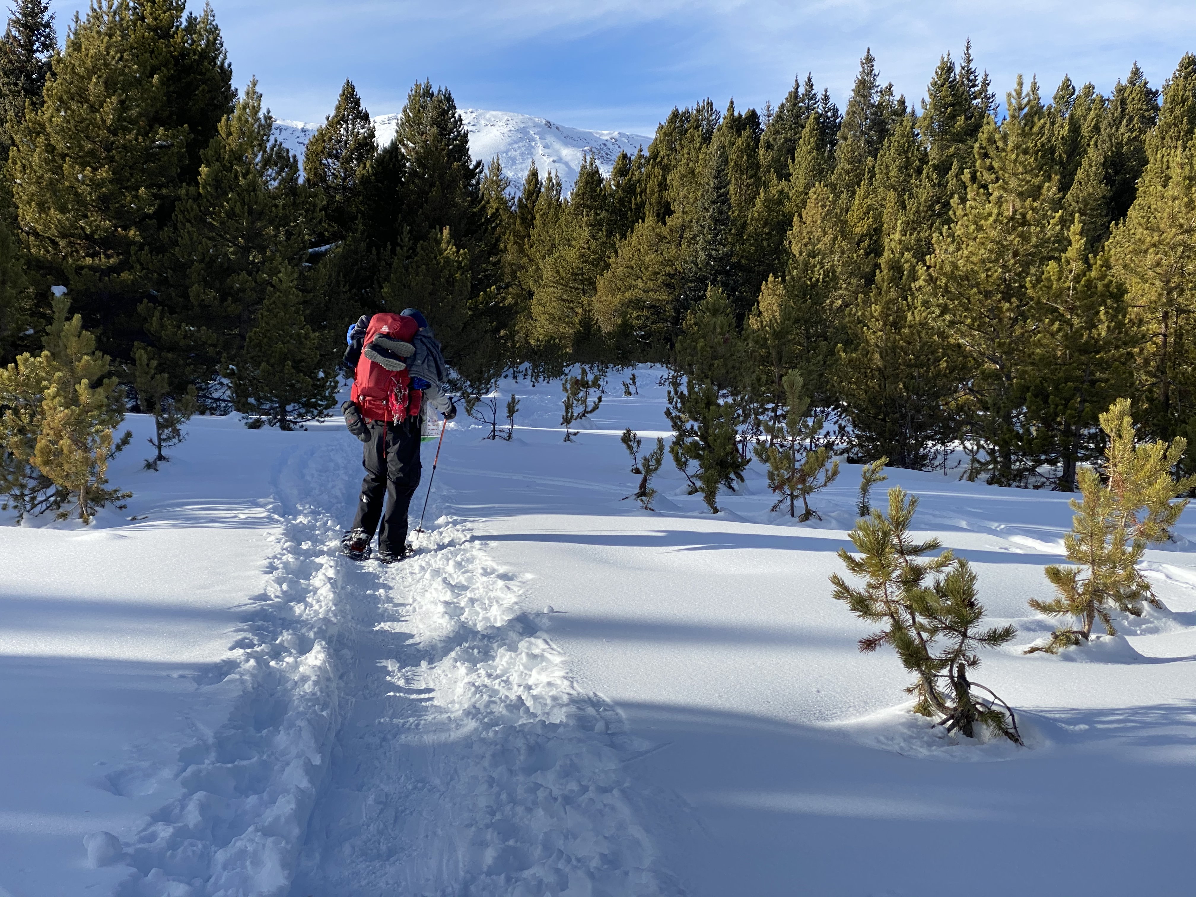 On Christmas Eve, Bill and I set out from the Tennessee Pass Trailhead, opting for the longer, more scenic route along the Colorado Trail (CT) and the Continental Divide Trail (CDT). As we snowshoed through dense evergreen forests, we meandered along trails that wove through quiet glades and over snow-covered slopes, feeling like stepping into a snow-globe scene. Though the uphill trek was slow and steady, each step brought us closer to the hut at 11,370 feet, just below the Continental Divide. When it finally appeared, nestled among the snowy landscape like a scene from a postcard, all the effort felt worthwhile.