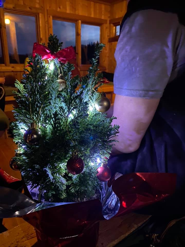 Inside, a warm fire crackled, with hot drinks and friendly faces awaiting us. In the spirit of the season, we had carried a small evergreen to decorate, adding a festive touch that delighted our newfound friends. We shared laughter, stories, and even holiday treats—a true community spirit among strangers, gathered to celebrate in a cozy cabin under the stars.