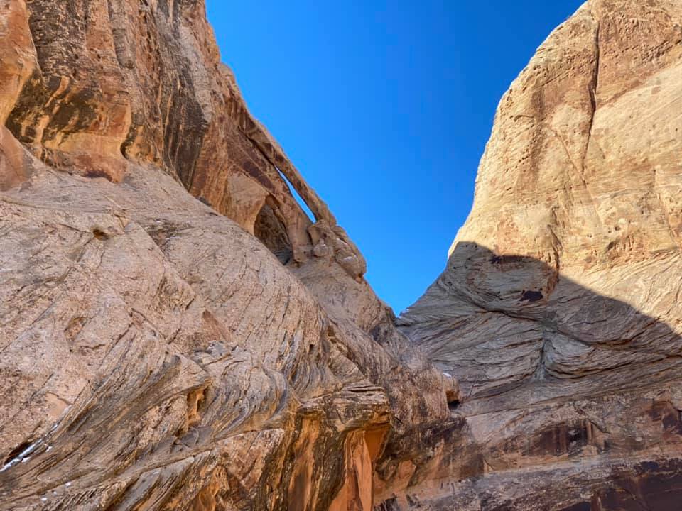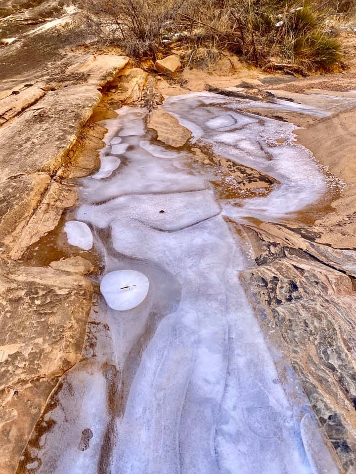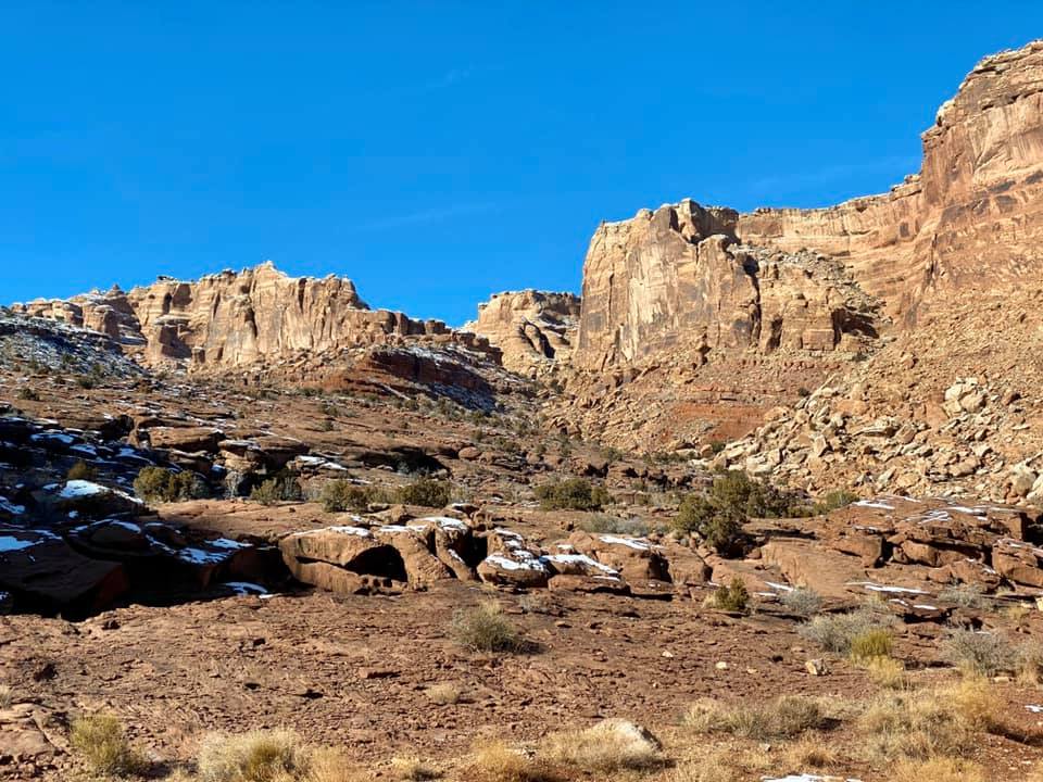 Our day began with a hike to Petroglyph Canyon. Winter in Utah is stunning, with beauty at every turn. The snow crunched under our shoes as we made our way, the snow gradually faded, revealing the grandeur of Spirit Arch. Arch Canyon boasts three arches nearby, creating a spectacular sight. At the top of Arch Canyon, we encountered a massive dry fall with a frozen plunge pool below, a testament to the winter’s grip on the land.