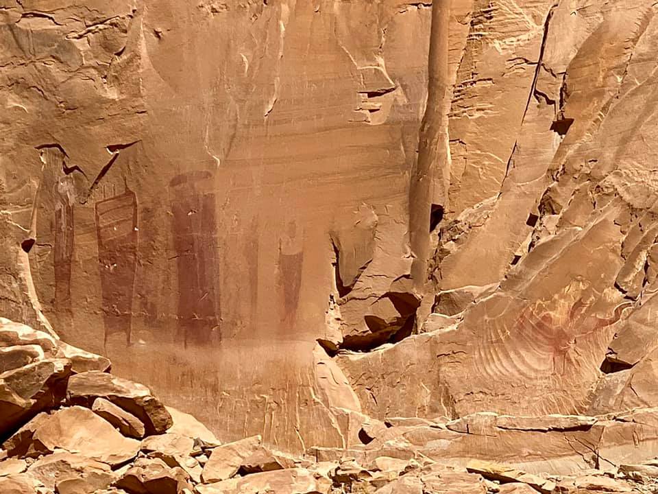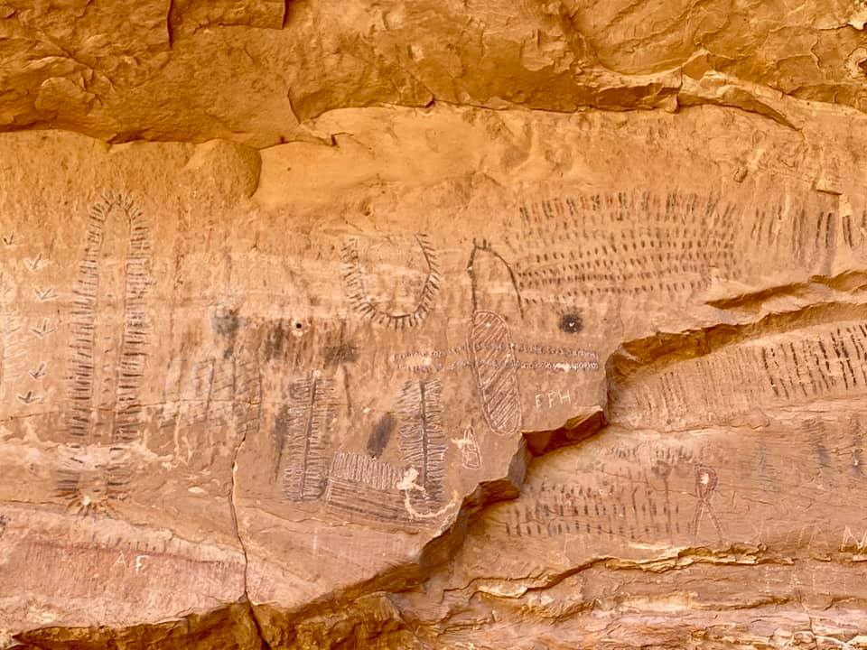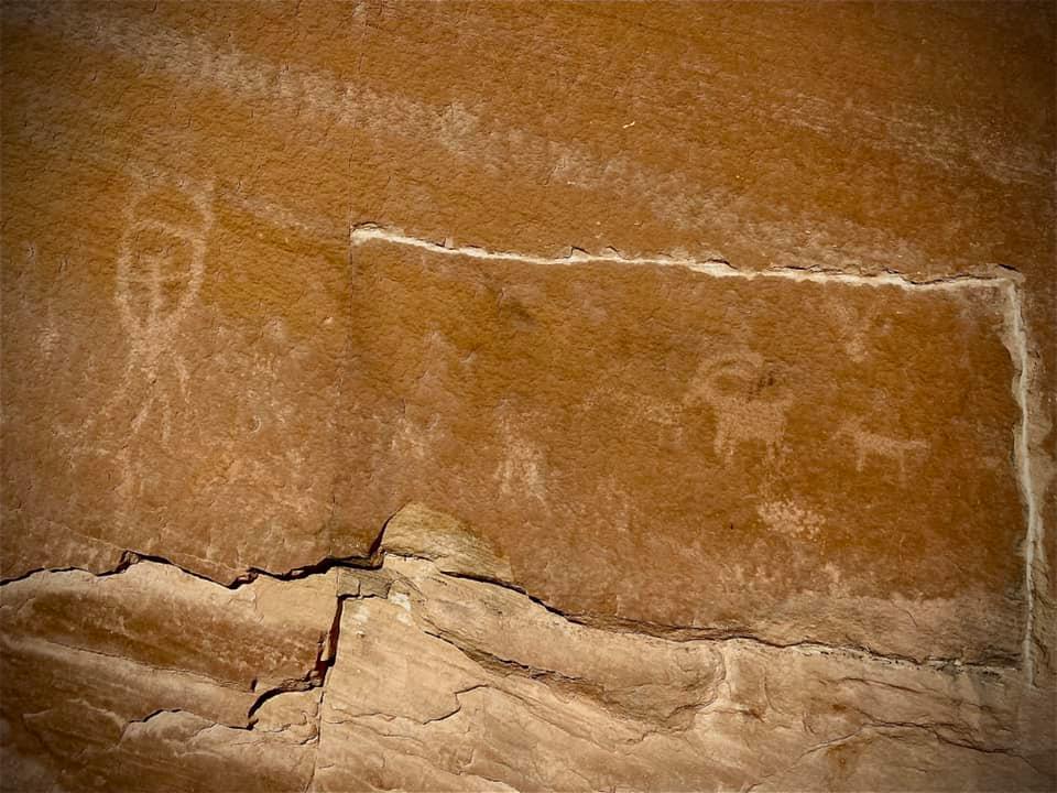 Our adventure continued, transitioning from snowy roads to dirt trails and back again, showcasing Utah’s incredible diversity. We made a quick stop at Temple Wash Pictograph Panel, famous for its Barrier Style pictographs and Fremont figures. The ancient artwork offered a mesmerizing glimpse into the lives of those who once roamed these lands.