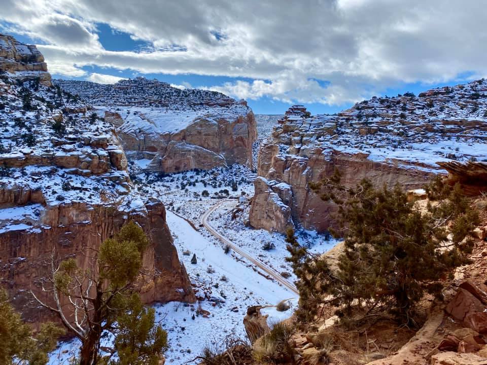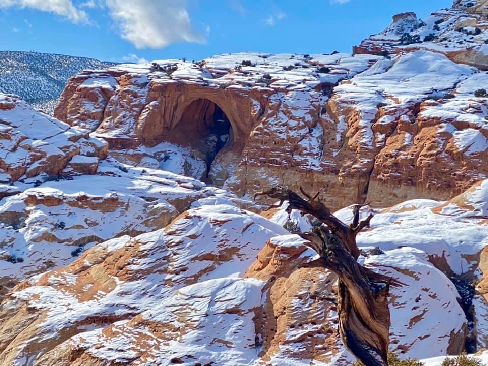 Our adventure continued on the Cassidy Arch Trail, a path that winds along the canyon’s edge over slick rock to a natural arch named after the infamous outlaw Butch Cassidy, who is said to have hidden here. The 7.5 mile roundtrip hike offered us spectacular, uninterrupted views of the park’s winter beauty. We marveled at the snow-dusted canyons and towering cliffs as we ascended. Each step brought us closer to the awe-inspiring arch, and the thrill of the climb was heightened by the stunning scenery around us.