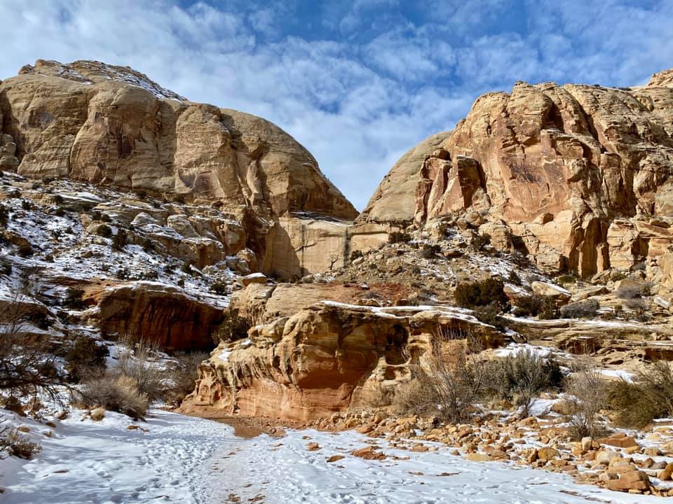 Hiking to Cassidy Arch in the winter was one of the most rewarding experiences we’ve had in Capitol Reef National Park. The cool temperatures made the hike invigorating, and the fresh snow added a touch of magic to the landscape. We felt like explorers in a winter wonderland, our footprints the only sign of human presence in the pristine snow.