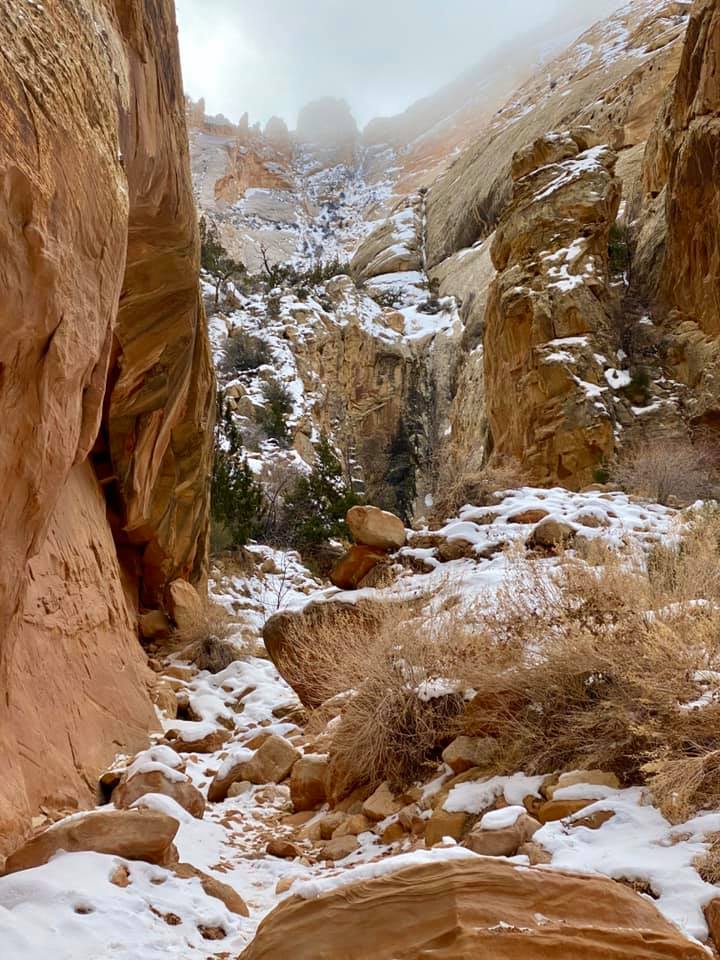 Bill and I embarked on a magical winter adventure to Cassidy Arch in Capitol Reef National Park. A fresh dusting of snow from the previous night had transformed the park into a serene and breathtaking wonderland. Capitol Reef, known for its canyons, arches, cliffs, domes, and bridges, was even more enchanting in its snowy attire.