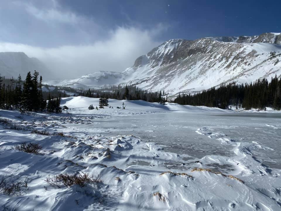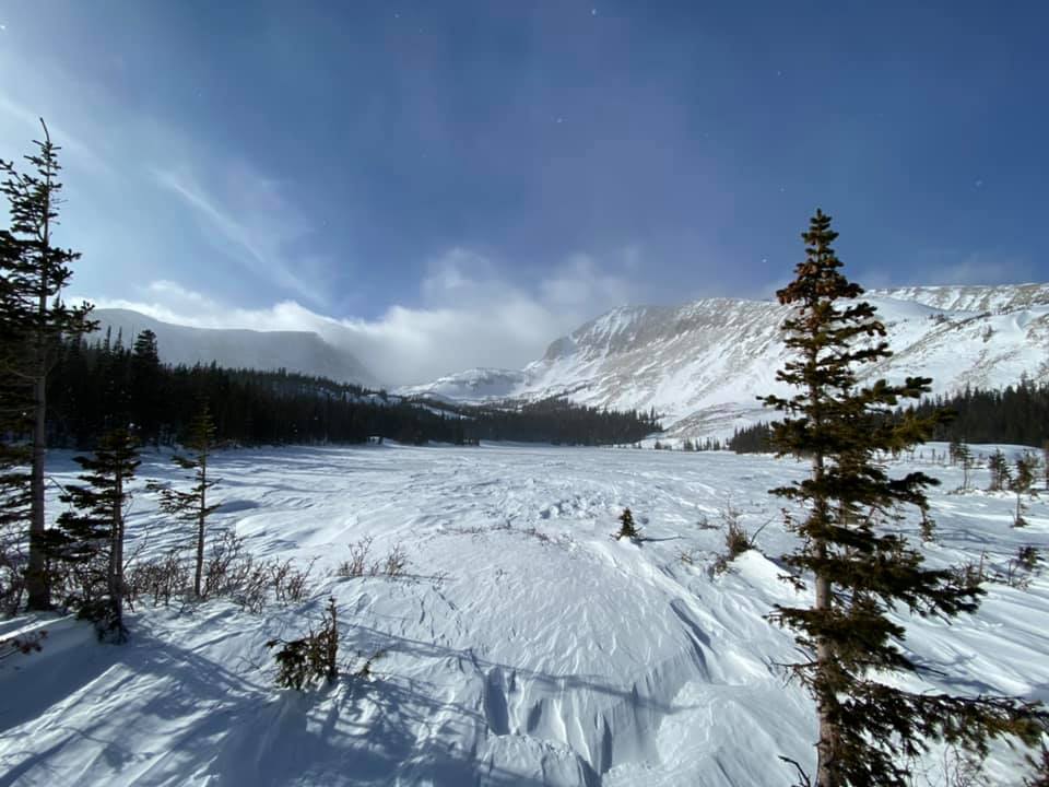 When we reached Brainard Lake, the sight was nothing short of magical. The lake was completely frozen over, with a pristine layer of snow reflecting the bright winter sun. The surrounding mountains stood majestically, their peaks dusted with snow. We took a moment to rest, hydrate, and soak in the breathtaking panorama before continuing our journey.