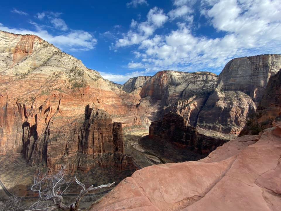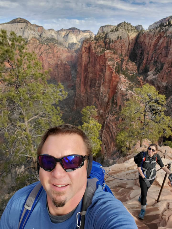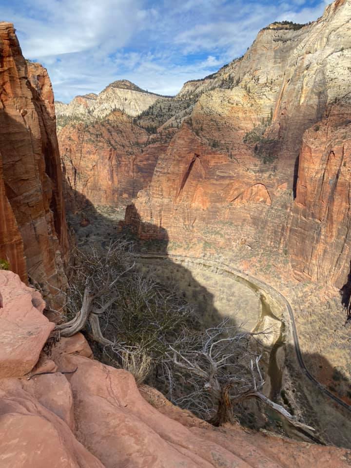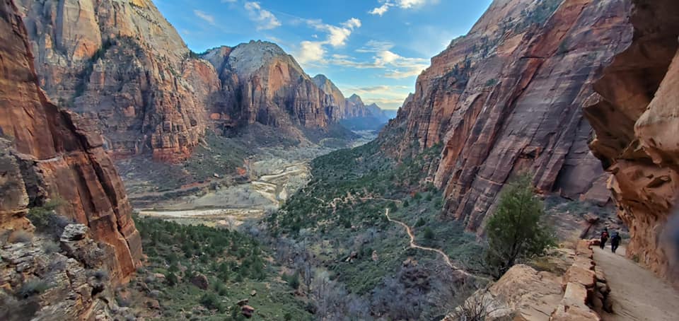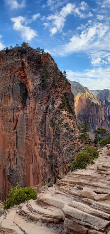 Yesterday’s epic hike took Bill and I to Angels Landing in Zion National Park, one of the most challenging and rewarding hikes the park has to offer. The slender spine of red sandstone juts into the canyon, providing epic views in all directions. It has been on my list for several years, and reaching the top was nothing short of exhilarating. The views were simply magnificent!