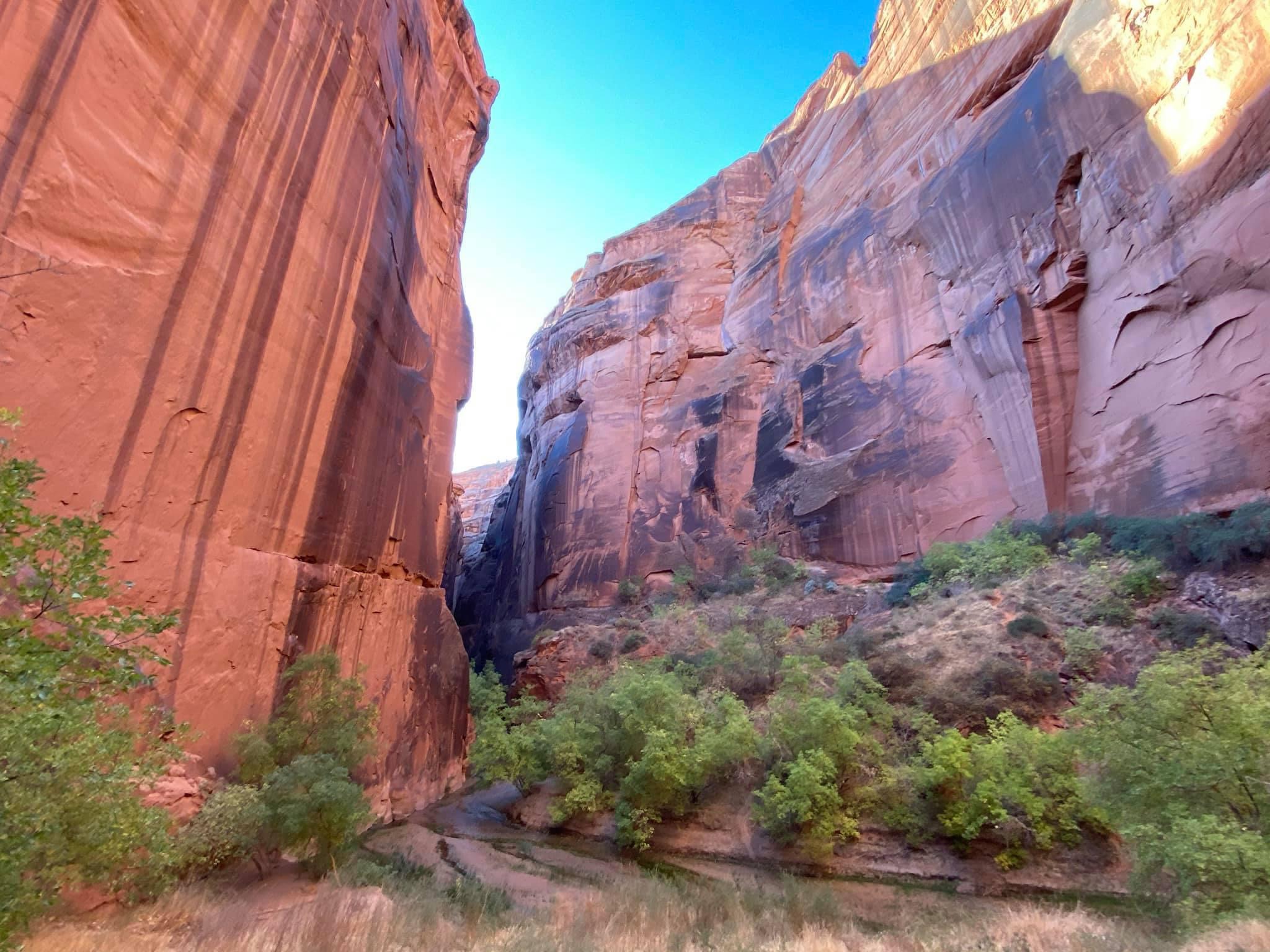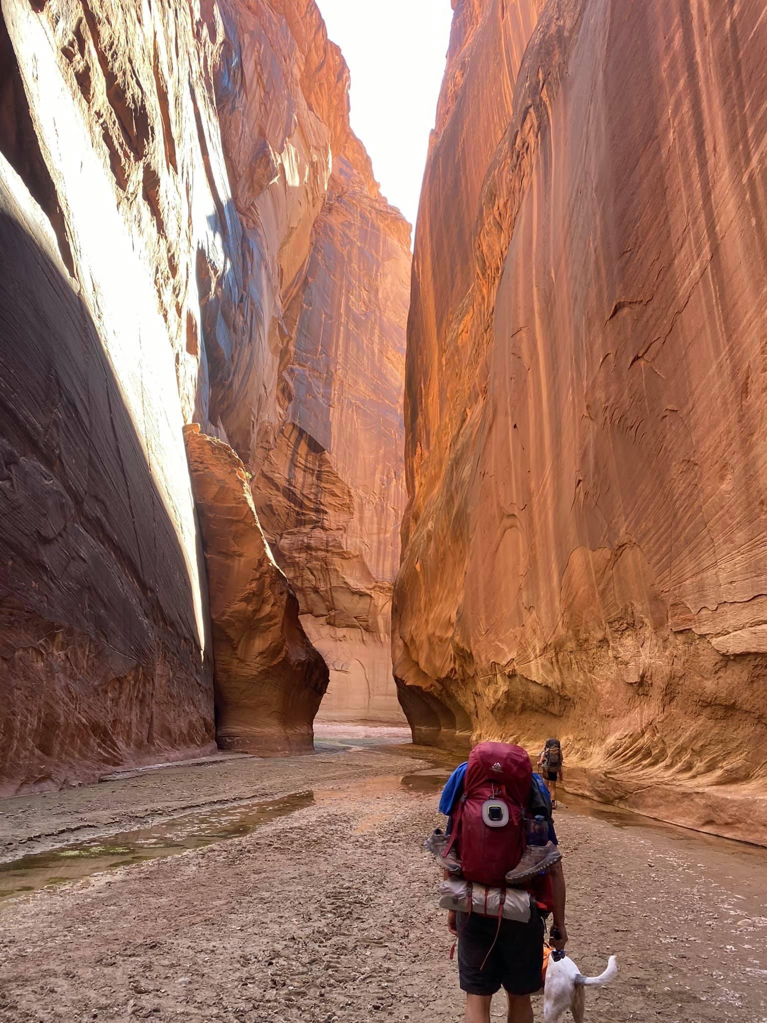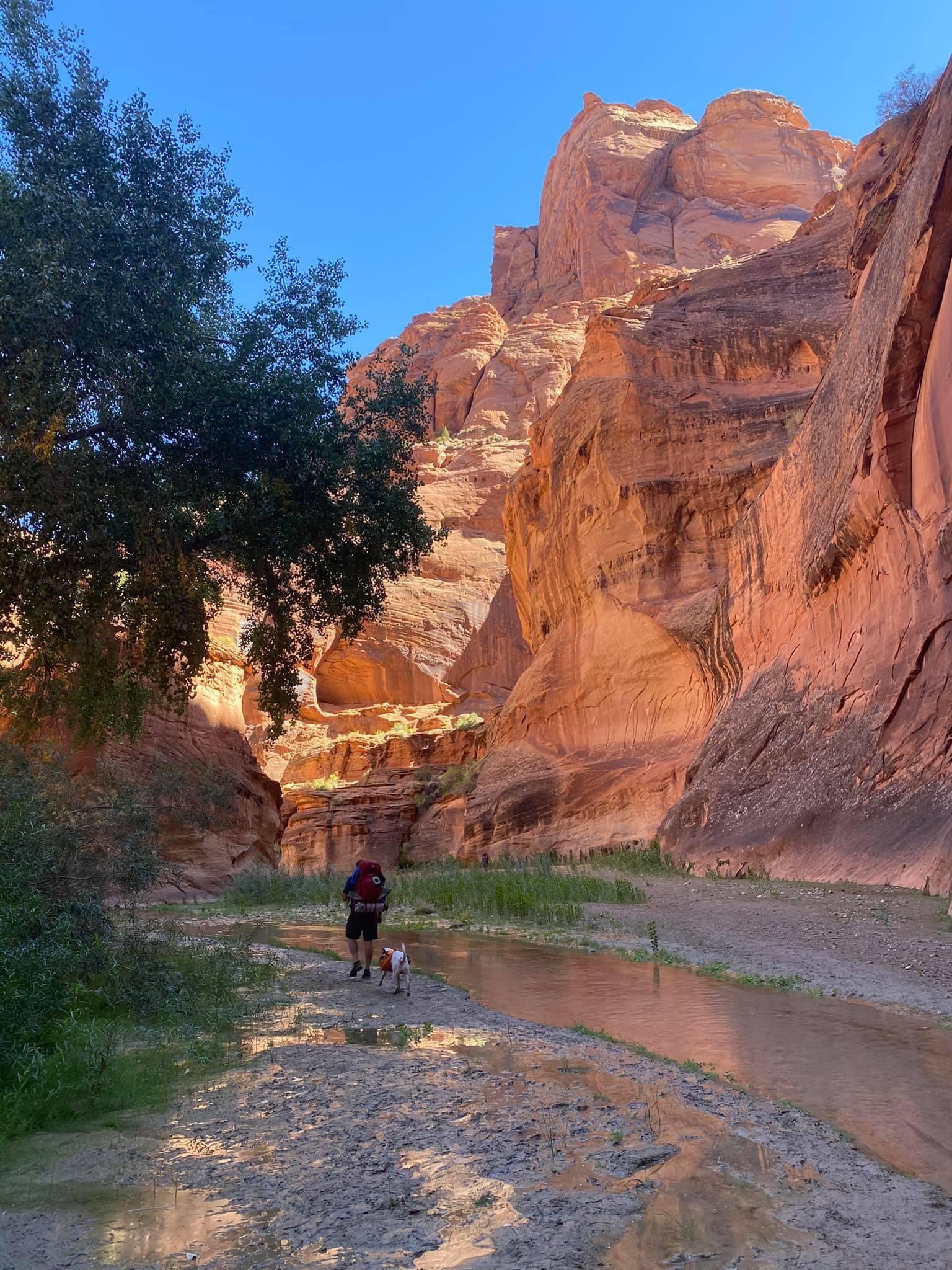 As the first light of dawn illuminated the canyon walls, I awoke to a breathtaking display of colors and the sweet fragrance of flowers drifting through the air. Bill and Prince, our faithful canine companion, seemed equally enchanted by the beauty of our surroundings. With a sense of anticipation, we set out on the next leg of our journey—hiking 5 miles to Big Spring in Paria Canyon.