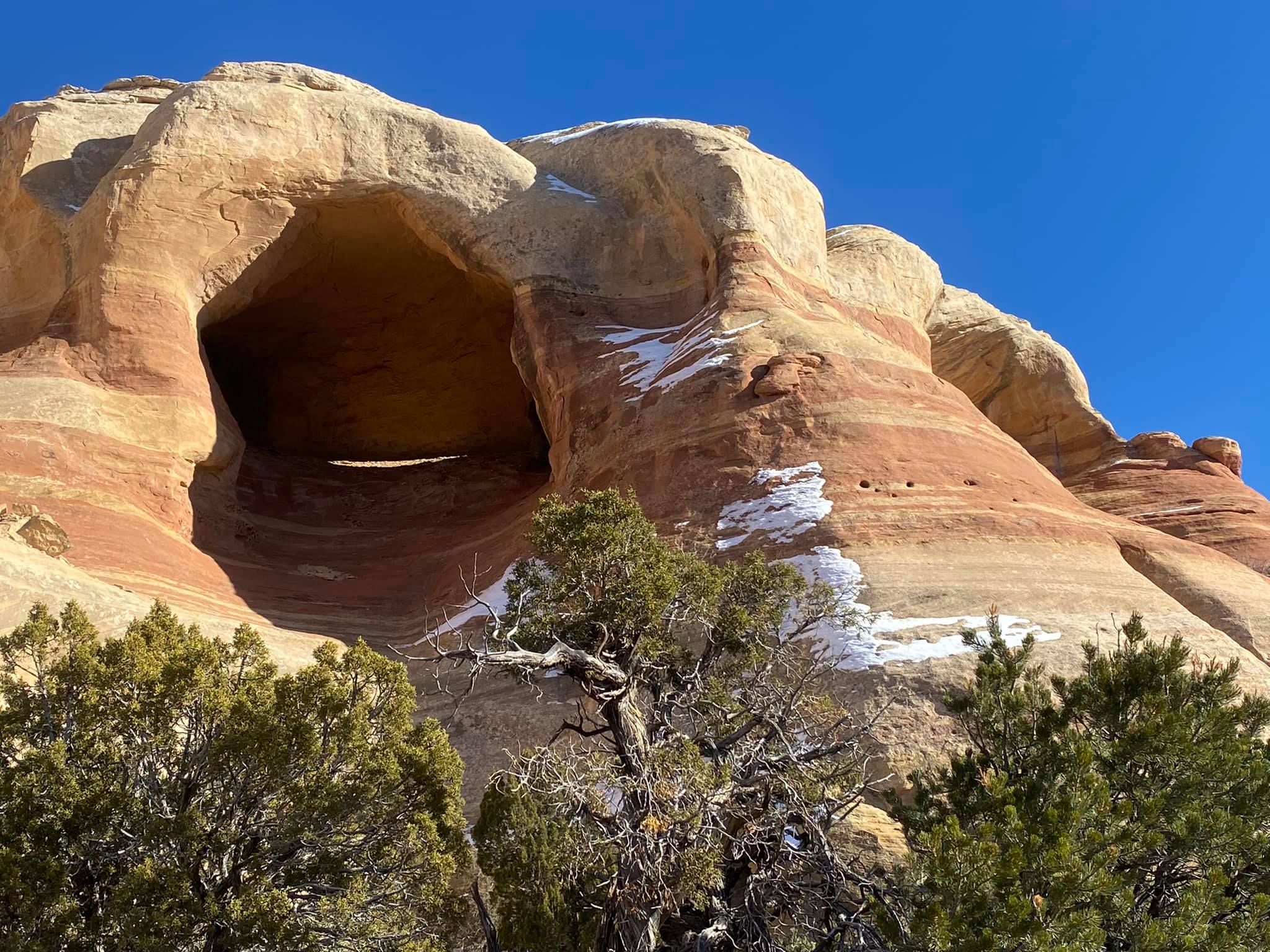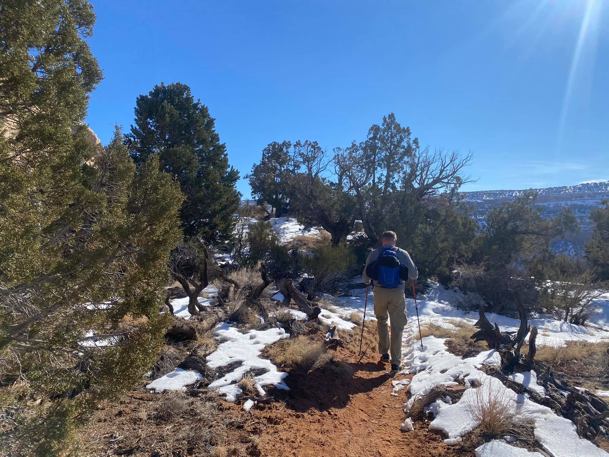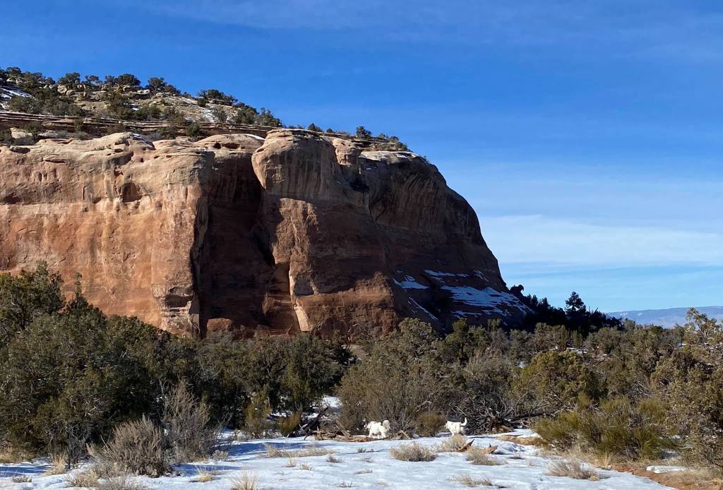 As we hiked through the canyons and across scrubby mesas, we marveled at the diverse landscape, adorned with scattered piñon pines, junipers, sagebrush, cacti, and yuccas, resiliently surviving on minimal rainfall. The dogs frolicked with joy, exploring the terrain and discovering patches of snow to roll around in, adding a touch of magic to our adventure.