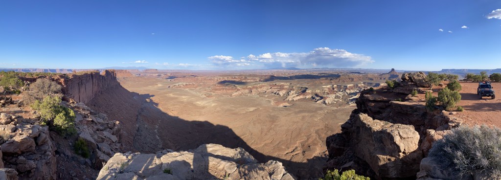 After our exploration of Horseshoe Canyon, we made our way to our first campsite at Panorama Point. Perched high on the canyon rim, our campsite offered panoramic views of the surrounding landscape, including Elaterite Basin and Horse Canyon below. Arriving just before sunset, we were treated to a spectacular vista overlooking the vast expanse of Canyonlands—a fitting introduction to the adventures that lay ahead.