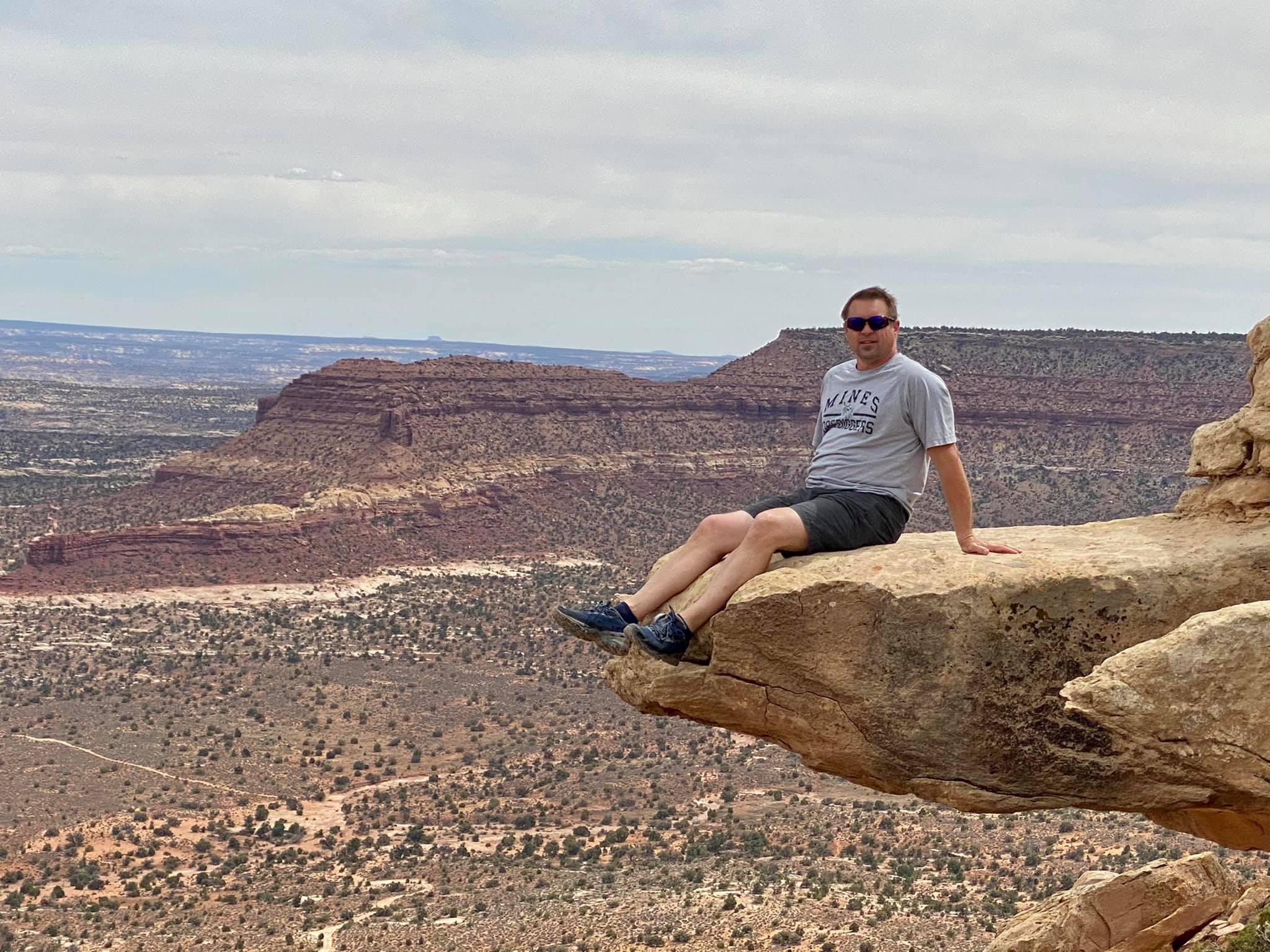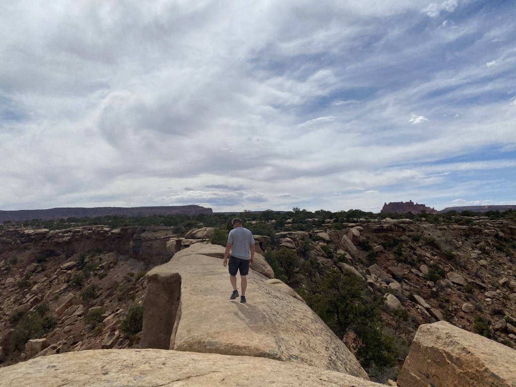 Our path led us to a long, narrow mesa, where we hiked out onto the exposed plateau, surrounded by sweeping vistas of Ernie’s County and the imposing fins that characterize the Maze District. Here, the landscape revealed its secrets, from the intriguing rock formations of Mother and Child to the winding Dollhouse Road below. As we ventured further, we encountered the China Neck—a narrow strip of land only 10 feet wide and 150 feet long—a precarious yet exhilarating vantage point from which to behold the rugged beauty of our surroundings.