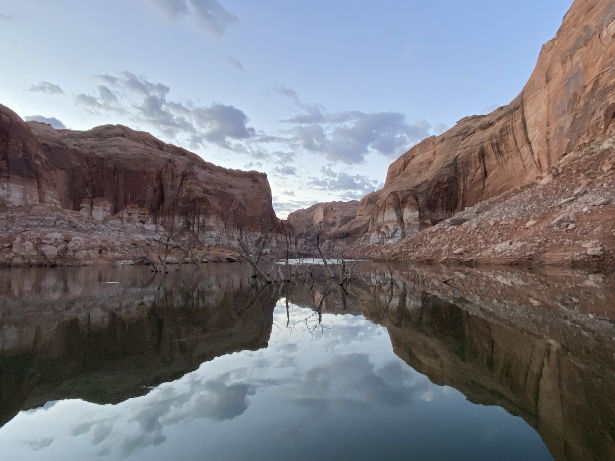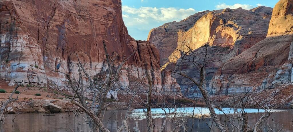 We stumbled upon a beautiful canyon spot to call home for the night. With the dogs happily exploring their new surroundings, Bill and I embarked on a kayaking adventure down the canyon, marveling at the eerie beauty of dead trees protruding from the water. It served as a poignant reminder of Lake Powell’s past before it was flooded, adding a layer of depth to our journey.