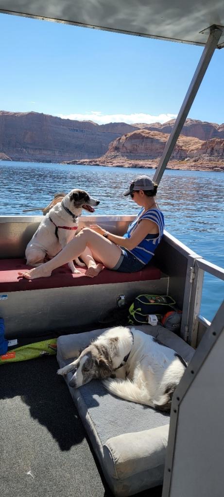 As we made our way back to the main channel, Bill and our furry companions took a well-deserved break, allowing me the opportunity to navigate the houseboat for a while. The tranquil waters of Lake Powell stretched out before us, inviting us to embrace the freedom of exploration.