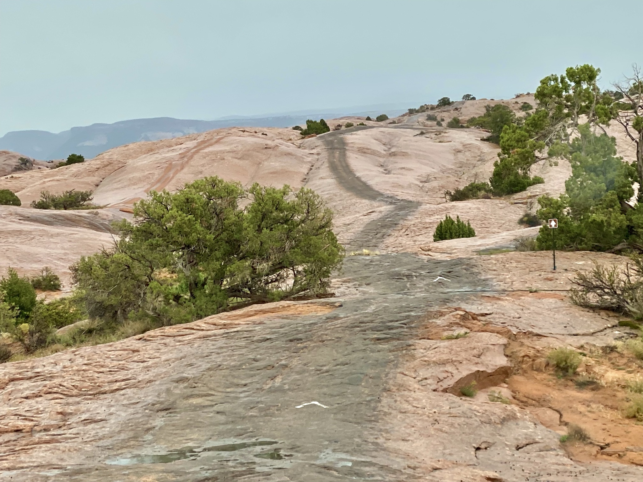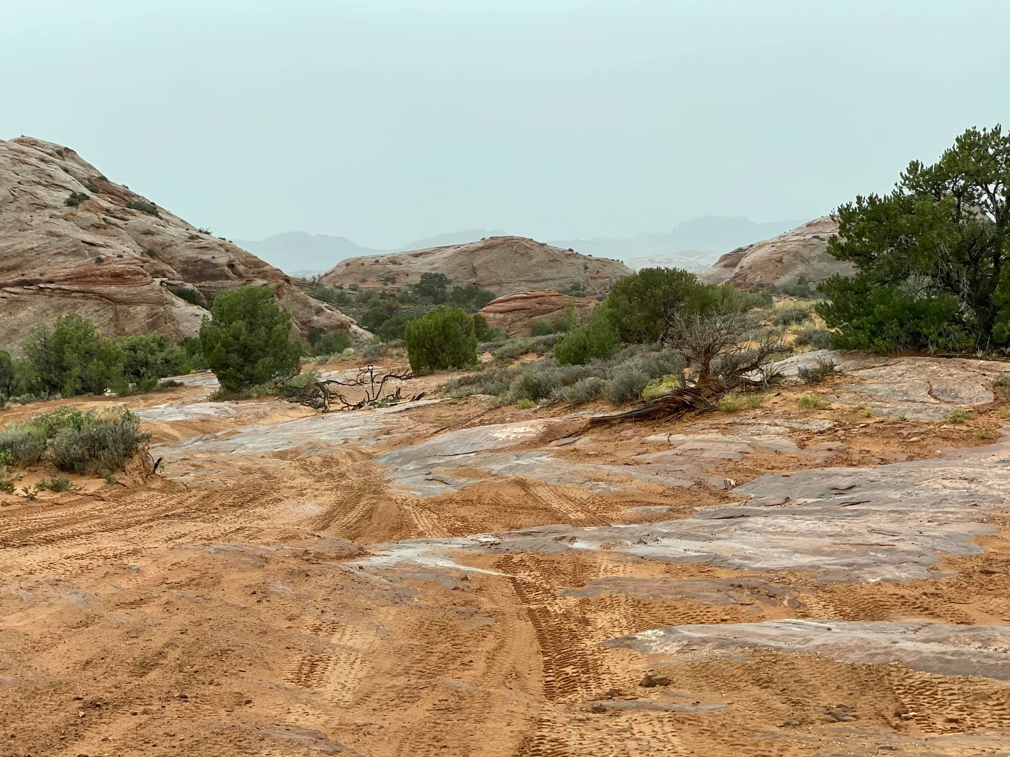 As we set out on the Fins & Things trail, the patter of raindrops provided a soothing soundtrack to our off-road adventure. Typically a bustling hub of activity, the trail lay deserted, offering us the rare opportunity to explore its twists and turns without the usual crowds. Maneuvering our vehicle over challenging terrain, we were met with sweeping vistas of Moab’s iconic red rock formations, their beauty undiminished by the overcast skies.