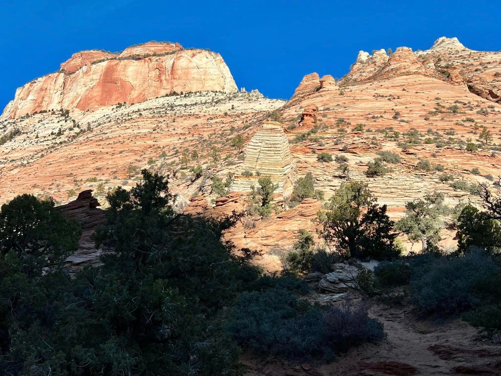 As we ventured deeper into the heart of Zion, we found ourselves surrounded by a kaleidoscope of colors—the rich reds and warm whites of the sandstone formations, the brilliant blue of the sky overhead, and the verdant green of the foliage that clung tenaciously to the canyon walls. Each vista seemed more breathtaking than the last, a testament to the incomparable beauty of this sacred land.