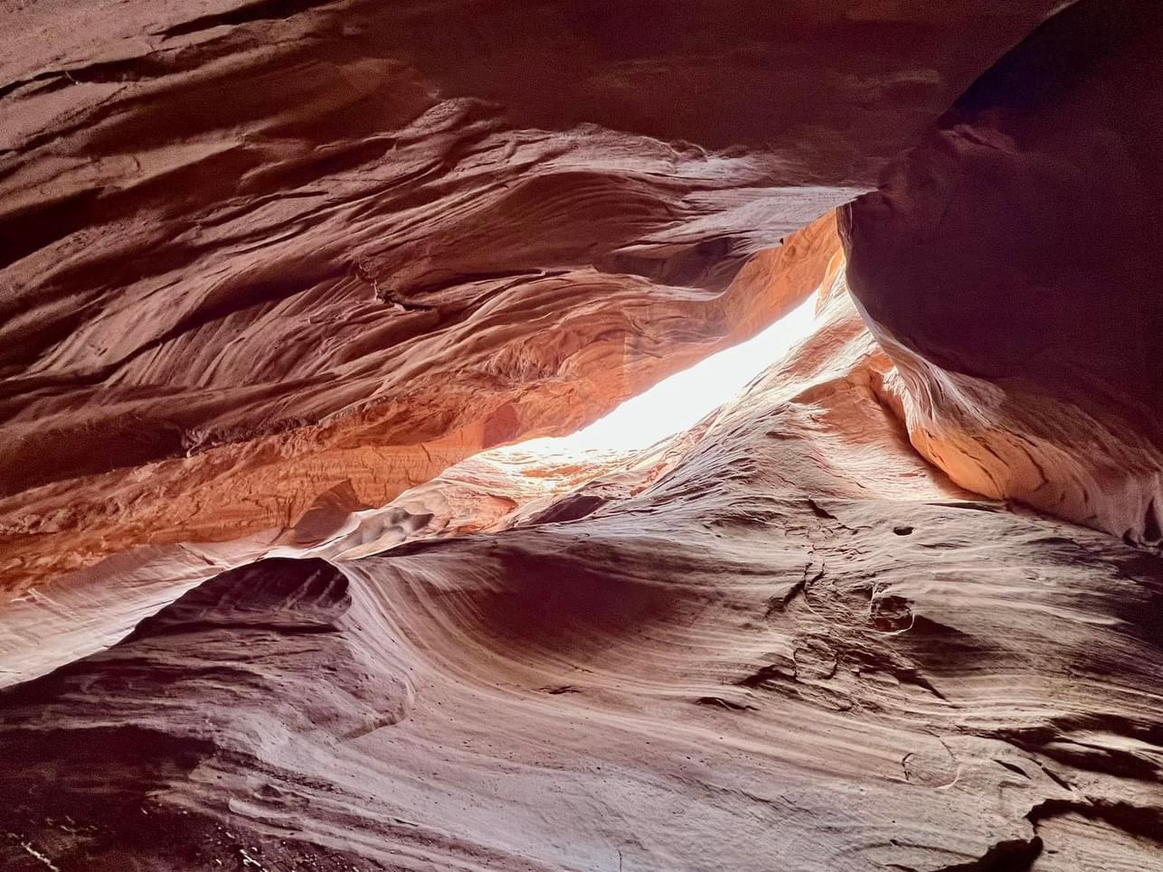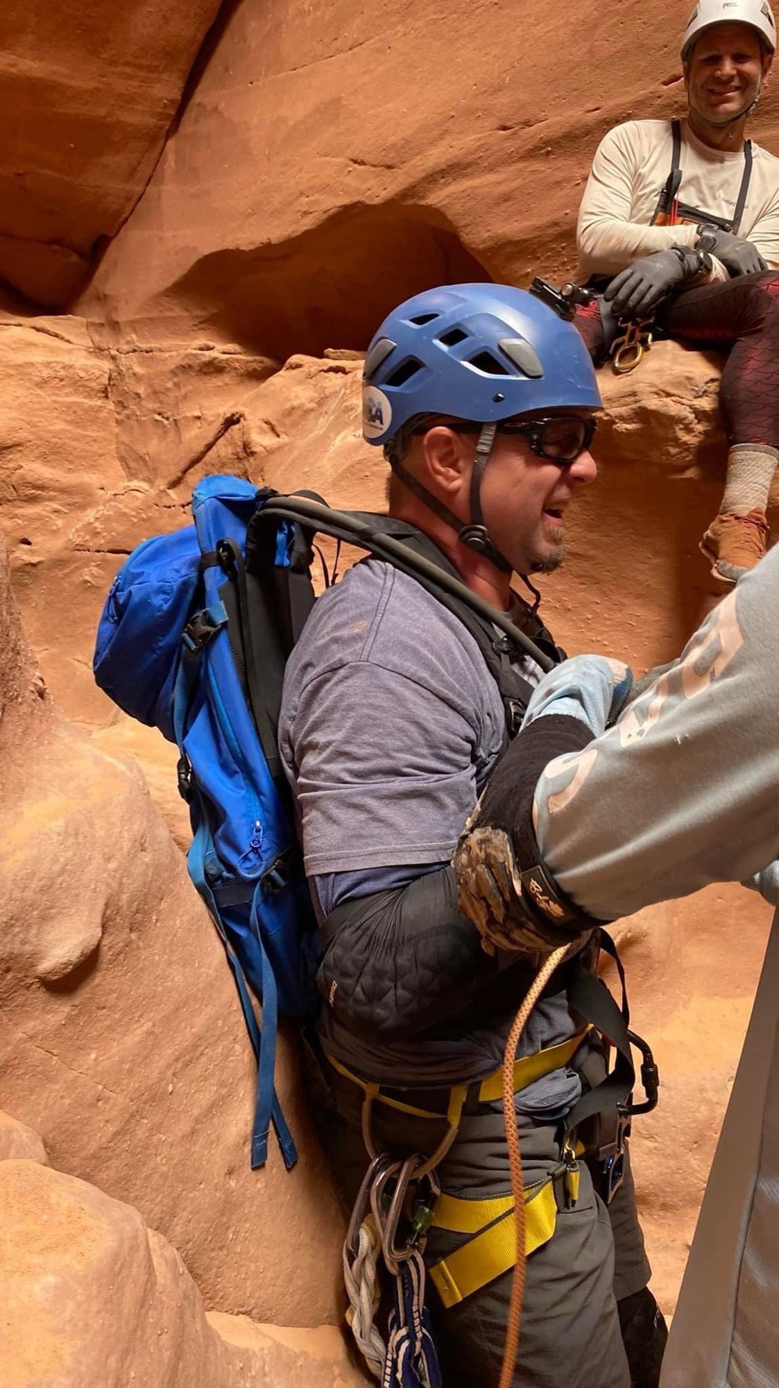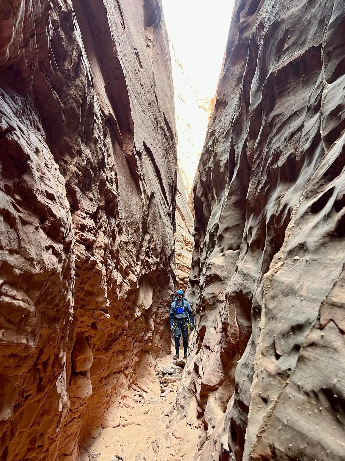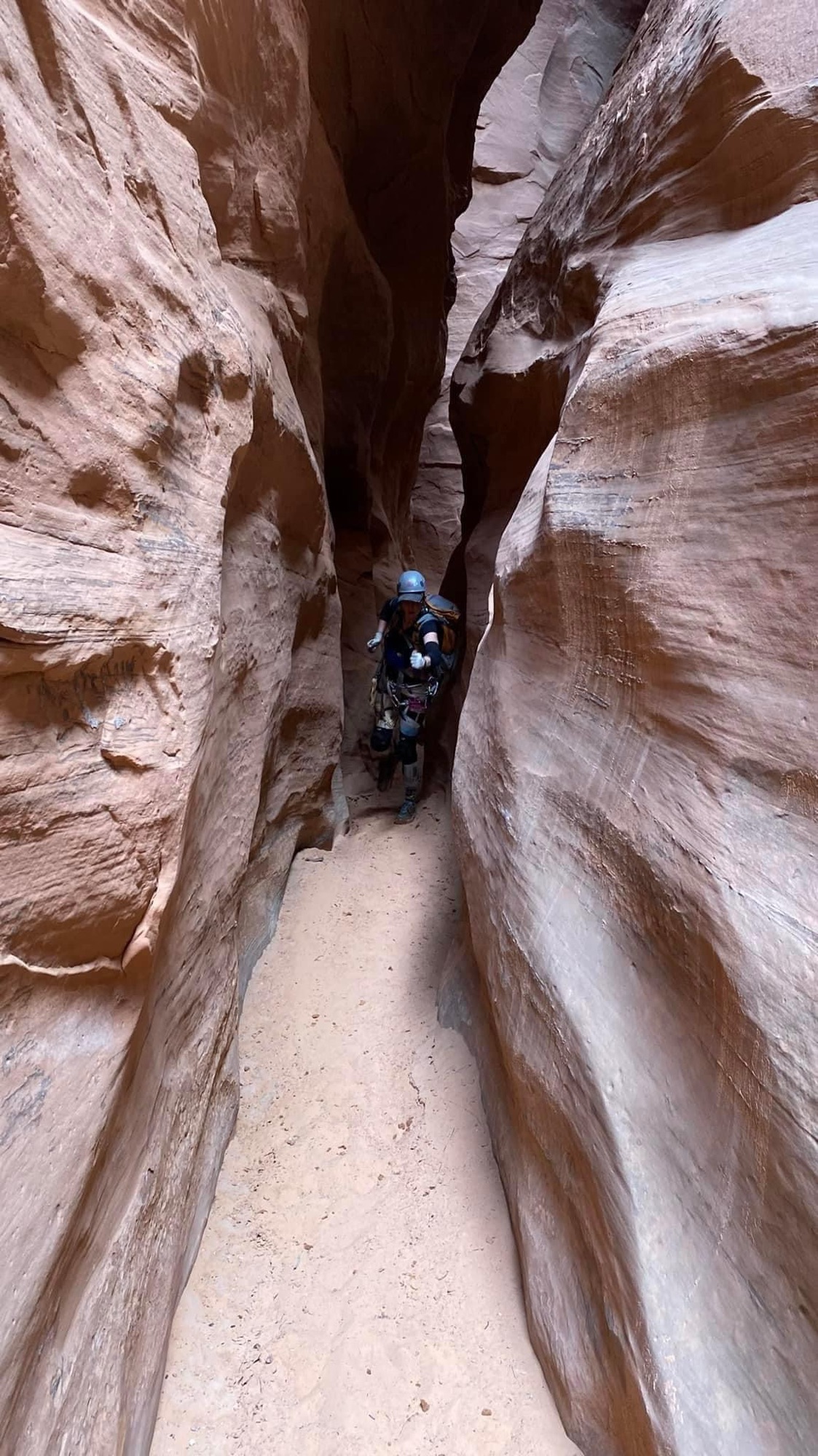 Our journey was punctuated by thrilling rappels, deep and dark narrows, and even a section reminiscent of the iconic “slanted slot” was something from a V8 commercial. With each step forward, we were met with new challenges and exhilarating experiences. At one point, as darkness enveloped us, I reached for my headlamp, illuminating the path ahead and adding an extra layer of adventure to our journey.