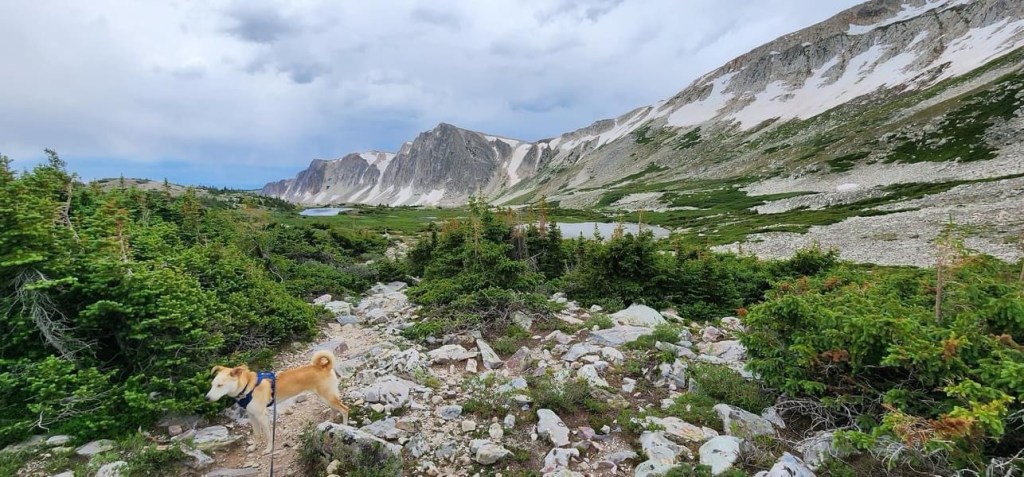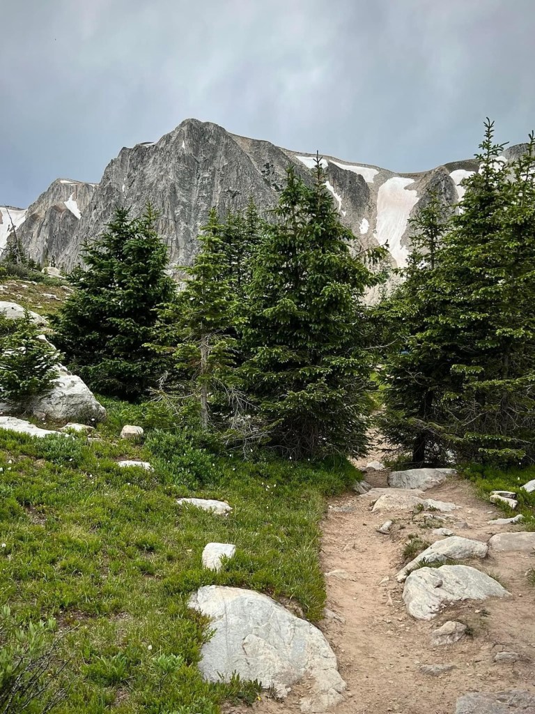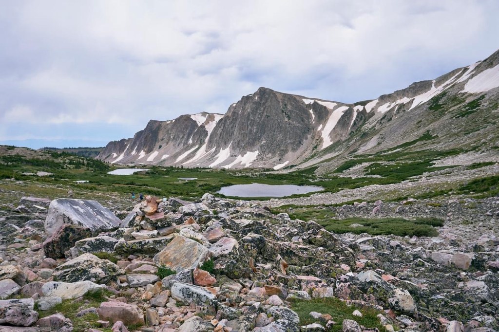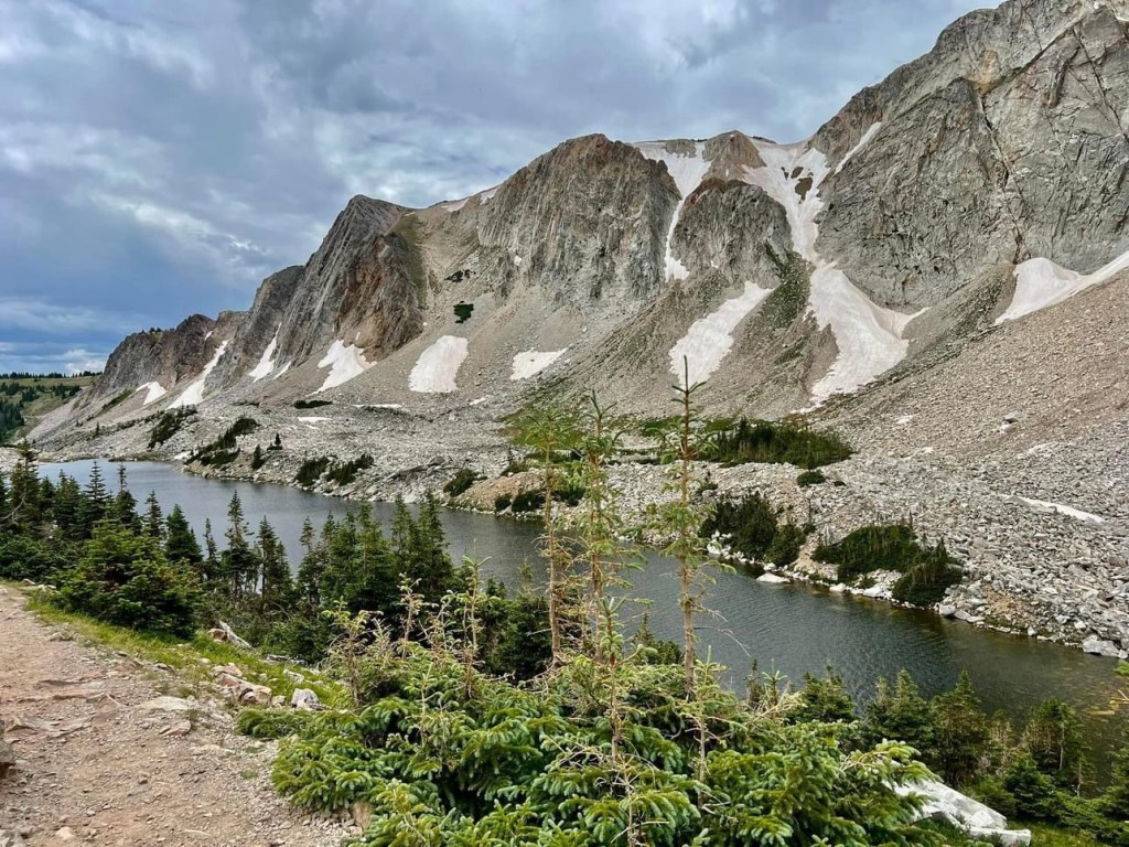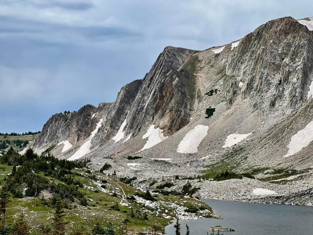 As the trail meandered through valleys and crossed babbling streams, we found ourselves ascending steep slopes, with panoramic views of the Snowy Range unfolding before us. Lookout Lake, nestled below towering cliffs, greeted us with its serene beauty, its elongated form mirrored by a series of small ponds above. Above it all, Medicine Bow Peak loomed majestically, its snow-capped summit reaching heights of 12,013 feet, a testament to the grandeur of the natural world.