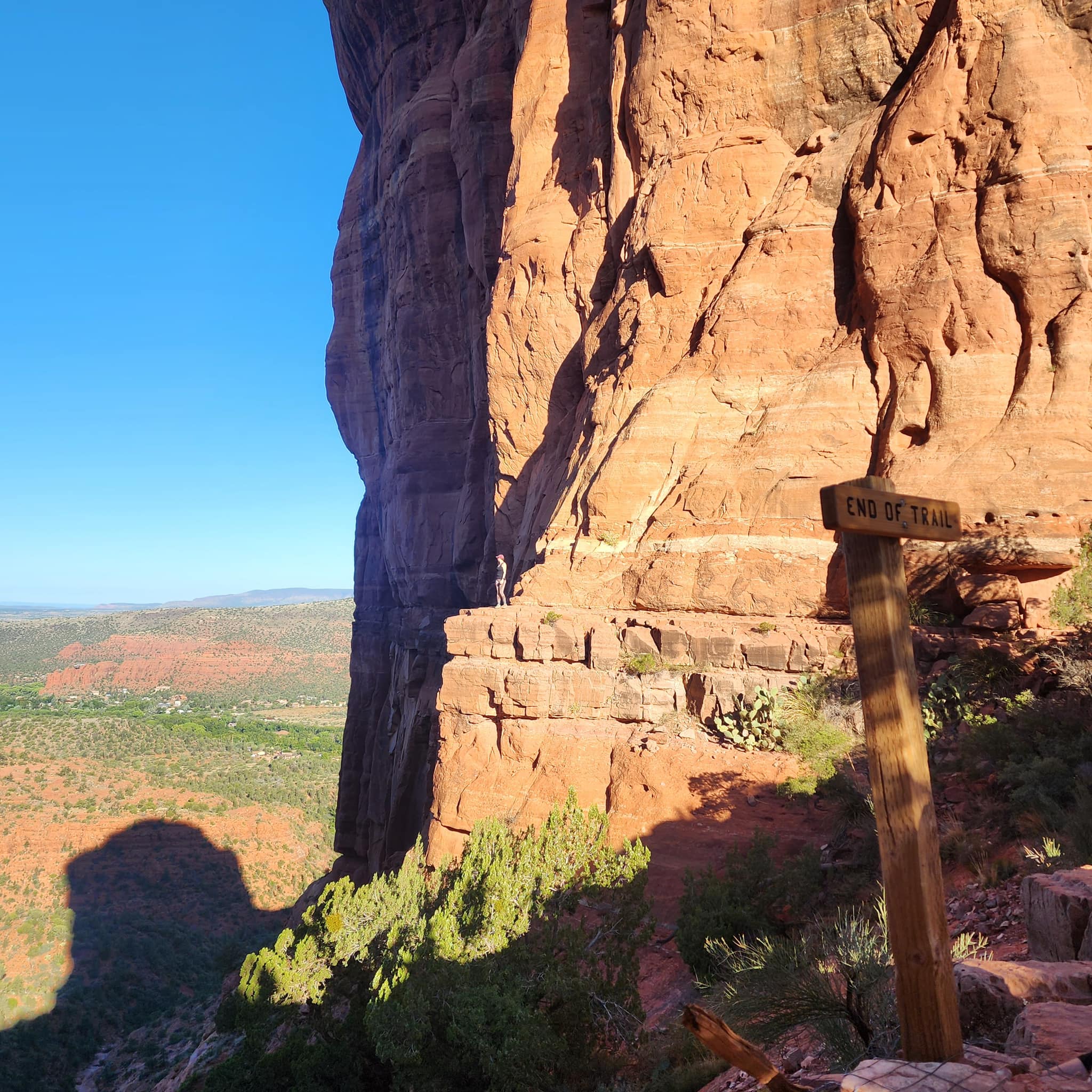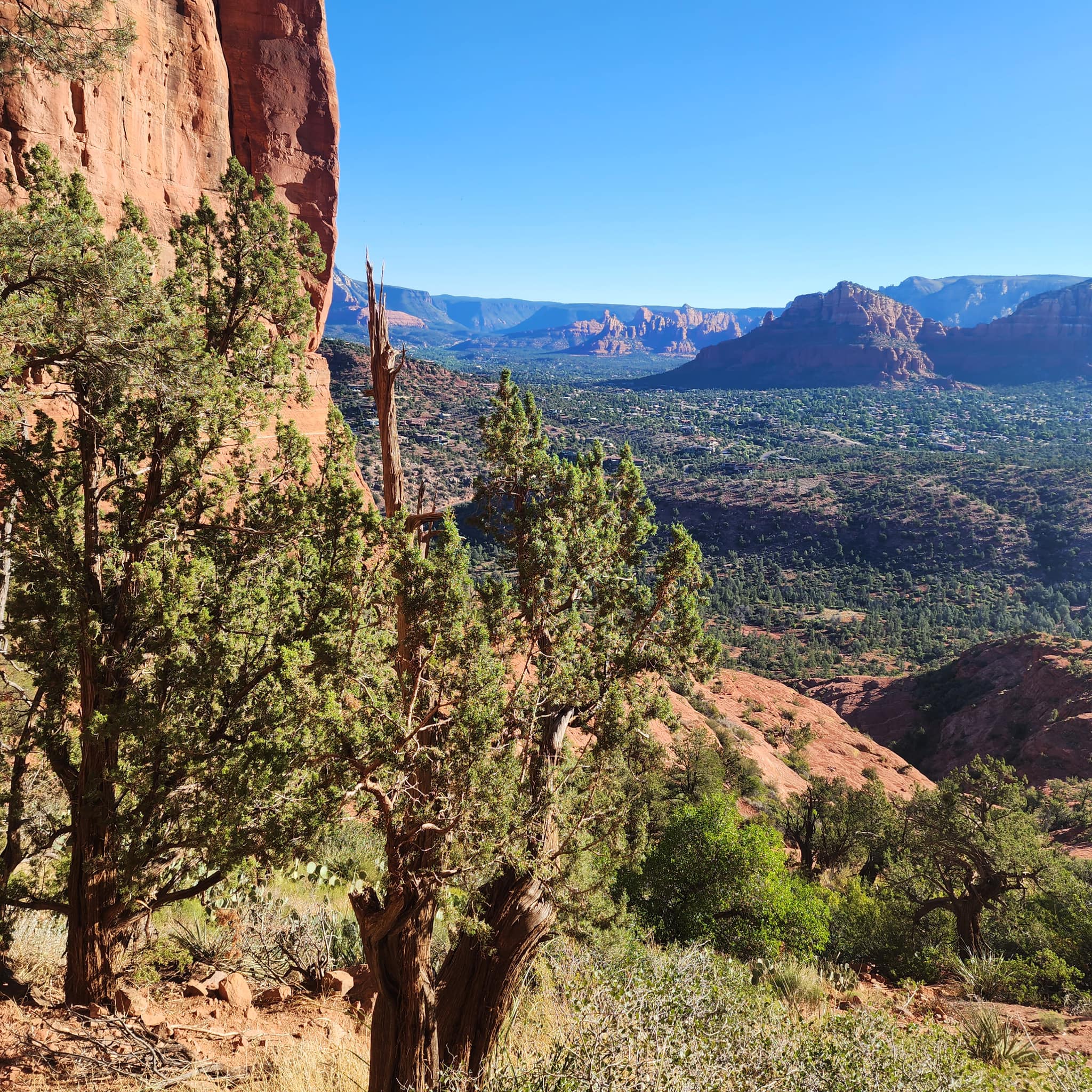 Sunlight bounced off the stone, deepening the reds and oranges, while juniper and cactus clung to ledges along the route. The trail opened into a series of sandstone shelves and overlooks near the top, each offering a slightly different perspective of Sedona’s red rock landscape.