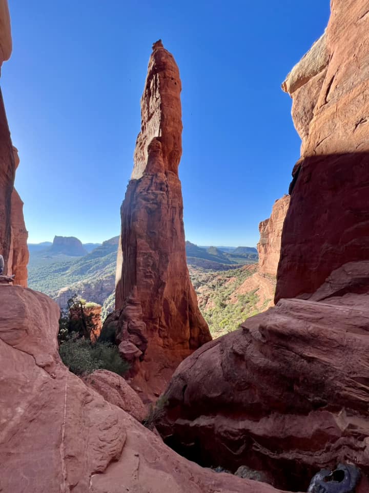 Feeling strong and making good time, Irene and I followed a semi-hidden path toward a striking, solitary rock spire rising from the surrounding formations. Nearby, we found one of Sedona’s well-known vortex sites—a place many hikers pause to snack, reflect, and soak in the views.