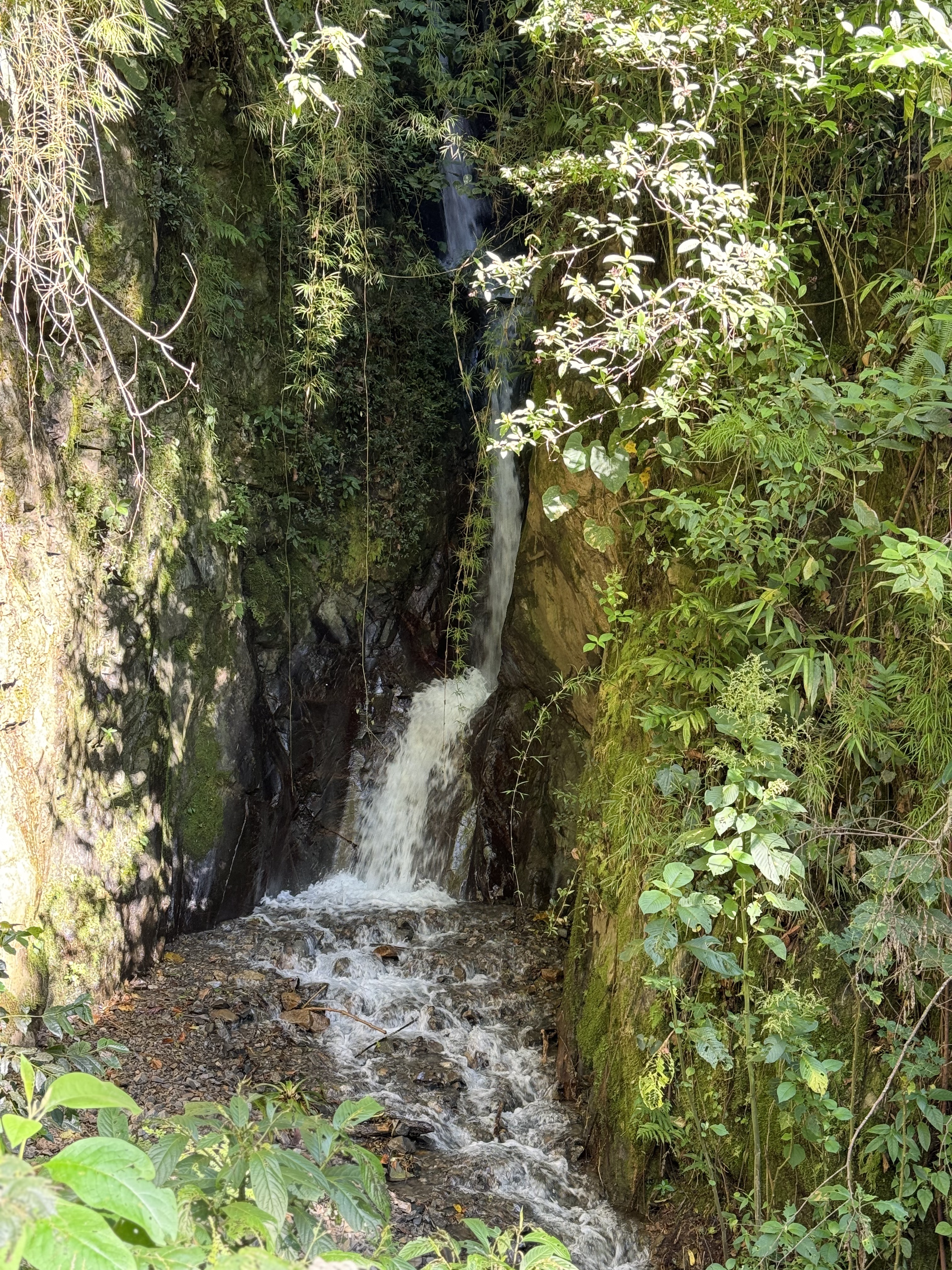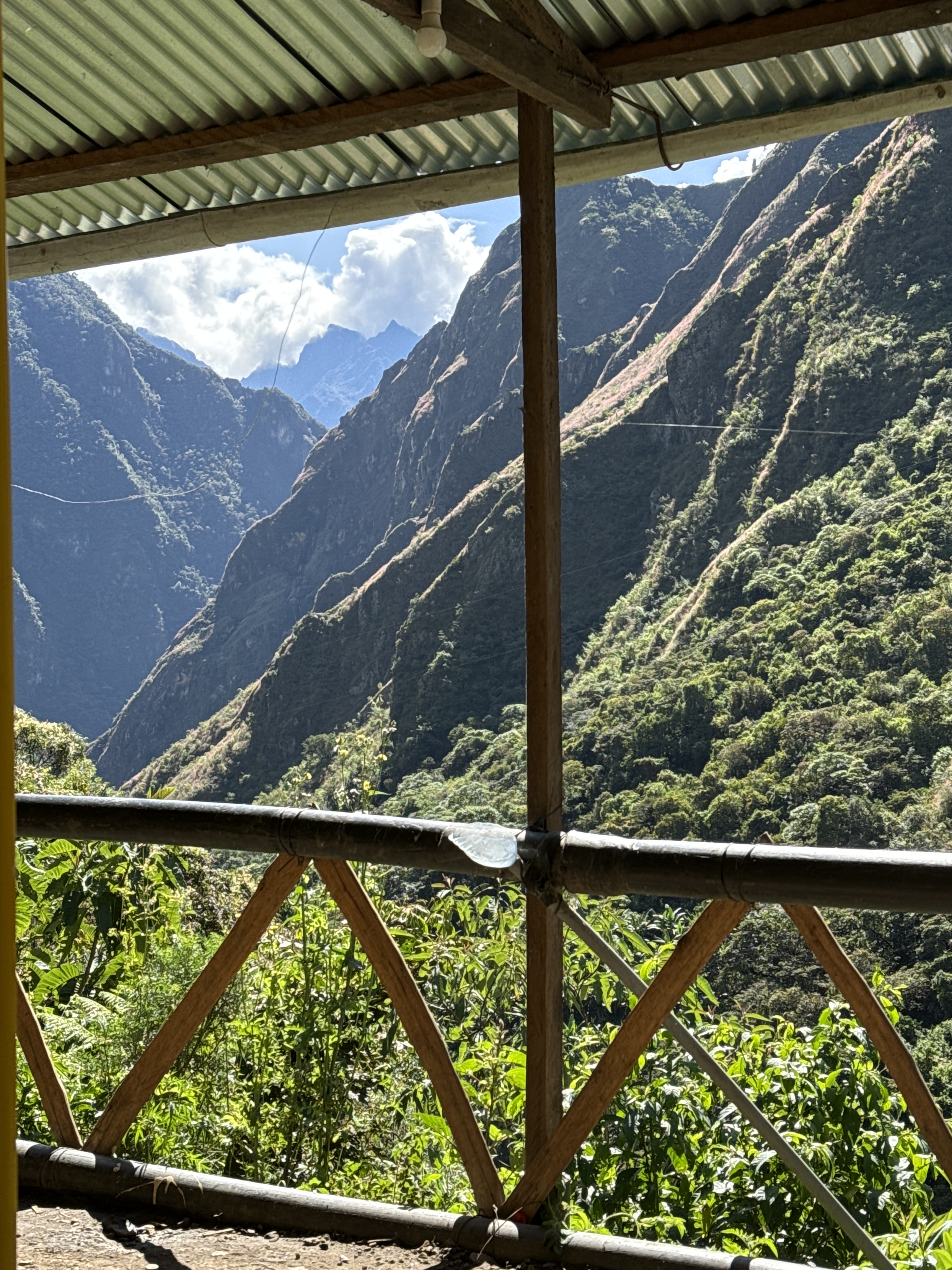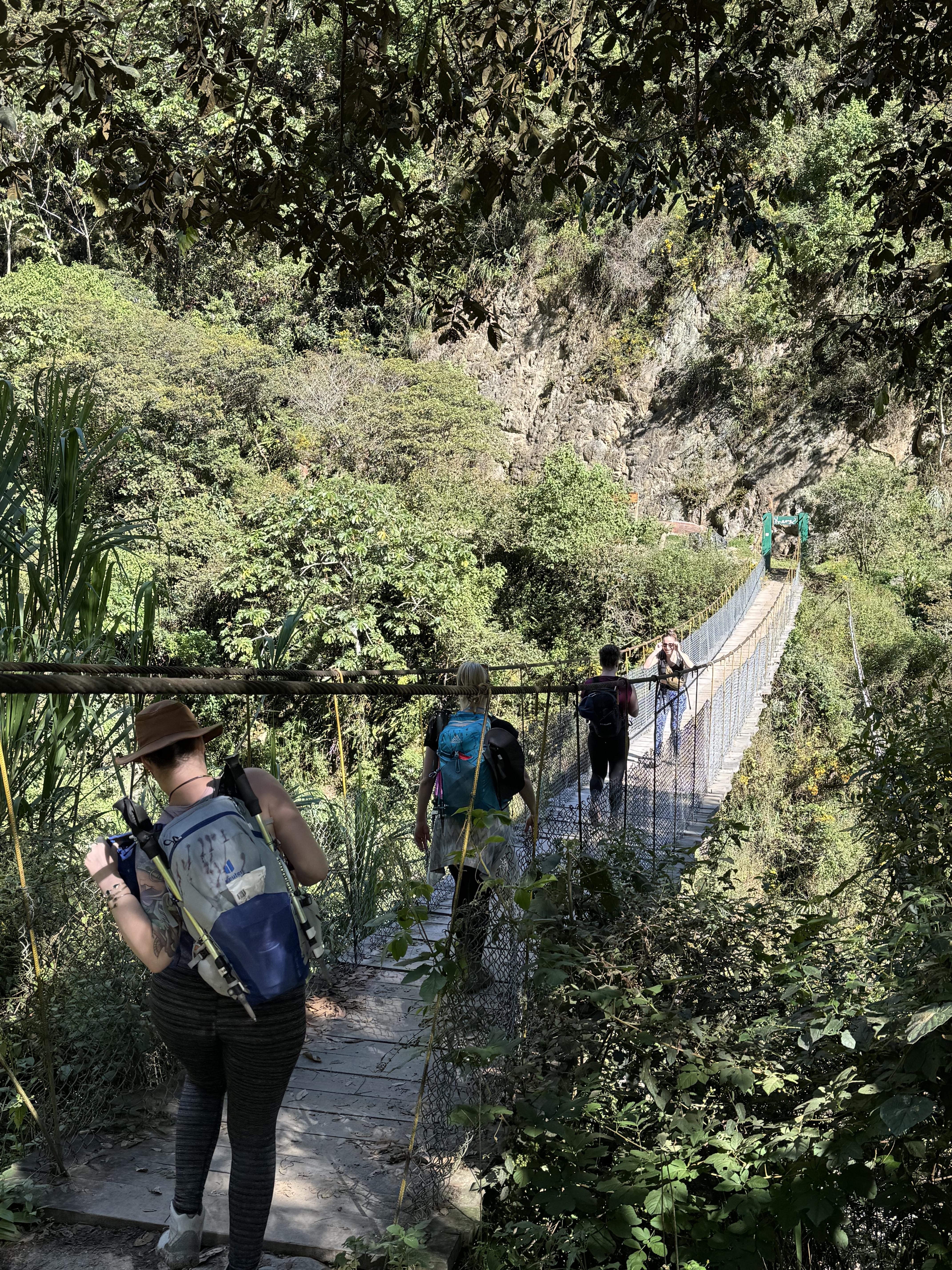 The soreness in my body and the looming time crunch made me reconsider tackling the final section of the Salkantay route. This stretch involved a punishing 2,624-foot ascent followed by a 3,000-foot descent over 5.5 hours. If we dawdled, we risked missing our train, forcing us to trek an additional 6-7 miles down the railroad to Aguas Calientes. Given the sharp knee pain I’d endured two days prior and a toenail that was barely hanging on, I decided to take a taxi and meet the group for lunch at Ahobamba Restaurant. The taxi dropped off me and a few others at a crossing bridge that felt like a scene from an Indiana Jones movie, but the mountain vistas breathtaking. As I waited for Bill, Greg, and our guide, Porfi, to arrive, I was entranced by the butterflies that fluttered around us.