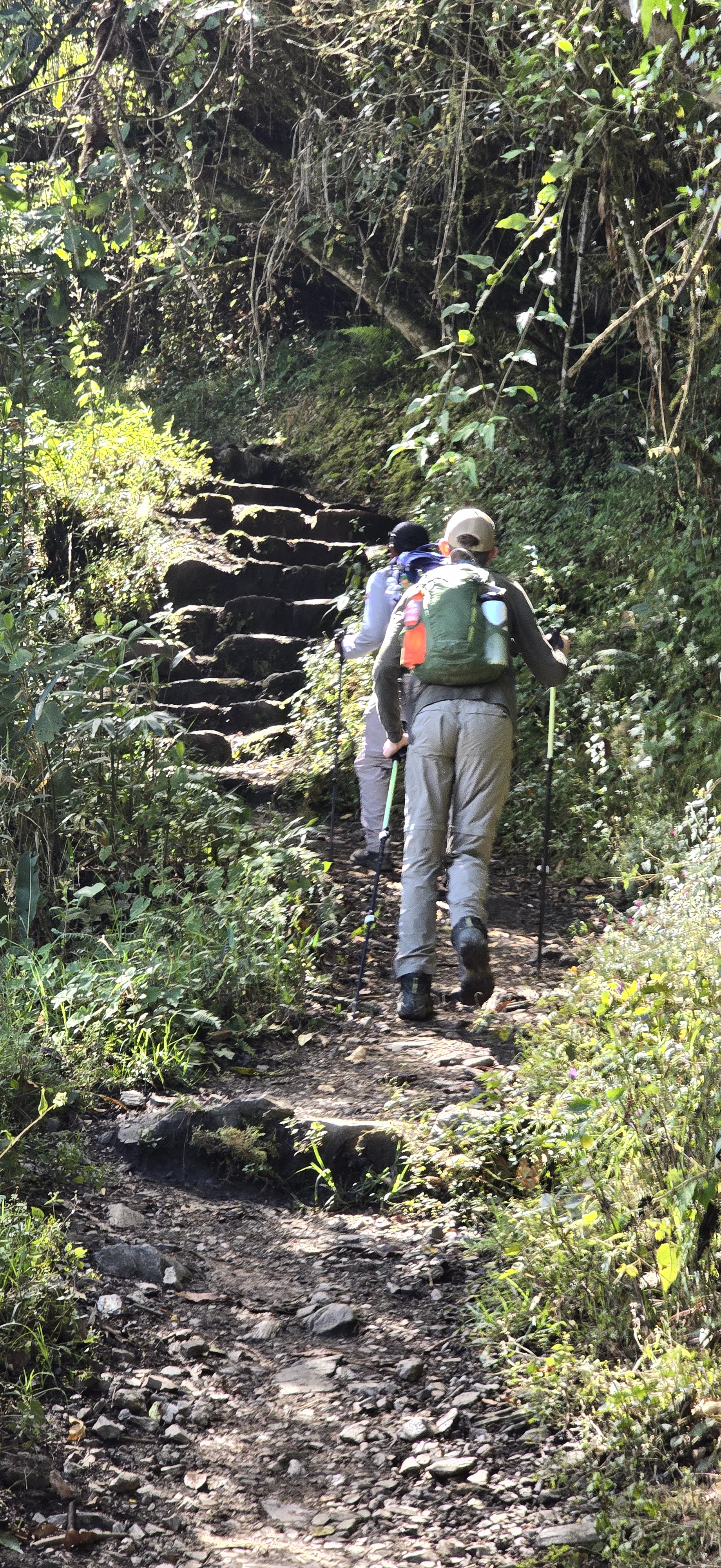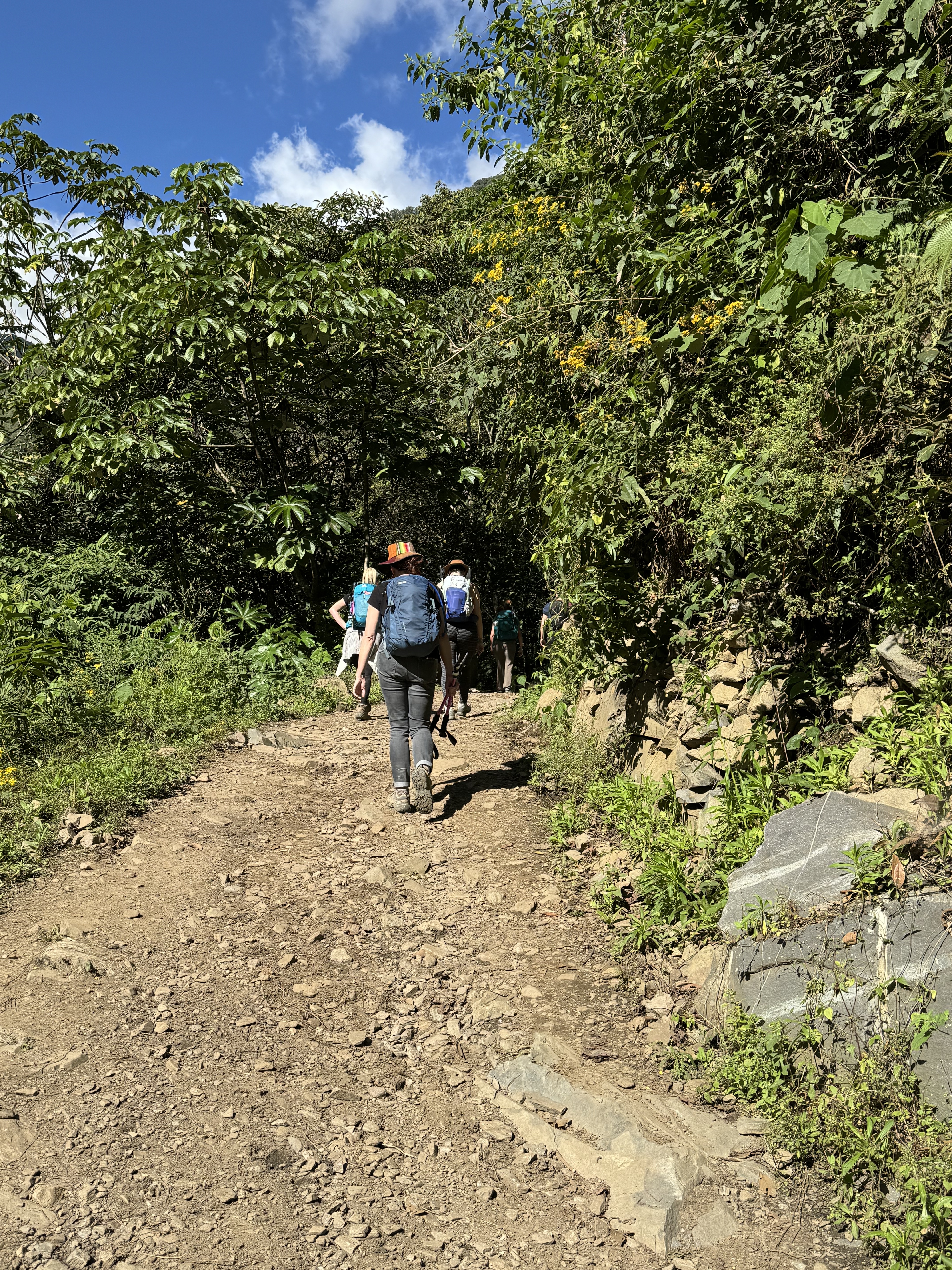 Bill, Greg, and Porfi, departed the Jungle Camp later than planned but fueled by a hearty breakfast, they were ready to conquer the day’s formidable challenge. Bill indicated it would be the most grueling section of the hike. The Salkantay Trek to Llactapata follows a segment of an ancient Inca trail. Near the summit, the path transforms into an unending series of stone steps. After battling through the dense jungle, they emerged at Llactapata, greeted by awe-inspiring views of the Santa Teresa valley and their first glimpse of Machu Picchu. They paused to explore an Inca archaeological site, delving into the mysteries of this ancient culture. Then, with time pressing, they embarked on a rapid, steep descent to the restaurant. Practically sprinting down the hill, they arrived just in time, greeted by our group’s enthusiastic cheers. With barely 30 minutes for lunch, they hastily refueled before we all headed to Hidroeléctrica to catch our train.