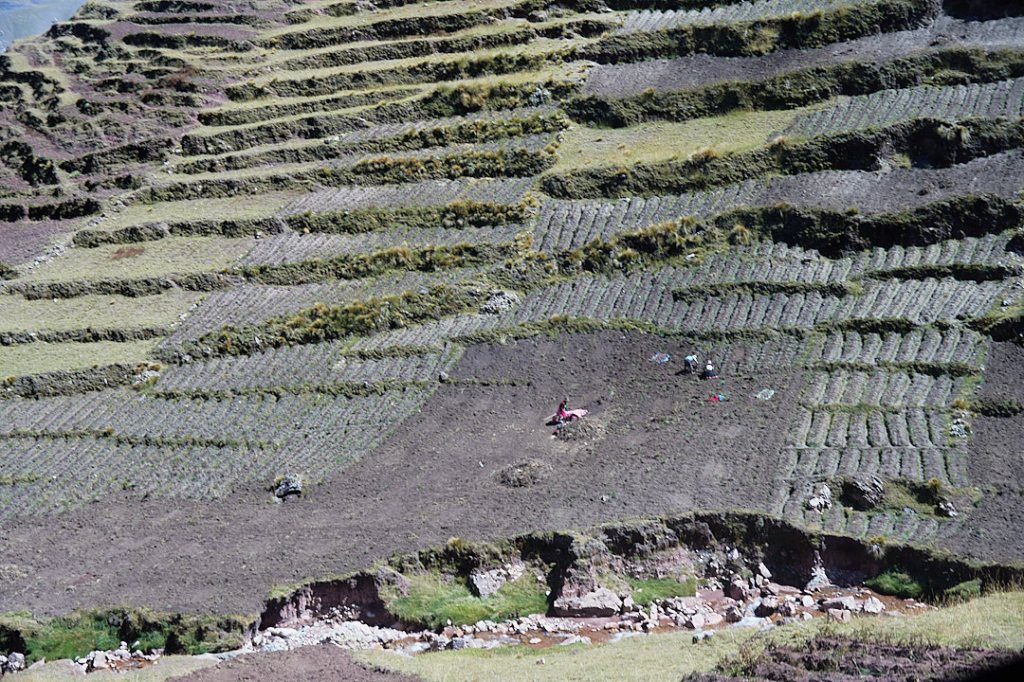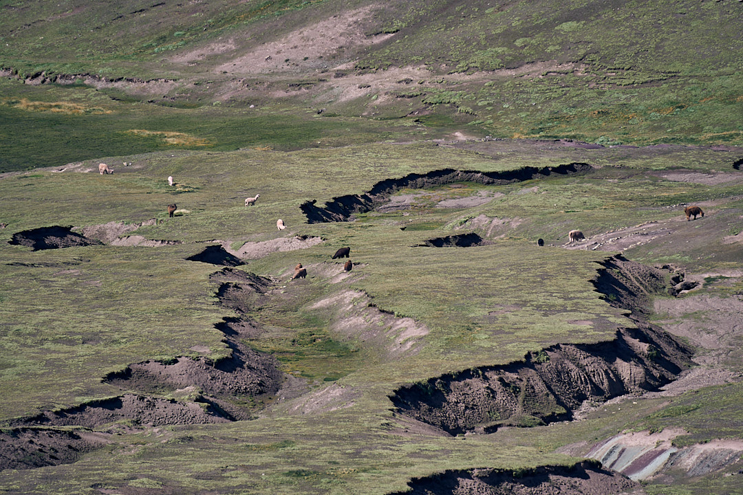 Palccoyo is about a 3-3.5 hour drive from Cusco, necessitating an early start. At 4:00 am, after grabbing some coca tea from the lobby, we were picked up by our van. A 1.5-hour drive brought us to a restaurant where we enjoyed a freshly made breakfast buffet. With our bellies full, we continued deeper into the Peruvian countryside. As we ascended higher into the mountains, we couldn’t help but laugh through the rough, bumpy roads as our driver skillfully navigated the winding paths. The scenic drive featured numerous herds of alpacas, llamas and sheep, and we saw farmers harvesting potatoes and grass on the mountain terraces.