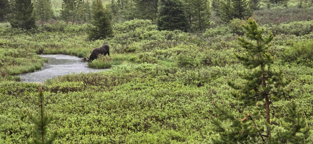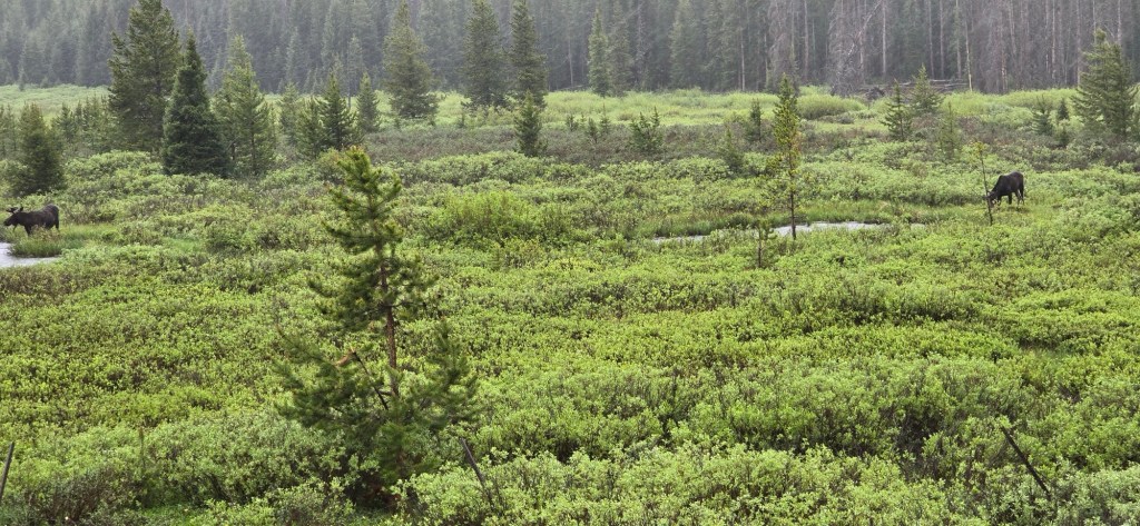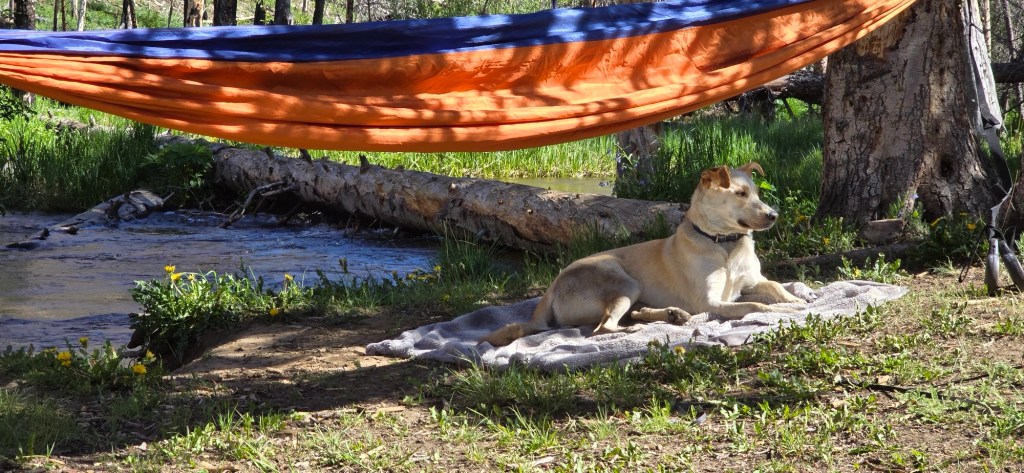 The next morning, Bill and the dogs had a hearty breakfast before setting out for a fishing excursion at the lake. Bill caught a fish! Along Poudre Canyon, just beyond Cameron Pass, he saw four more moose enjoying the day—a magnificent sight. After their outing, they returned to camp, where I found the dogs resting in the shade and Bill lounging in the hammock, completely relaxed.