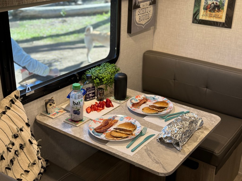 The setting was breathtaking. I sat by the river, listening to the soothing sounds of nature. I watched hummingbirds dart by and a woodpecker tapping away at a tree. As the day cooled off, we gathered around the fire, enjoying dinner and each other’s company. When the evening rain began, we cozied up in our spots, drifting off to the comforting sound of raindrops.